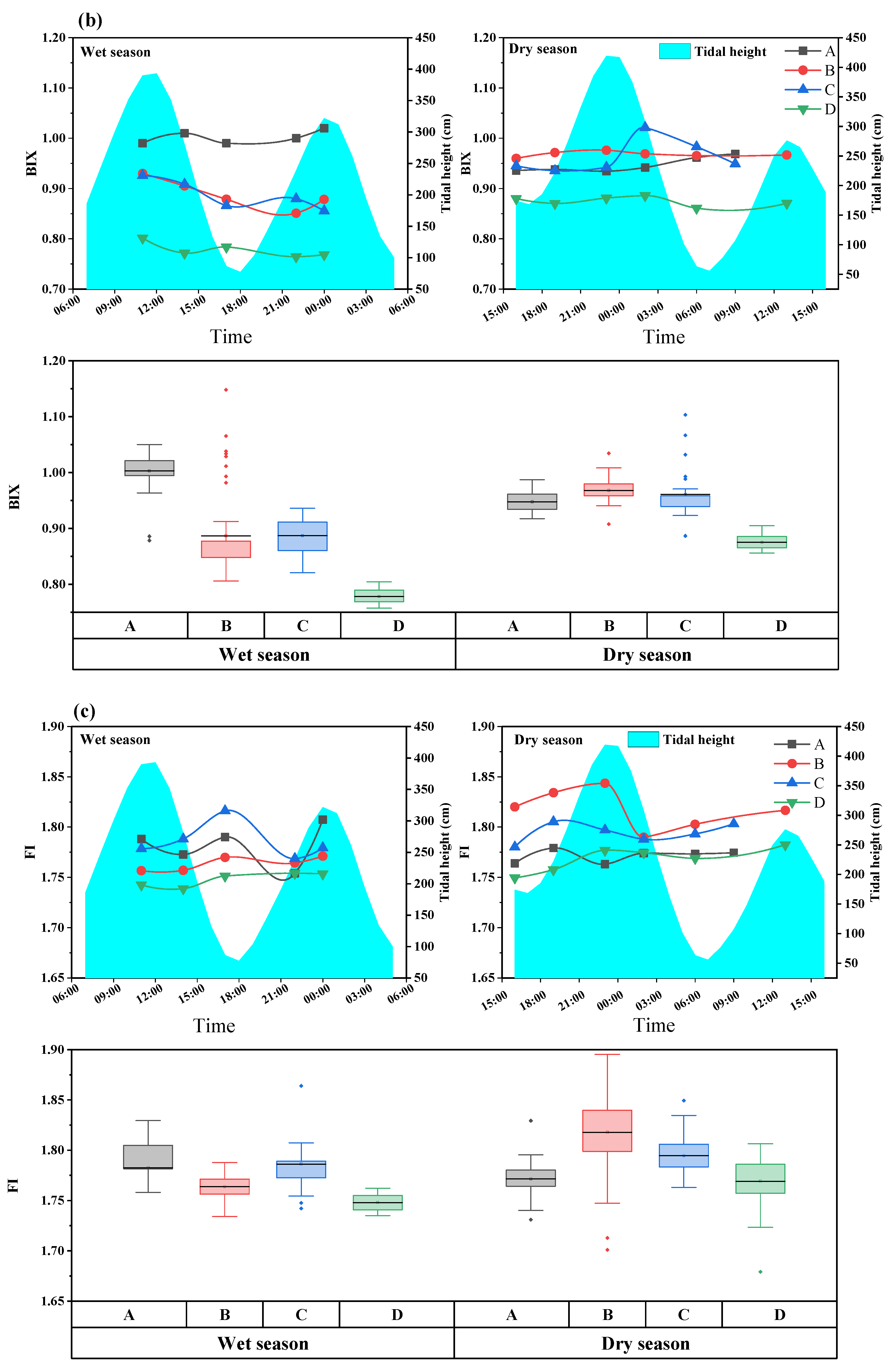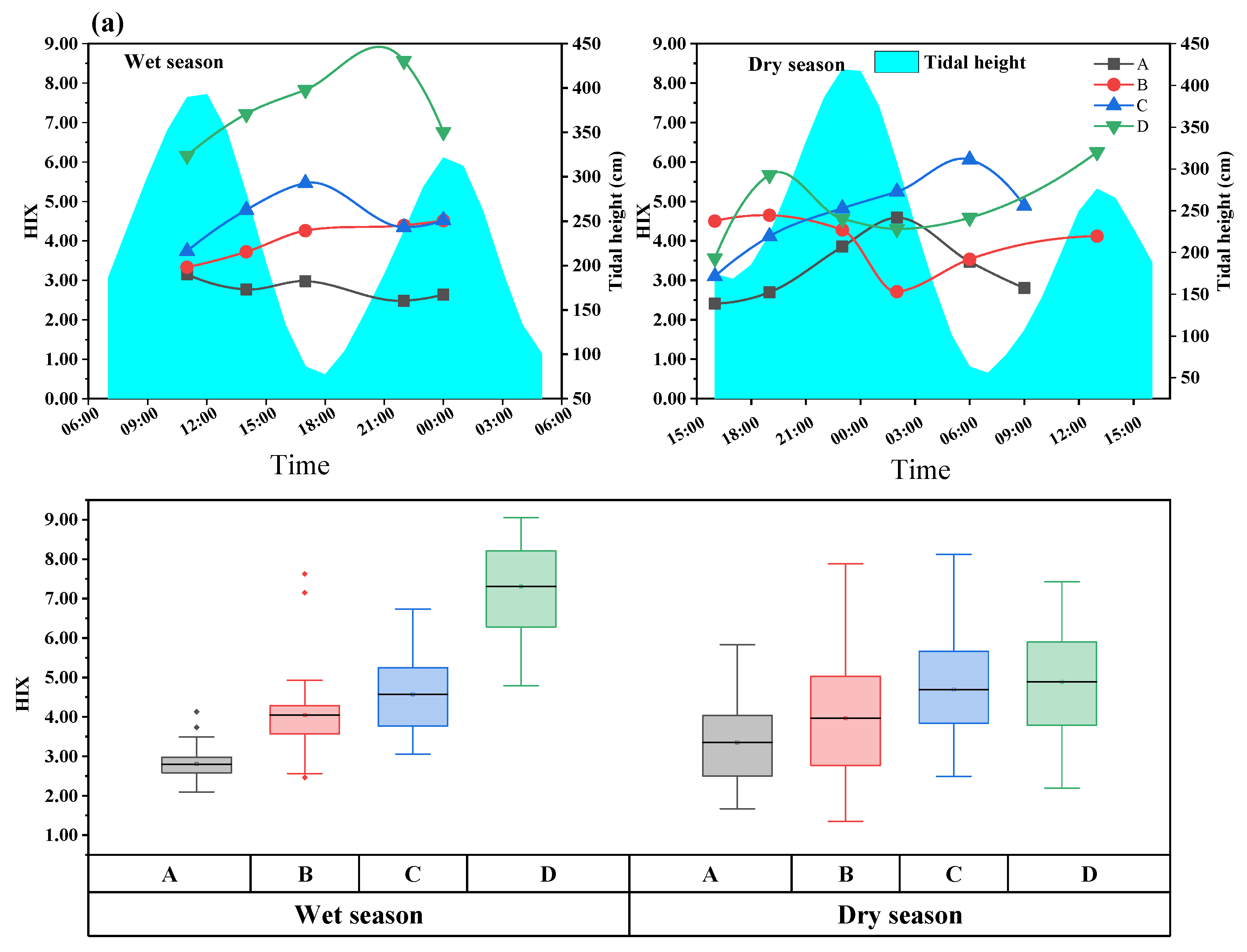 3.4. Characteristics of HIX, BIX, and FI Under Tidal Dynamic Changes