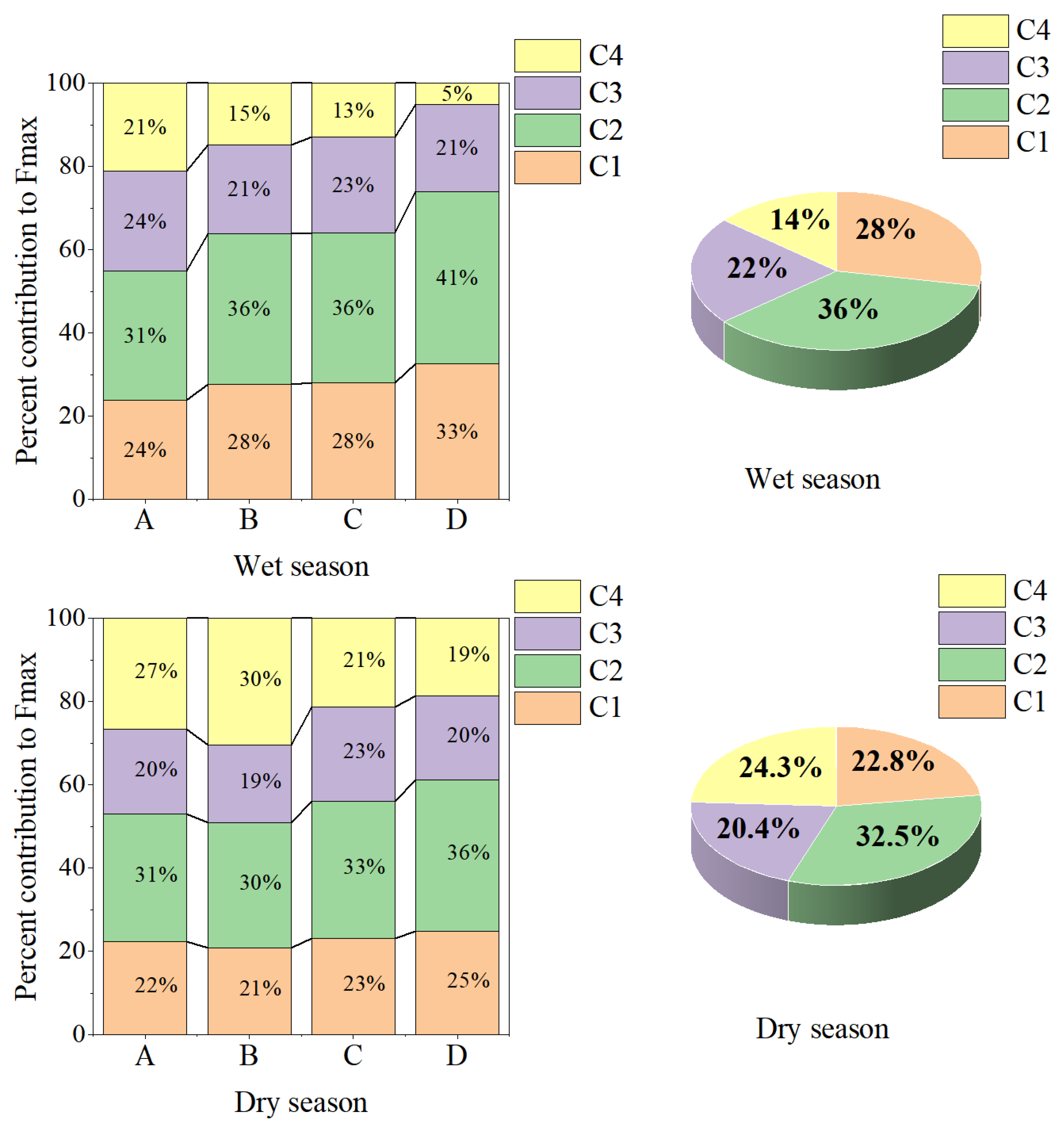 | Wet season | A | 26.14 ± 9.31 | 29.55 ± 0.75 | 23.90 ± 0.39 | 8.09 ± 0.20 |