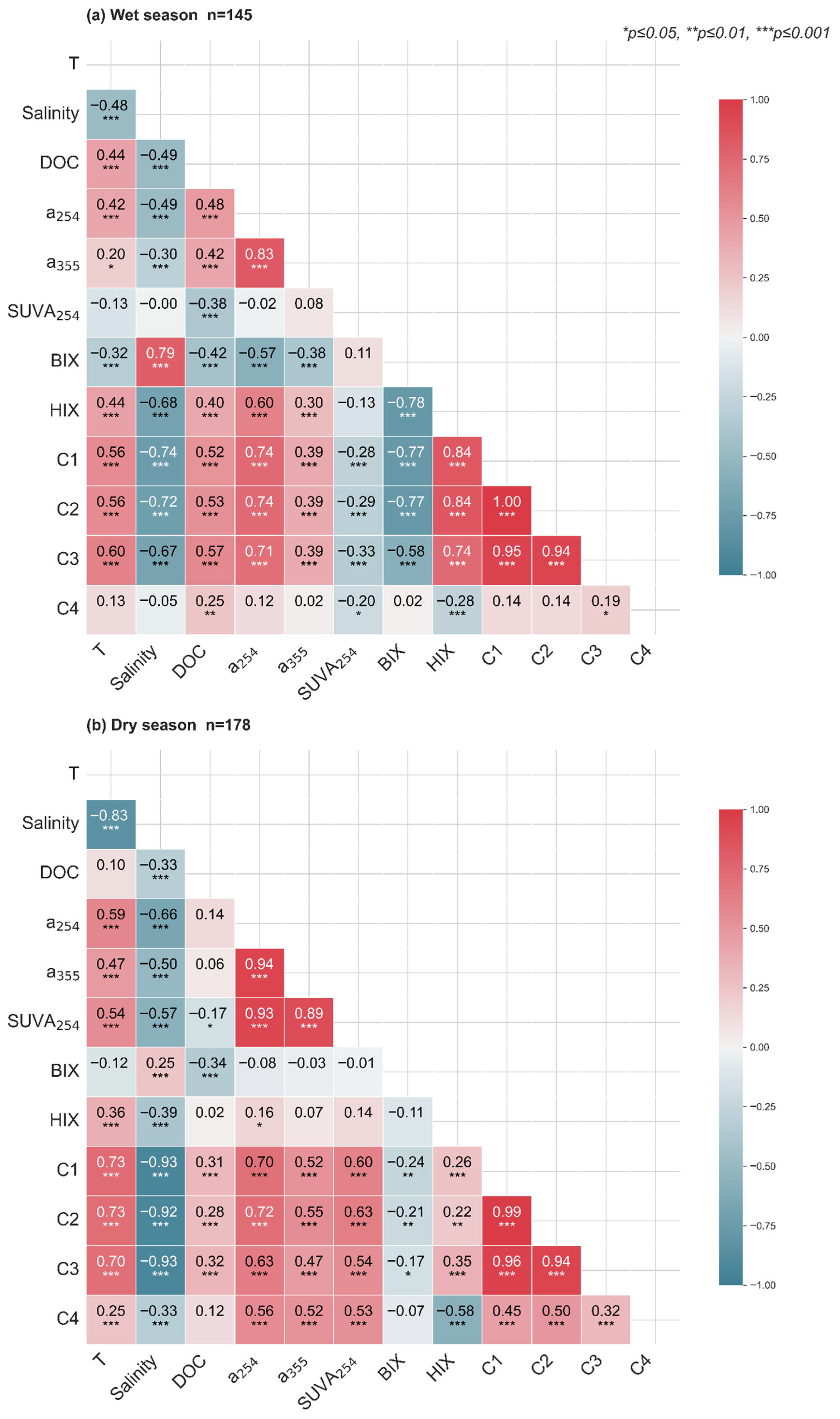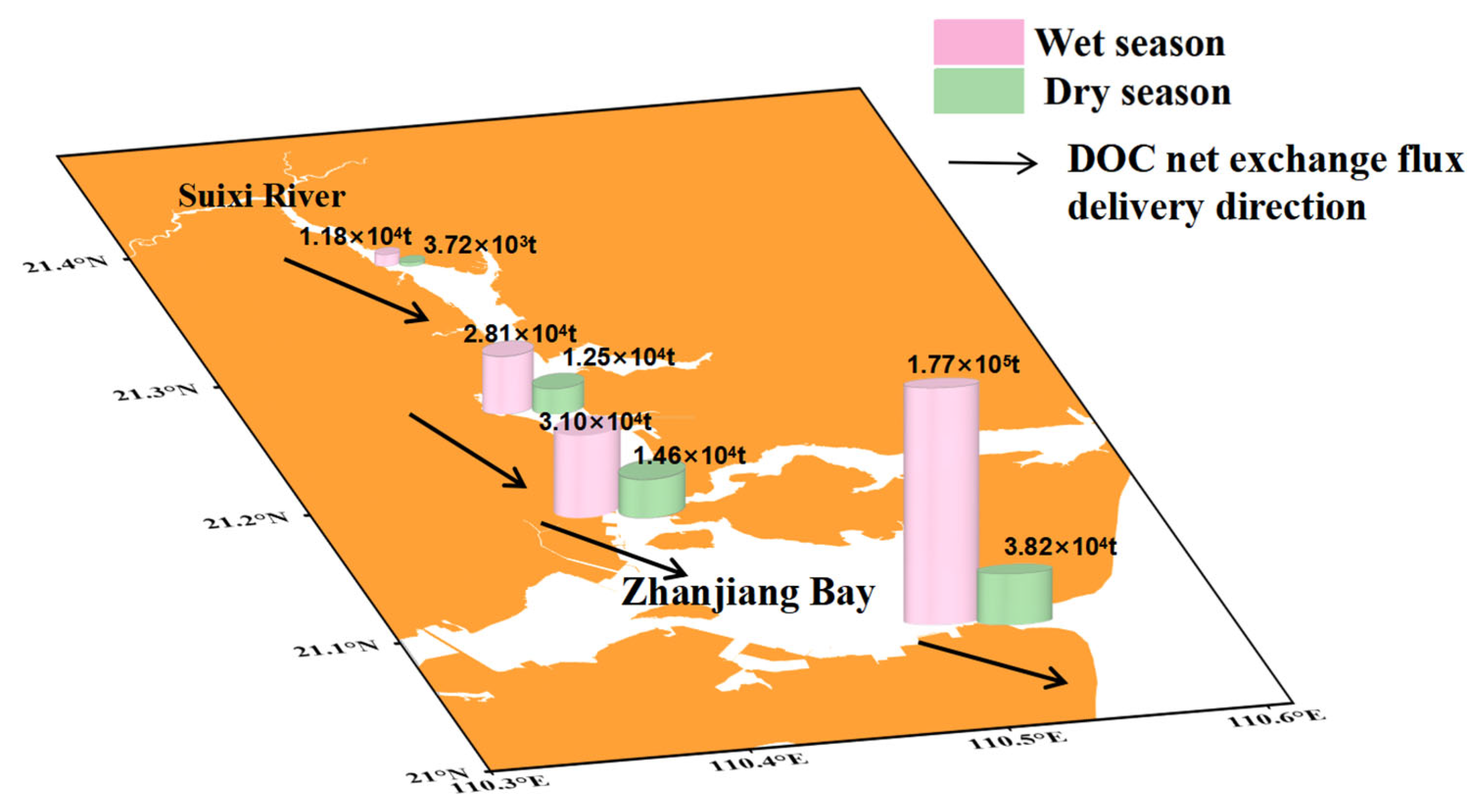 - Liu, P.; Jiang, K.; Tan, Q.; Chen, F.; Jia, R.; Wang, C. Seasonal dynamics of dissolved organic matter in a small tropical estuary-coastal bay continuum: Distribution, transformation, flux, and global perspectives. Front. Mar. Sci. 2025, 11, 1511427. [Google Scholar] [CrossRef]