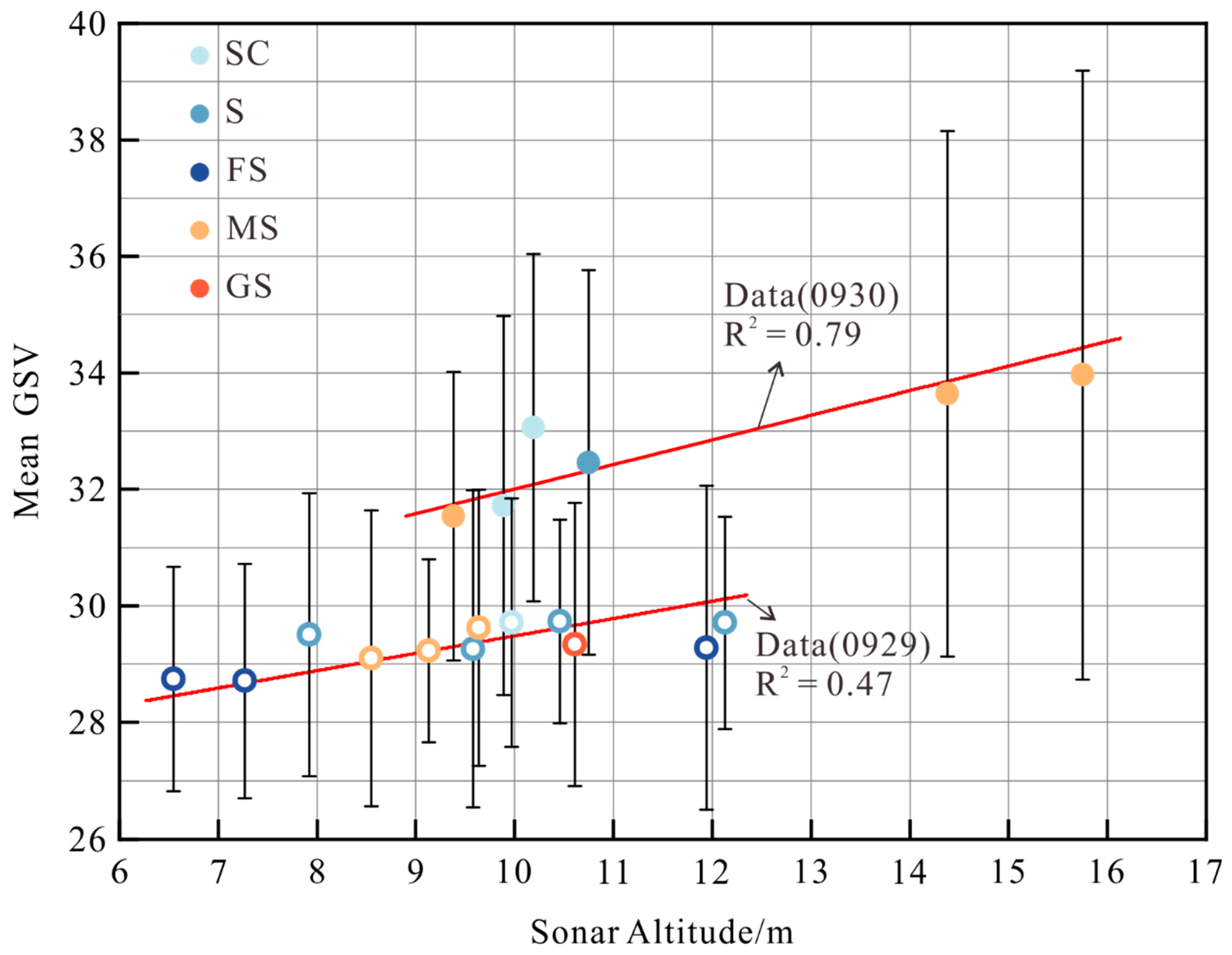3.2. Correlation Between Mean GSV and Sonar Altitude