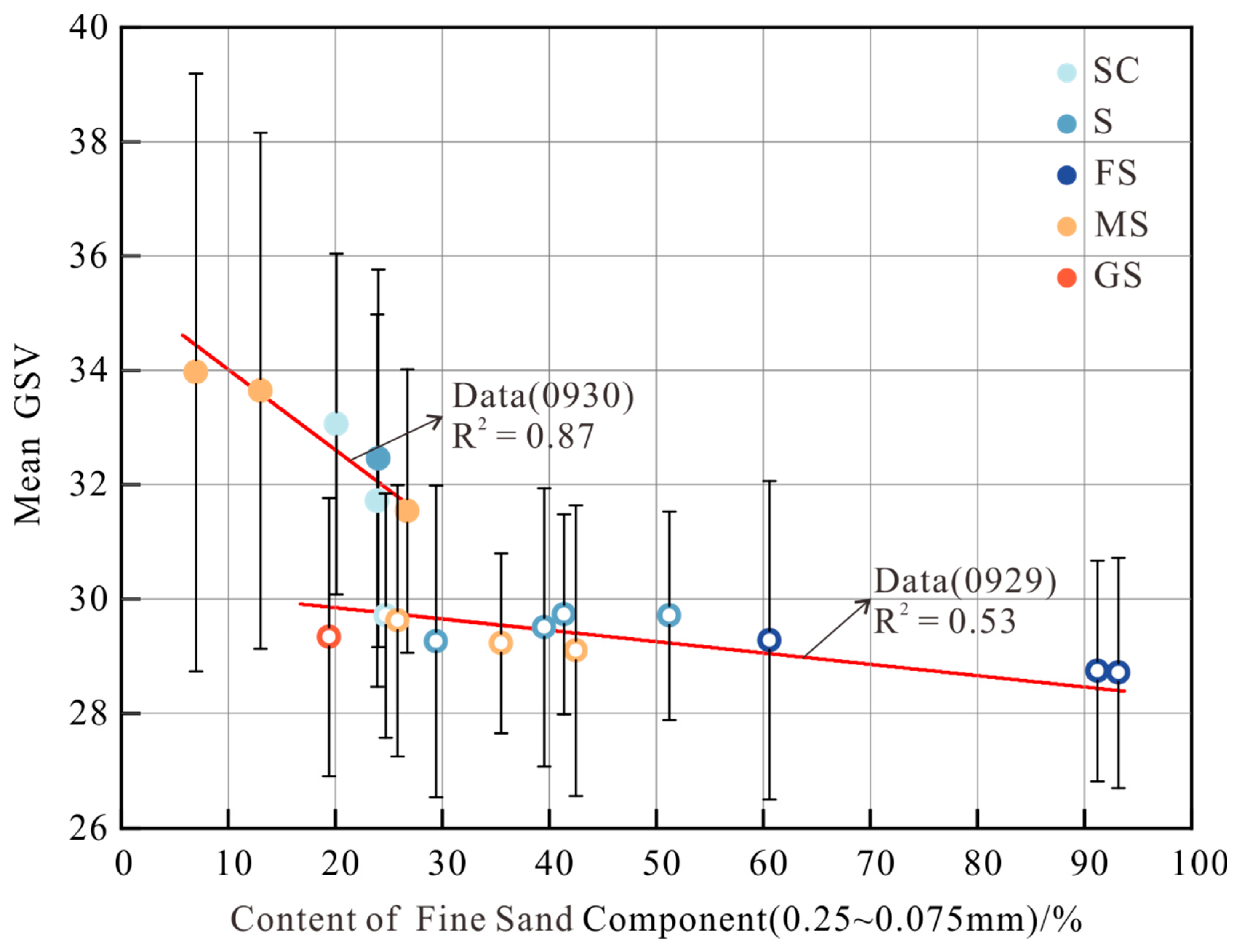 3.3. Correlation Analysis Between Mean GSV and Sediment Grain Size Parameters