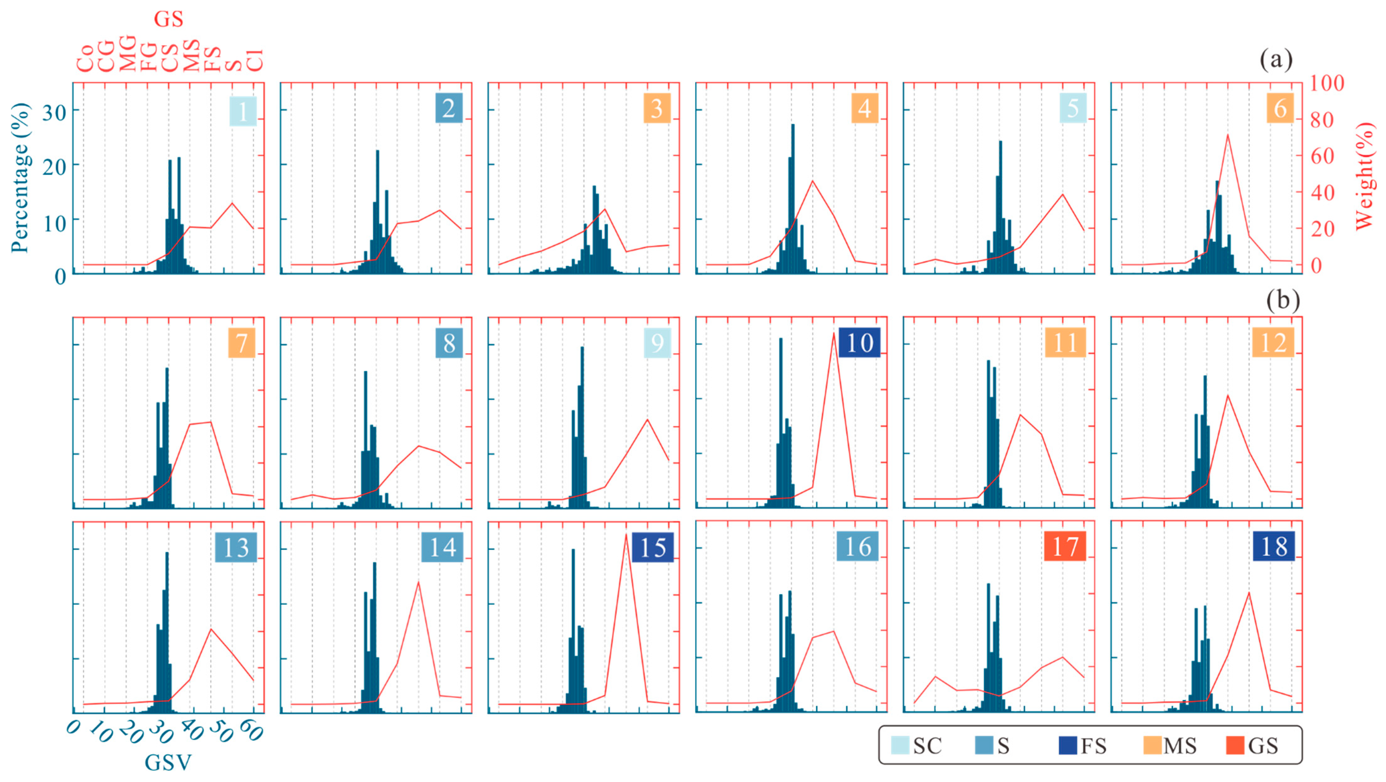 - Lü, W. Study on Grain Size Characteristics of Sediments from Different Marine Environments. Master’s Thesis, First Institute of Oceanography, Qingdao, China, 2017. [Google Scholar]