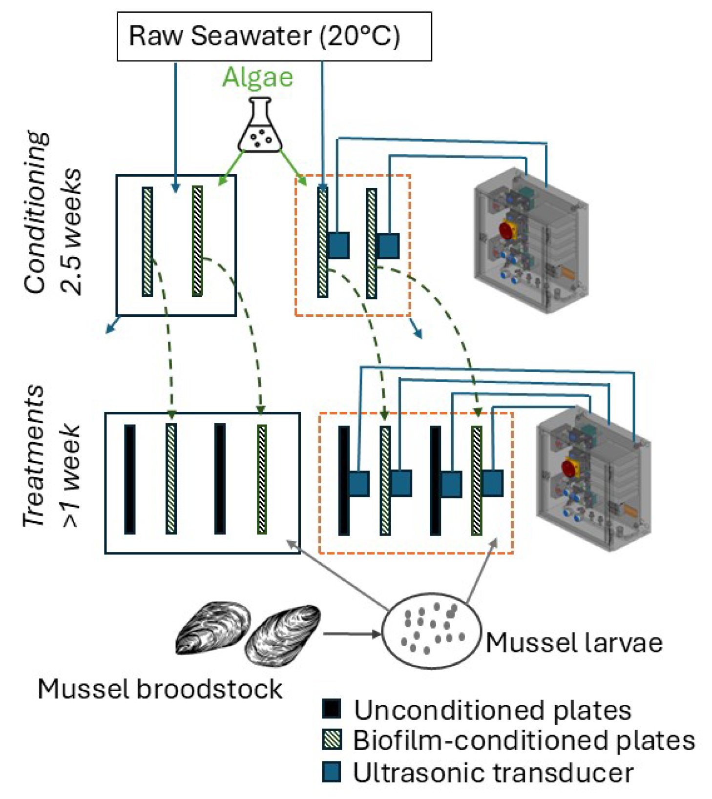 Capelle, J.J.; Teng, S.; Dubbeldam, M. Ultrasonic Treatment Suppresses Biofilm-Mediated Larval Settlement of Mussels: A Pilot Study. J. Mar. Sci. Eng. 2026, 14, 136. https://doi.org/10.3390/jmse14020136