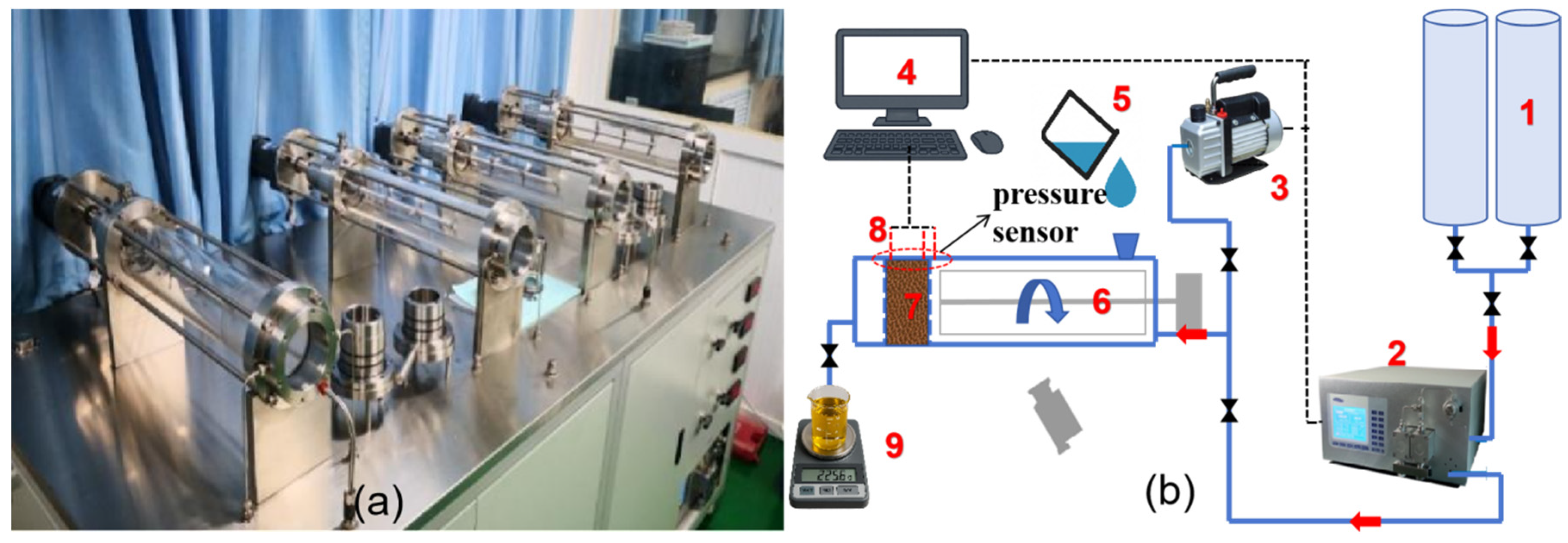 - Experimental fluid (water or oil) was injected into the sand-mixing unit to check for leaks. The stirrer was then switched on, and the premixed sand was added through the sand-injection port until the vessel was filled, after which the port was closed. The system was evacuated for 15 min.
