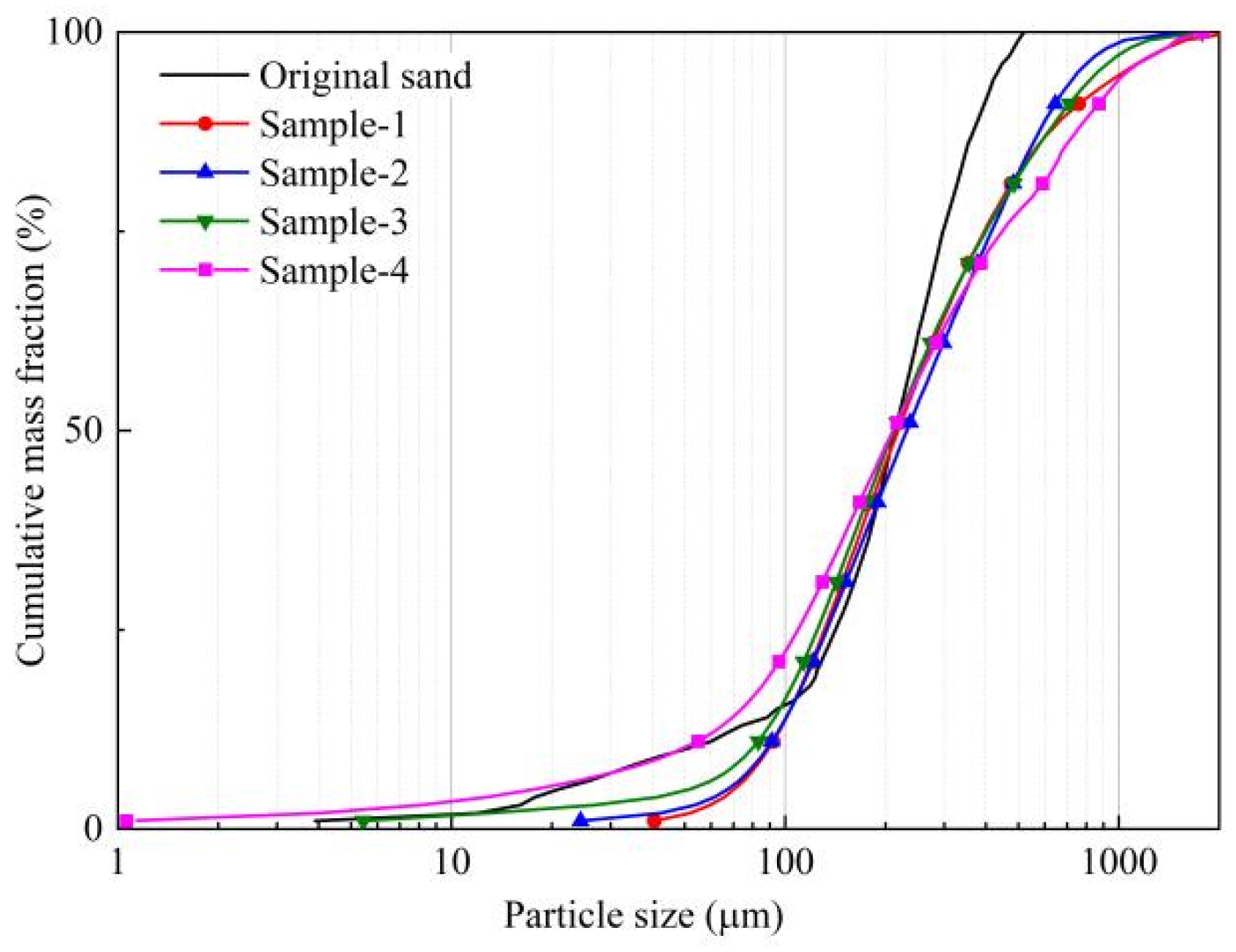 - According to the blending scheme, 200 g of synthetic reservoir sand was prepared and thoroughly mixed. A laser particle-size analyzer was used to ensure that the median grain size and grain-size distribution curve matched the target reservoir-sand characteristics, thereby ensuring the validity of the experimental data.