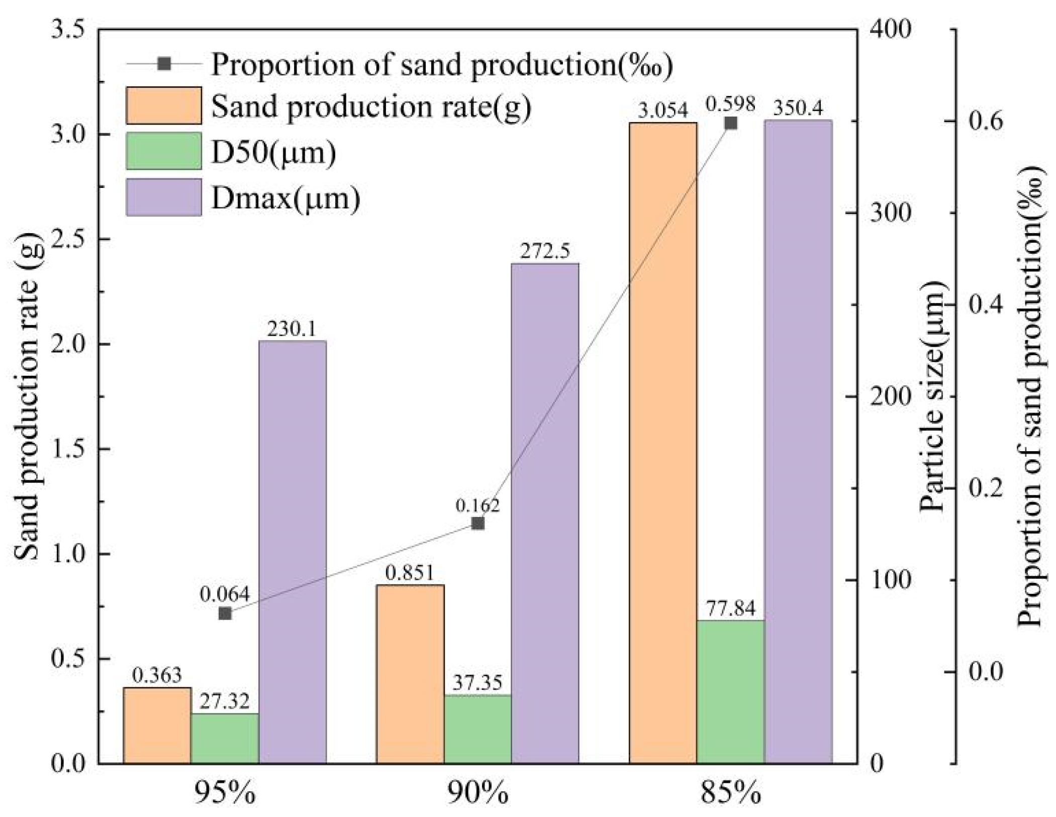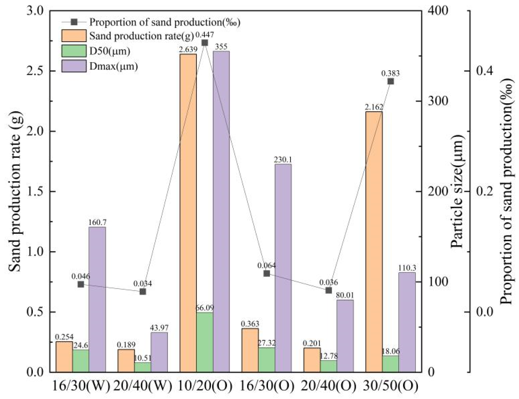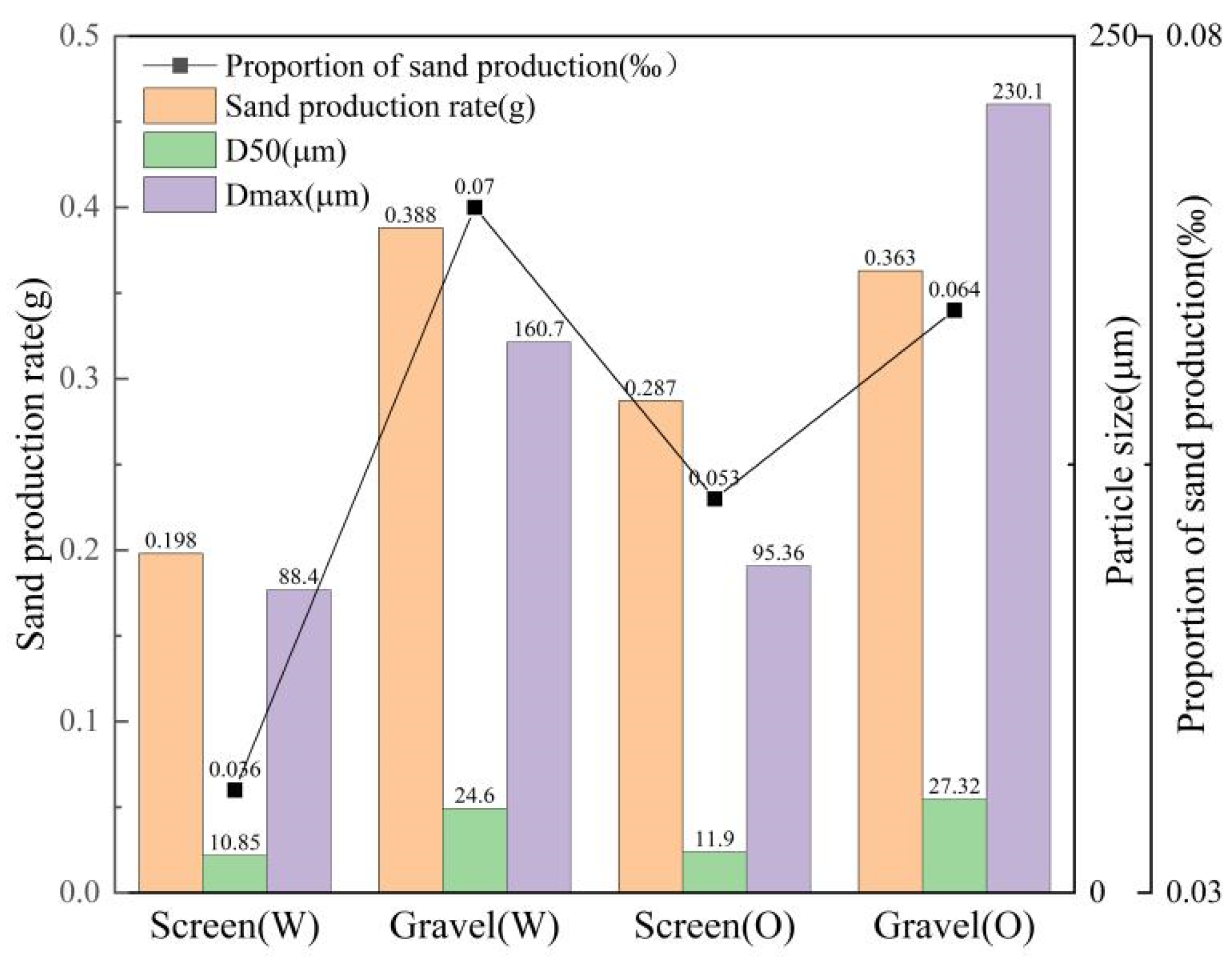 - The produced fluids and the sand that passed through the sand-retention medium were collected, dried, and weighed. A laser particle-size analyzer was then used to measure the maximum grain size and median grain size of the produced sand. According to the industry standard SY/T 5183-2024 [38], the sand-retention performance of the medium was evaluated using the “one-in-ten thousand” criterion, i.e., the cumulative sand production must not exceed 0.3‰ of the produced liquid volume.