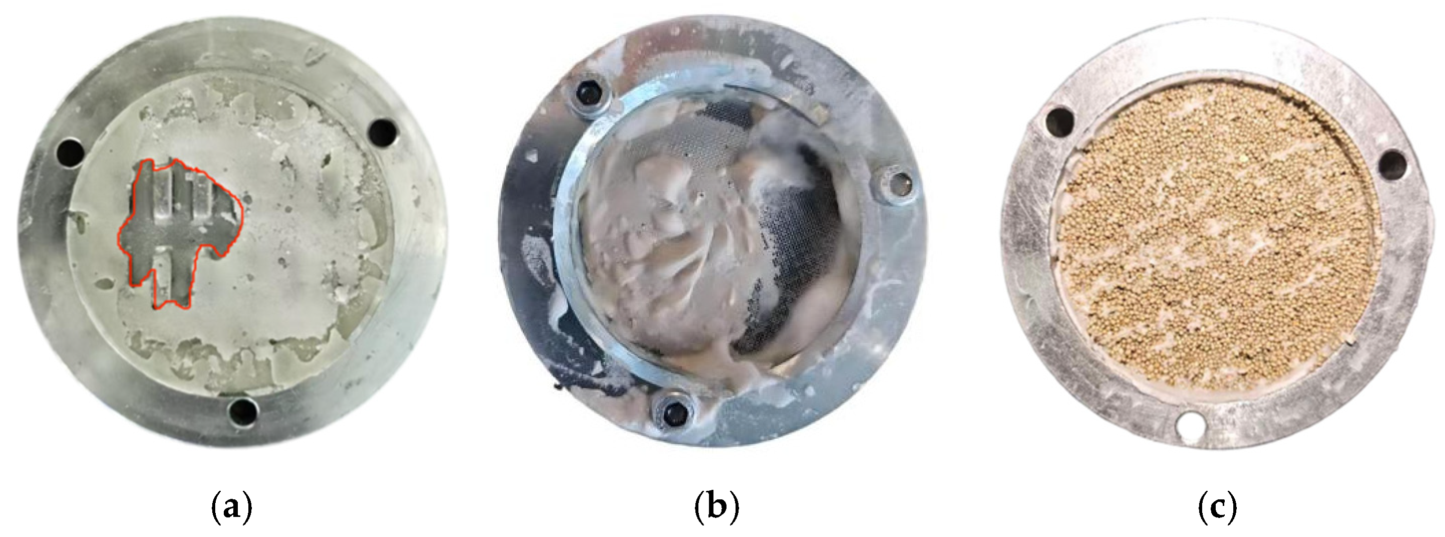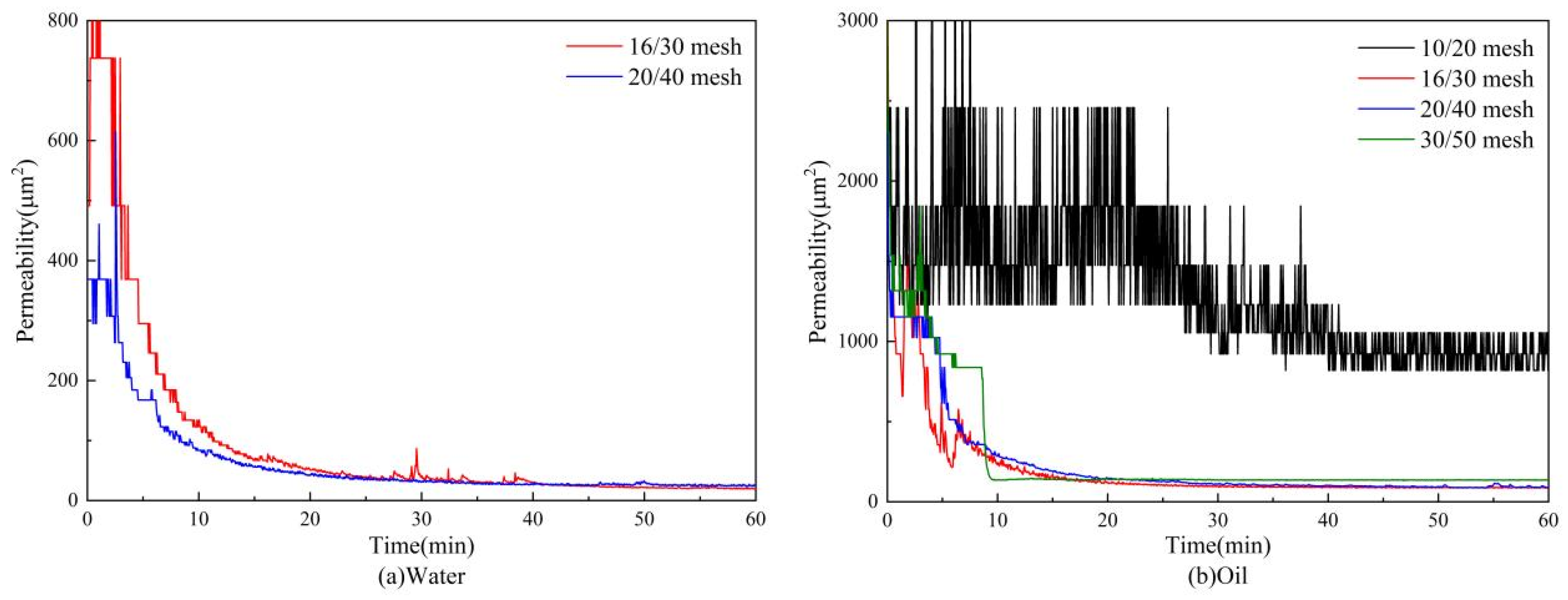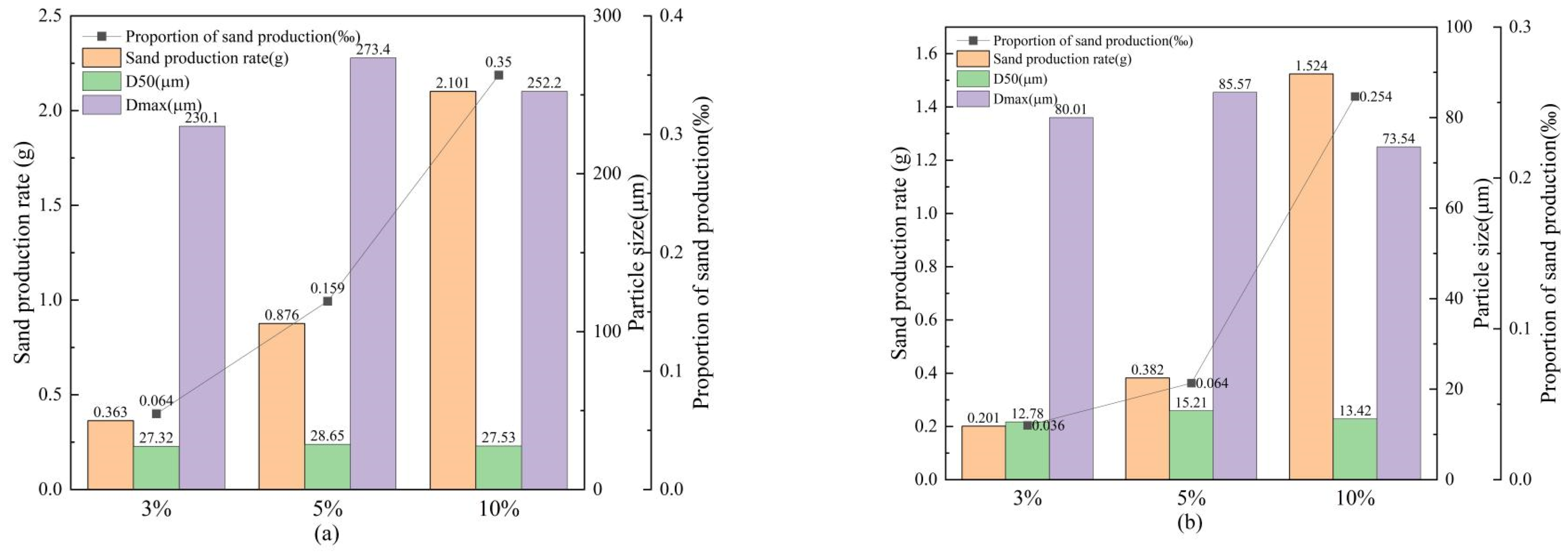 - The produced fluids and the sand that passed through the sand-retention medium were collected, dried, and weighed. A laser particle-size analyzer was then used to measure the maximum grain size and median grain size of the produced sand. According to the industry standard SY/T 5183-2024 [38], the sand-retention performance of the medium was evaluated using the “one-in-ten thousand” criterion, i.e., the cumulative sand production must not exceed 0.3‰ of the produced liquid volume.