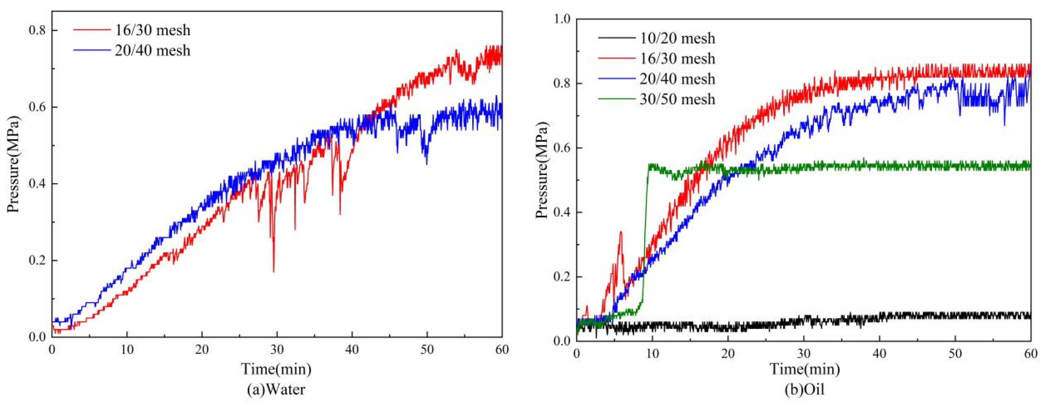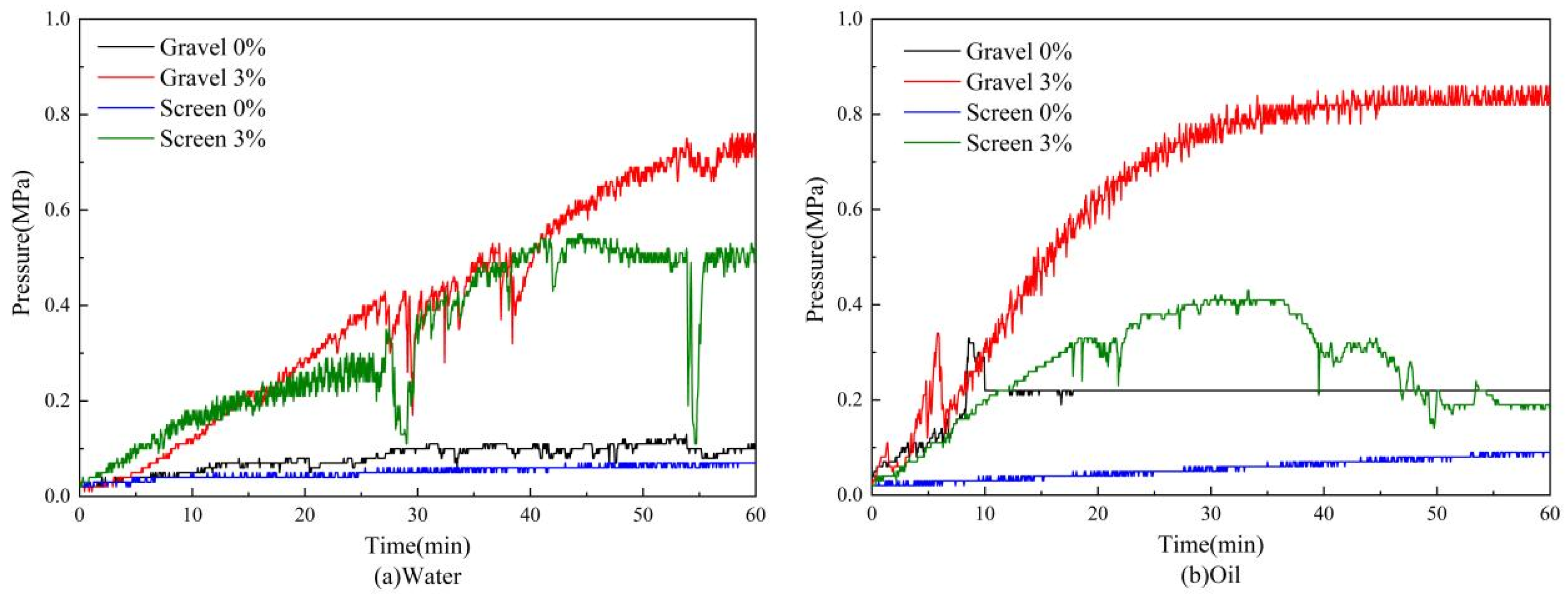 - Low-viscosity oil has a stronger sand-carrying capacity than water, which accelerates both sand production and plugging. Compared with the water phase, the stabilized pressure difference across the sand-control unit increases by 12%, and the pressure curve rises more rapidly.