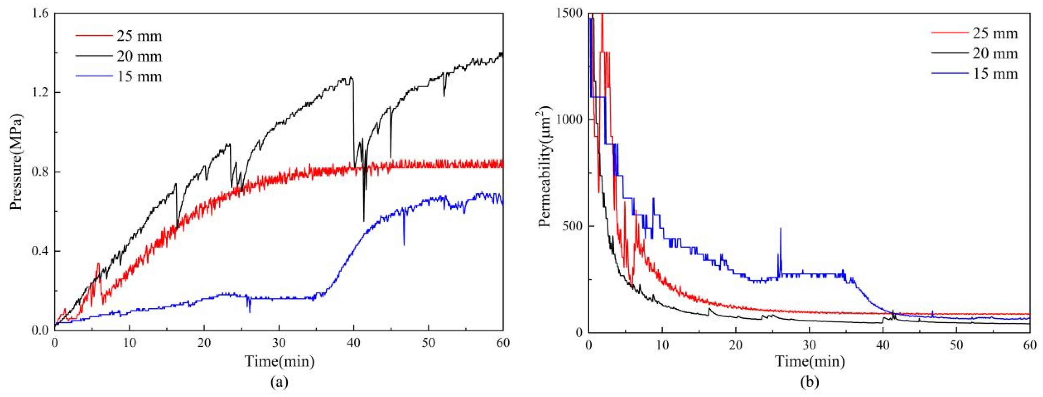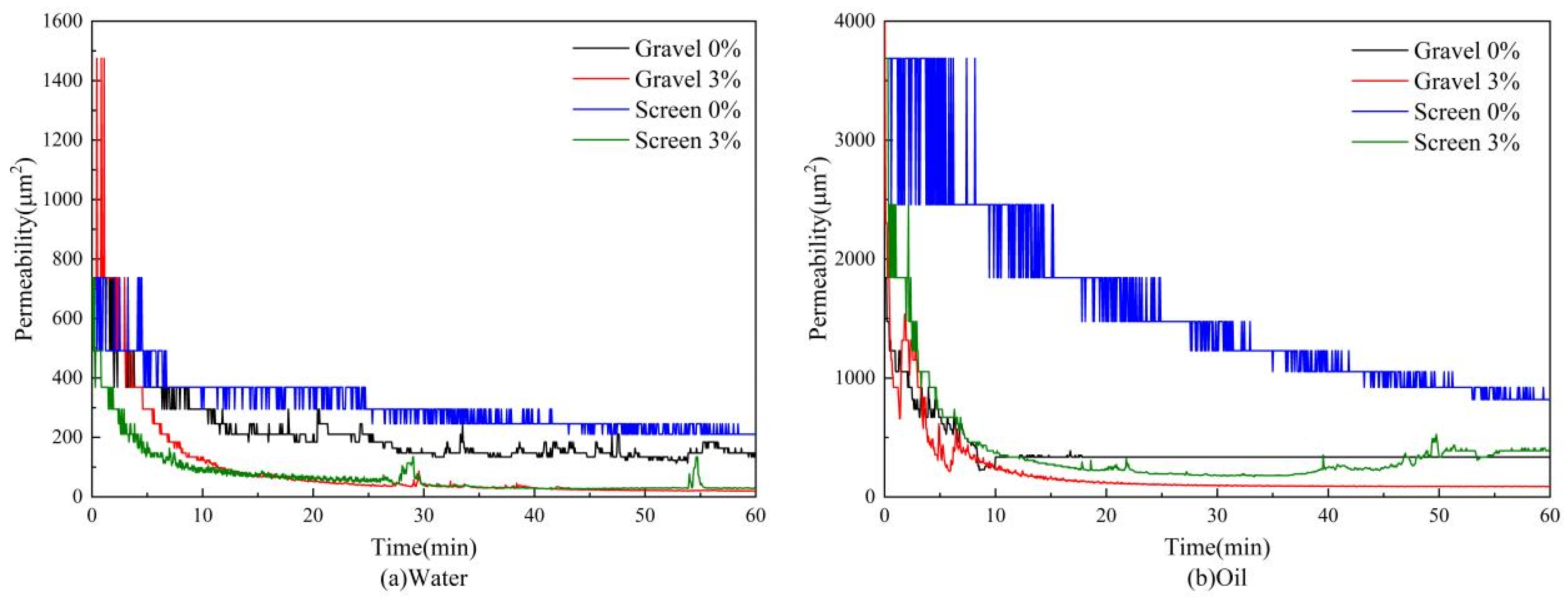 - For the target reservoir characterized by heterogeneous fine sand and low clay content, gravel sizes of approximately 3–6 times the median reservoir-sand grain size provide an optimal compromise between permeability and sand-retention efficiency. If the gravel is too fine, clay and fine sand readily accumulate near the surface, causing a rapid permeability decline. If the gravel is too coarse, pore throats become too wide, and the risk of fine-sand breakthrough increases.