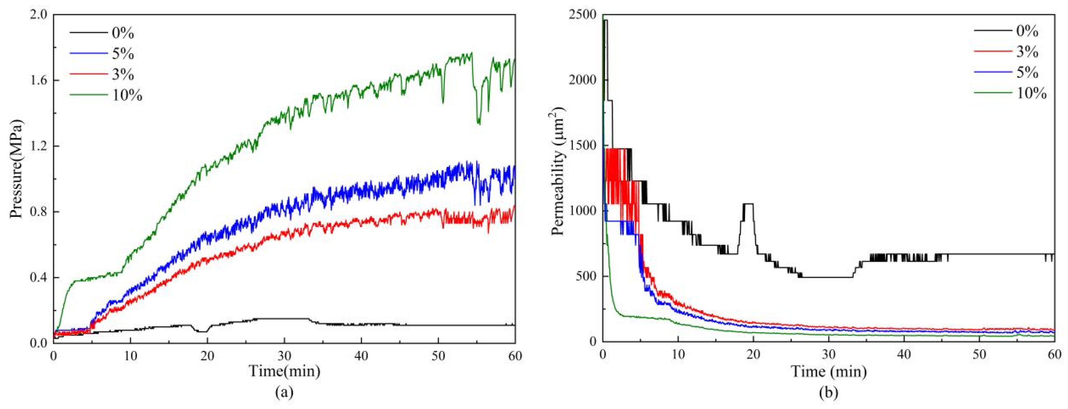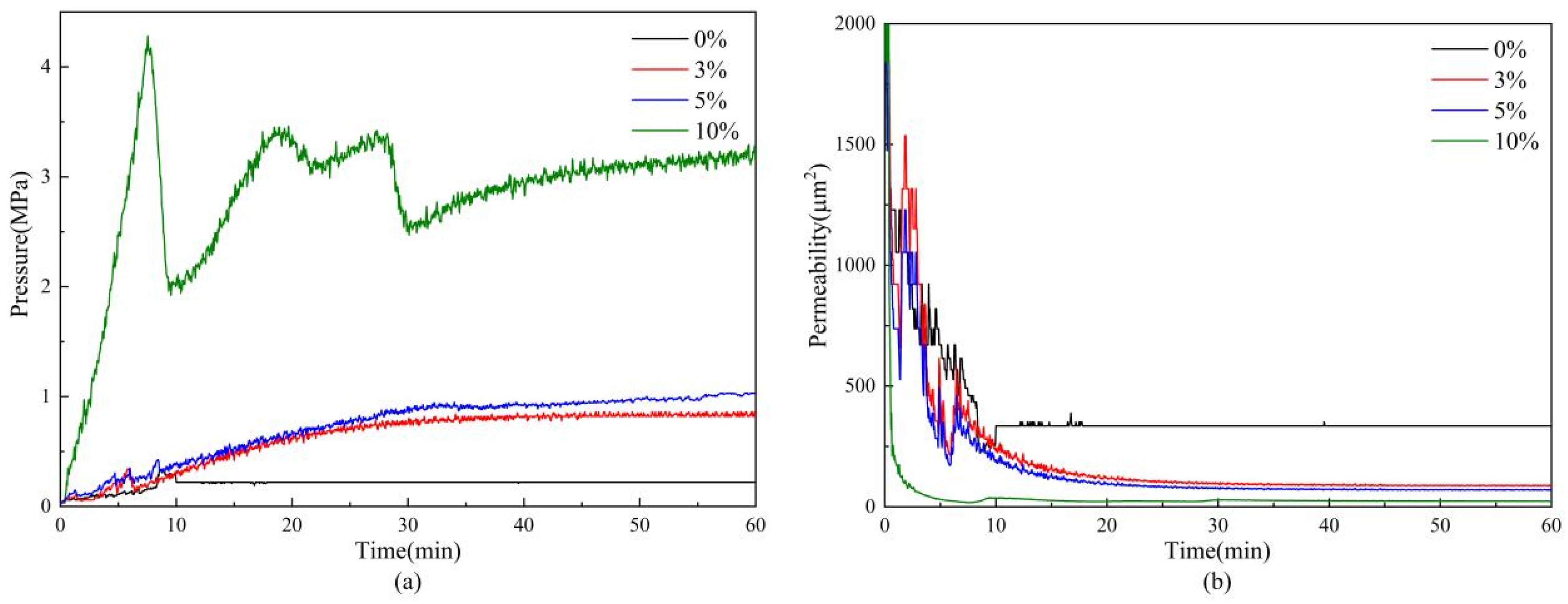 - The data-acquisition software was started, and the pump was set to an injection rate of 100 mL/min. The outlet valve was opened to initiate the experiment, while pressure data were recorded in real time, and produced fluids were collected. The pressure difference between the two ends of the sand-control unit, monitored by the data-acquisition system, increases with the severity of plugging. Based on the measured pressure difference, the permeability of the sand-control unit under unidirectional flow can be calculated using Darcy’s law as follows:
