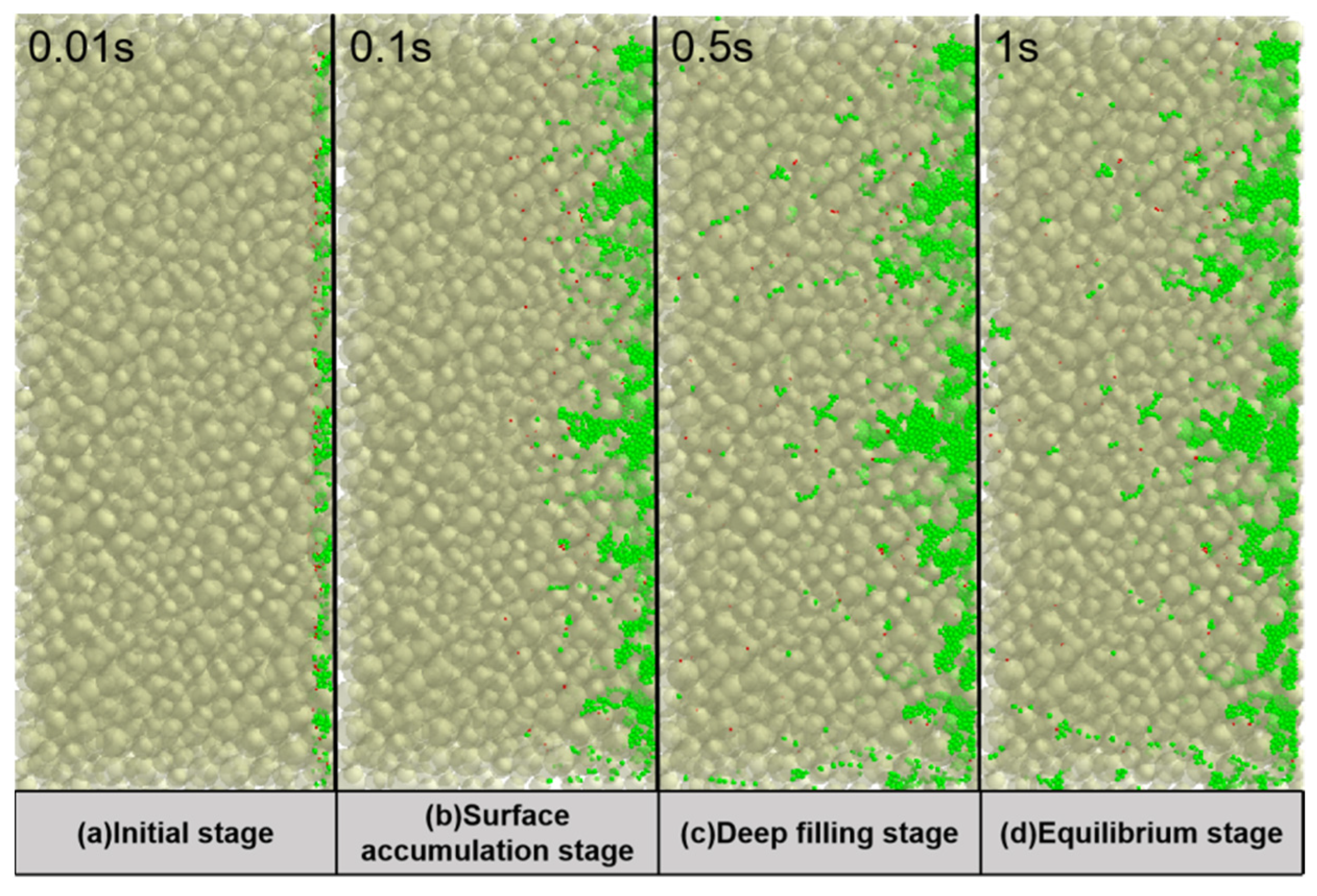 - Gravel-pack plugging proceeds through four stages: initiation, surface accumulation, deep filling, and equilibrium. Coarse particles first form a skeletal bridge near the boundary and at the surface; part of the coarse and fine particles then progressively fill medium-to-large pores inside the pack, and the system gradually develops a stable multistage filtration structure. This evolution is consistent with the experimental observation that the pressure difference first increases and then stabilizes, while late-time sand production remains very low.