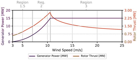 Power and rotor thrust curves of IEA-15 MW wind turbine.