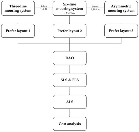 This study employs a three-stage design spiral strategy to systematically refine and optimize mooring system configurations, as shown in Figure 1,. The first stage develops a 3-line mooring system, primarily to identify fundamental design trends and understand the relationship between mooring parameters and platform motion response. The second stage introduces a 6-line mooring configuration and applies Analysis of Variance (ANOVA) to determine key design parameters that significantly influence system performance, with emphasis on minimizing failure risk and ensuring cost-effectiveness. The third stage proposes and optimizes an asymmetric mooring layout that balances structural safety and economic feasibility, ultimately providing a practical solution suited to Taiwan’s offshore environmental conditions. The study scope covers ULS, serviceability limit state (SLS), FLS, and ALS design conditions to ensure robust mooring system performance across various operational scenarios.