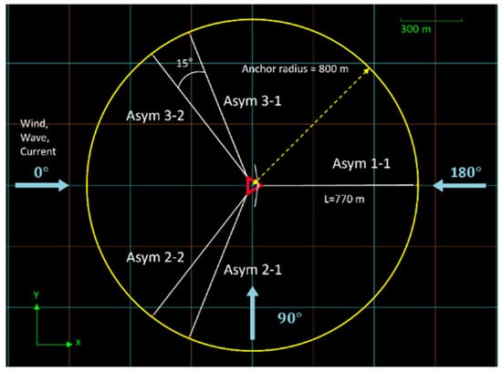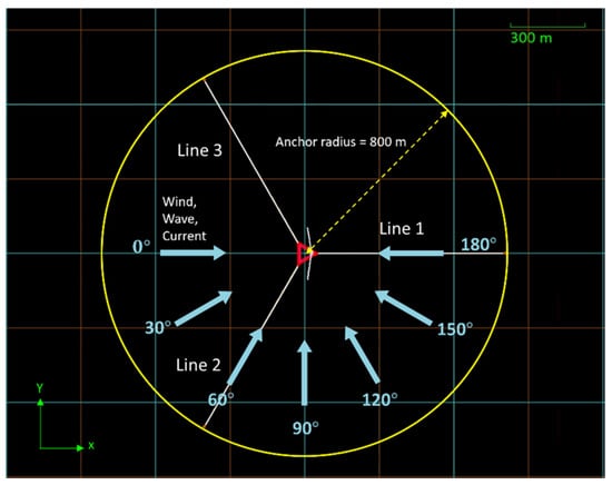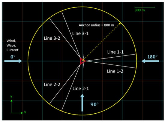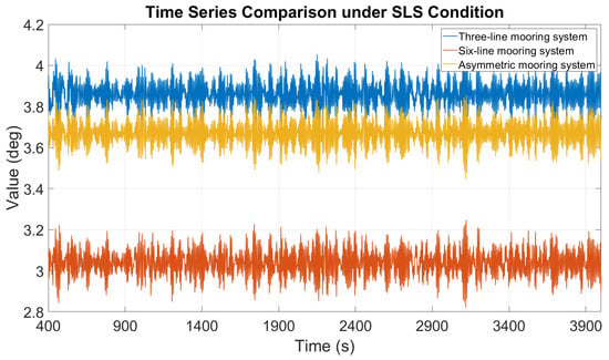 For the SLS design assessment, the three-line, six-line, and asymmetric mooring system configurations will be evaluated using the deployment layout illustrated in Figure 20. Finally, the platform inclination response will be examined and verified to ensure compliance with operational safety and performance requirements, as shown in Figure 20 and Figure 21.