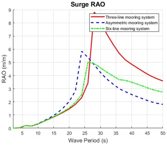 In this scenario, the six-line mooring system once again demonstrated the best performance among the three configurations, providing superior platform restraint and tension control following mooring line failure. The asymmetric mooring system followed, showing acceptable but slightly reduced performance in comparison.