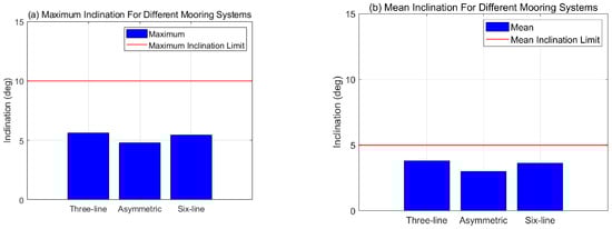 Inclination statistics for different mooring configurations: (a) Maximum inclination; (b) Mean inclination.