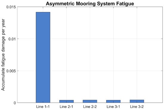 The distribution of accumulated fatigue among individual lines within each configuration was analyzed to identify the most fatigue-sensitive locations, as shown in Figure 22, Figure 23 and Figure 24. The results indicate that, for both the three-line and six-line mooring systems, the upwind mooring lines exhibit the largest fatigue damage. The asymmetric configuration presents the highest fatigue levels overall: due to its nonuniform line arrangement, the single line on the weaker side (Asym 1–1) experiences disproportionately elevated loading, making it the dominant fatigue hotspot and a critical limitation of the asymmetric layout. Even so, aside from this weaker-side line, the overall fatigue performance of the asymmetric system remains broadly comparable to that of the six-line configuration, demonstrating that the proposed asymmetric layout can retain acceptable structural reliability while reducing mooring material requirements.