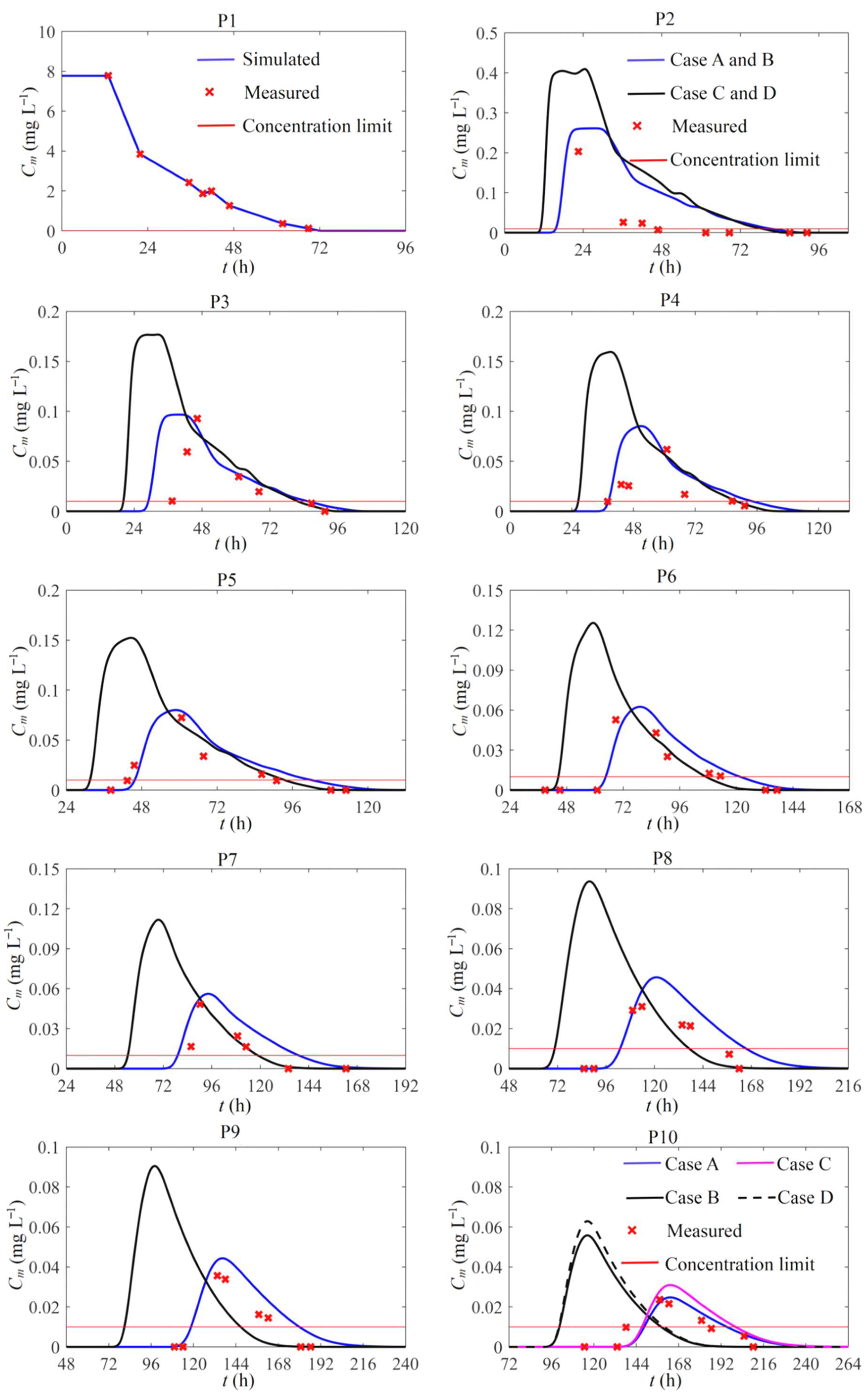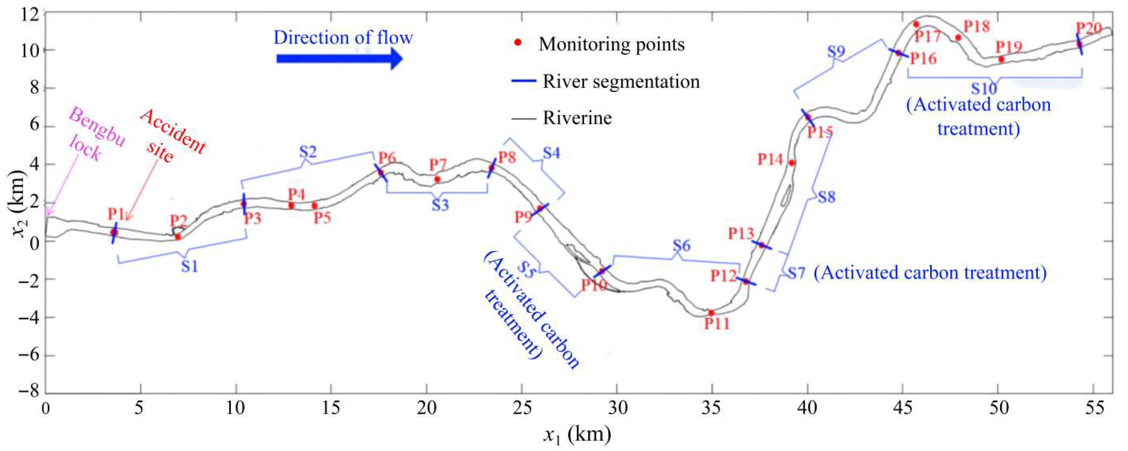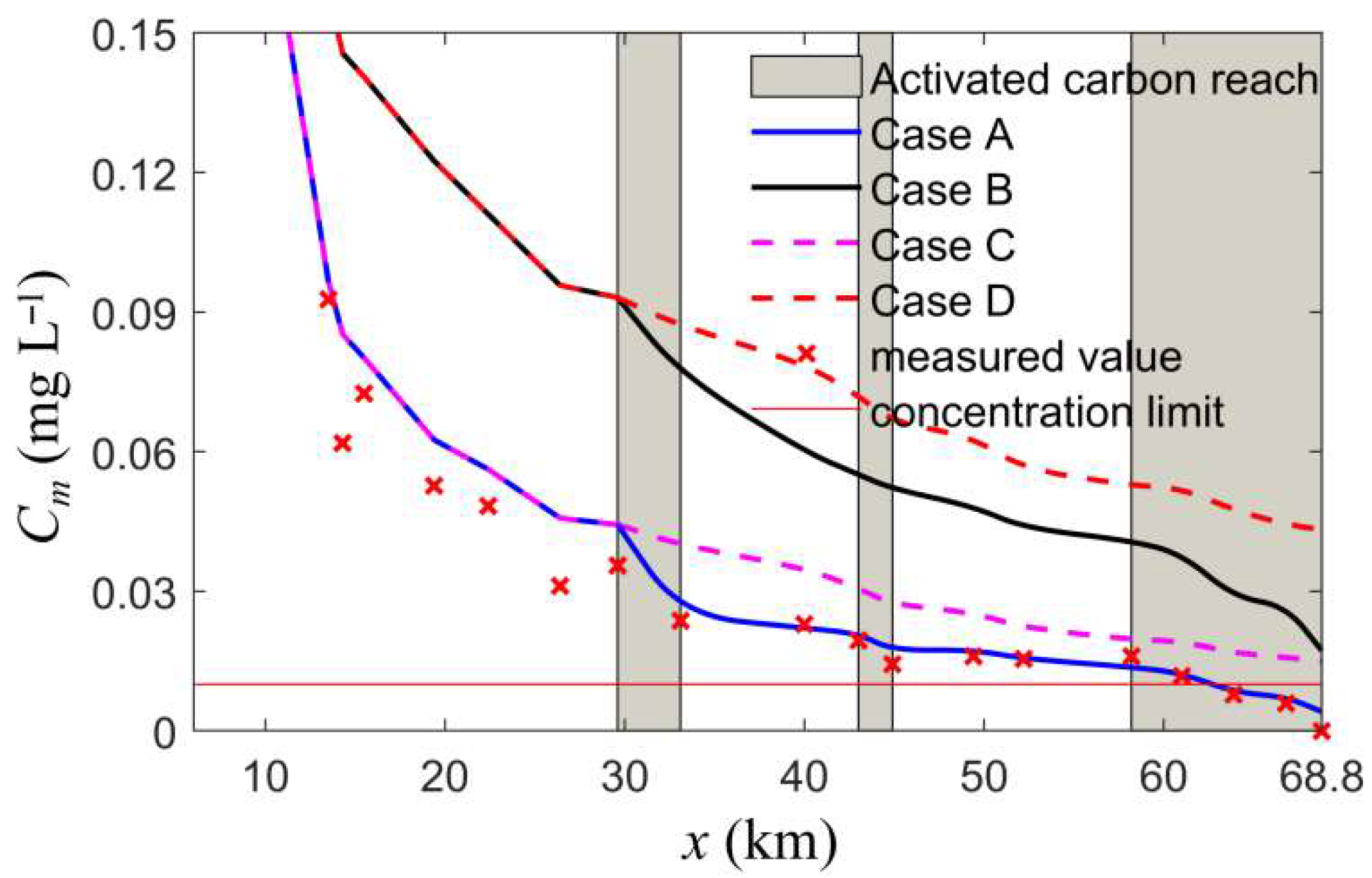 | Monitoring Points | x (km) | River Sections | Activated Carbon | KV (s−1) Case A and C | KV (s−1) Case B and D | KN (1/s) | KAC (s−1) Case A and B |