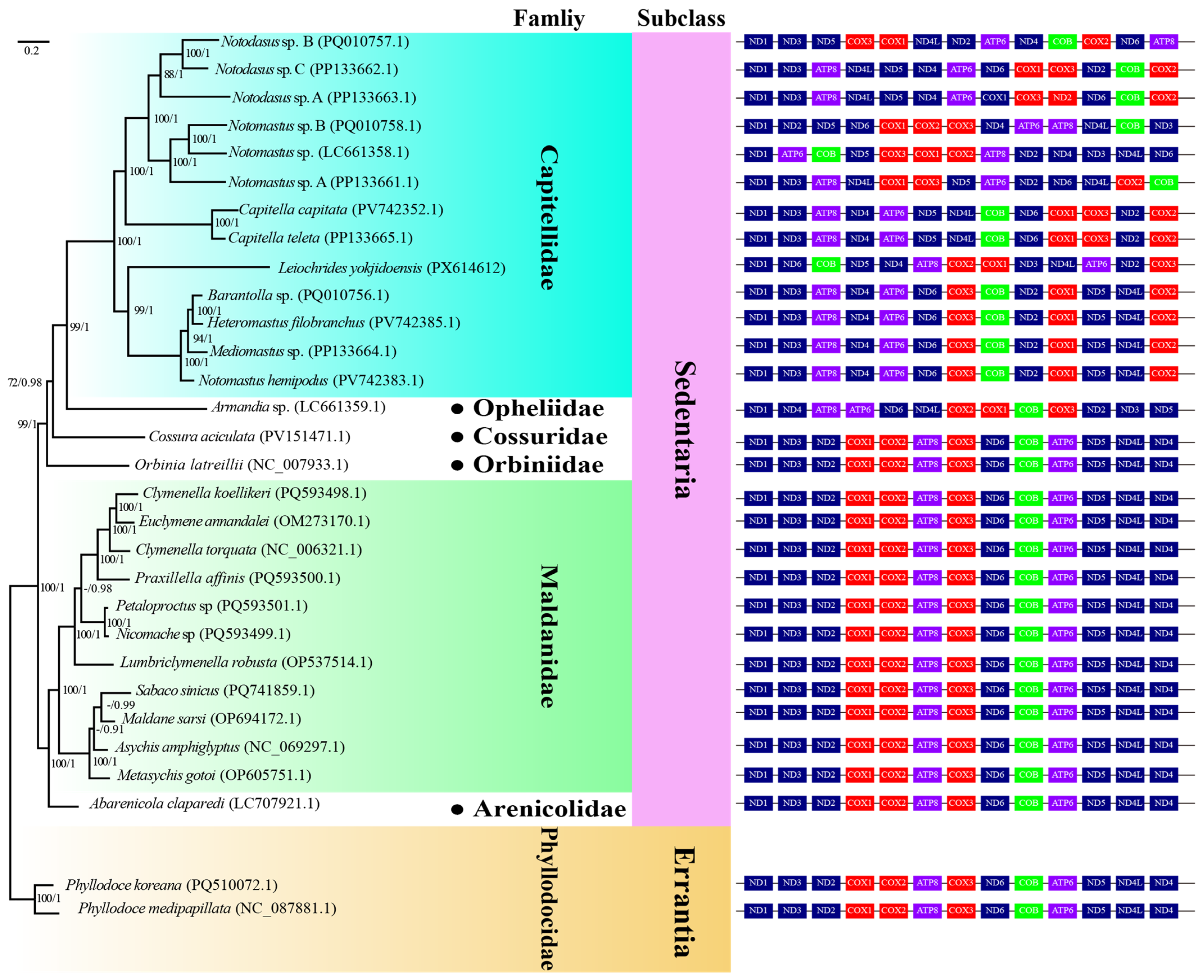 - Su, X.; Yang, D.; Wu, X.; Sun, Y.; Qiu, J.-W.; Zhang, Y. Substantial mitochondrial gene order rearrangements and differential evolution rates within the family Capitellidae (Annelida). Zoosystematics Evol. 2025, 101, 955–967. [Google Scholar] [CrossRef]