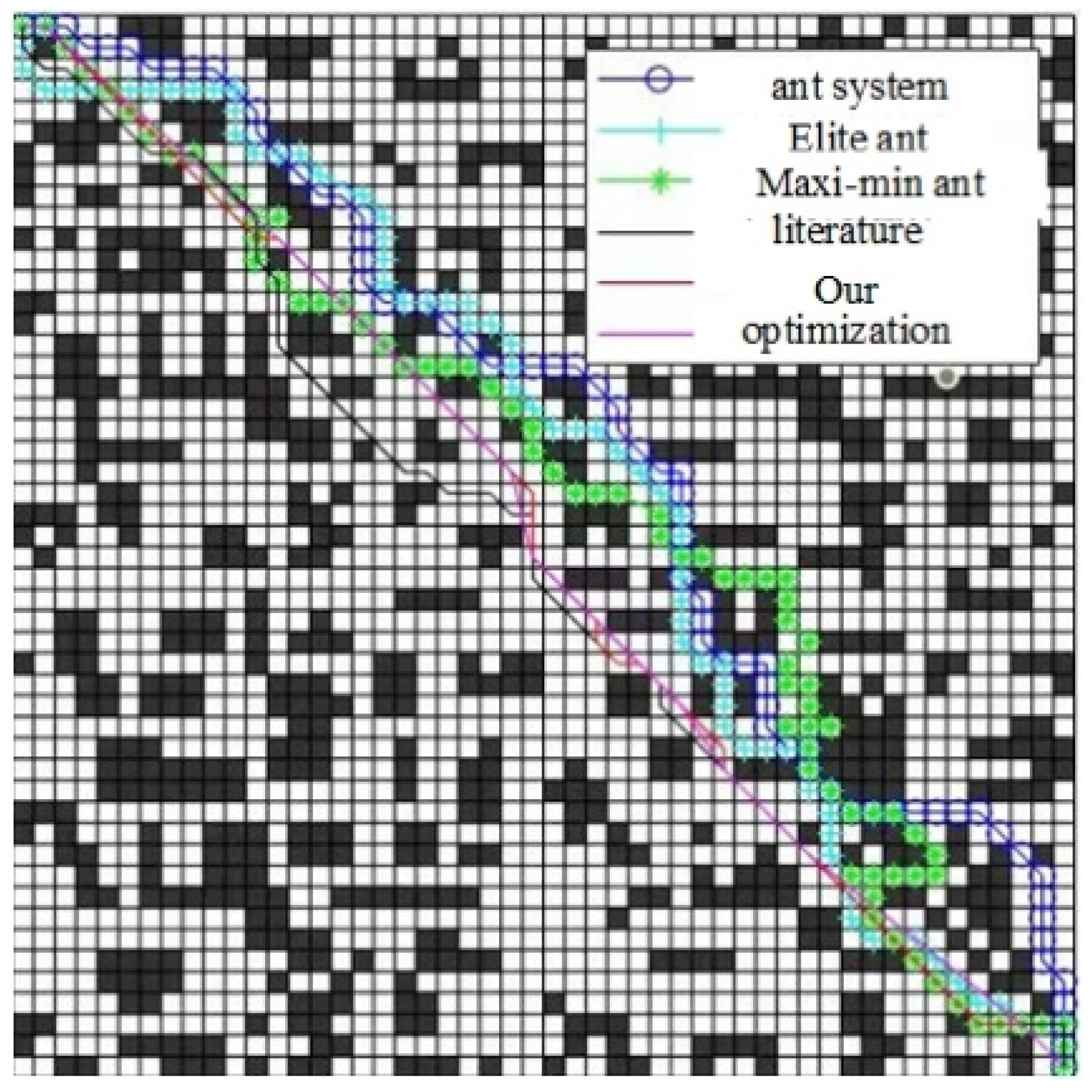 Figure 8. Conversely, the enhanced heuristic function proposed in this study not only enhances computational speed but also fortifies local search capability, thereby facilitating accelerated algorithm convergence in later stages, as illustrated in