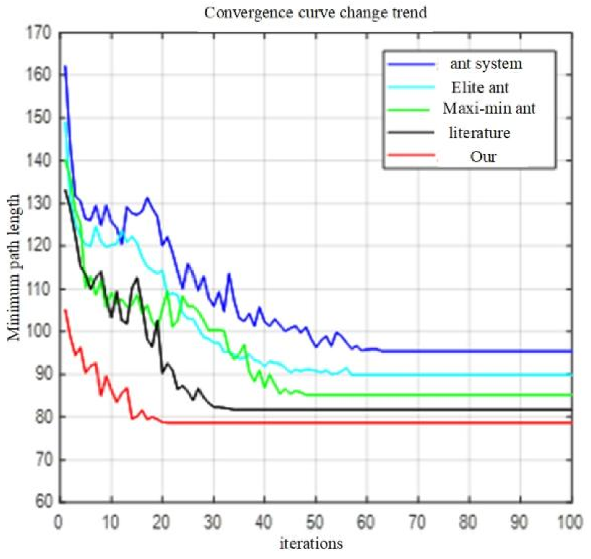 Notably, the enhanced algorithm in this paper demonstrates significantly accelerated convergence, fewer iterations, and identifies a relatively shorter optimal route length when contrasted with the other four algorithms.