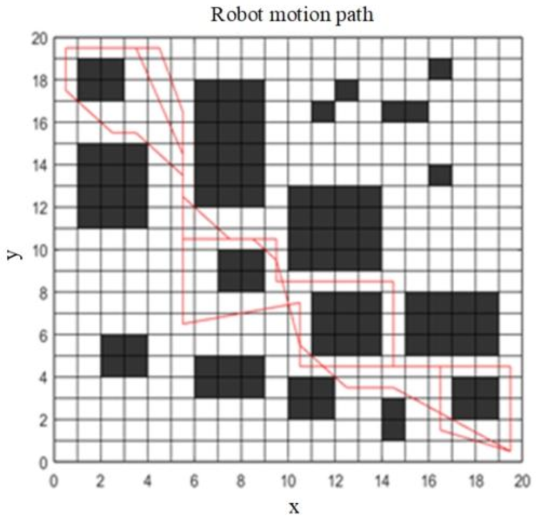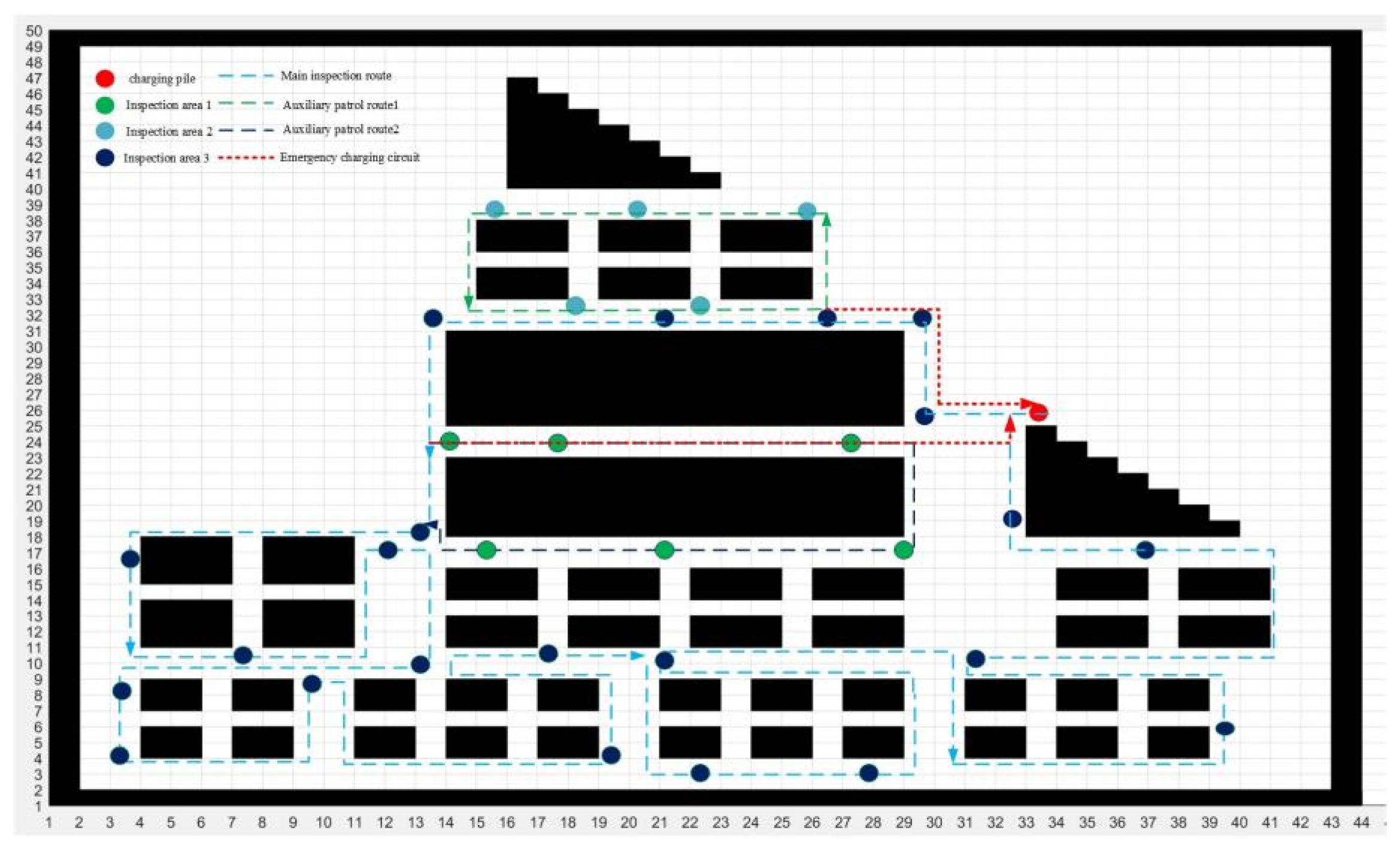 In this paper, experiments were conducted in a simulated harbor environment, with the robot’s initial and final positions set at coordinates (35, 25), representing the location of the charging station. The black grid in the figure denotes static obstacles and safety margins within the inspection area. The robot’s objective is to navigate from the starting point to the endpoint without collisions, utilizing a combination of global and local target points. Along the inspection path, the primary focus is on reaching the warehouse, with the robot strategically planning local inspections based on remaining battery power post-warehouse inspection. The robot’s battery capacity is 10 km, and it moves at a speed of 5 km/h. When the remaining battery falls below 30%, the robot promptly returns to the charging station. During a specific inspection instance, when the robot reaches the inspection point in the lower left corner of the parking lot, having covered 7.21 km, and the remaining battery is less than 30% of the total mileage, the robot directly heads back to the designated red charging point. Additionally, the inspection robot is equipped with a power sensor and navigation system for real-time power monitoring and autonomous identification of charging routes. The power sensor accurately measures the battery level, while the navigation system employs pre-set path planning and environmental awareness technologies to guide the robot to charging stations [