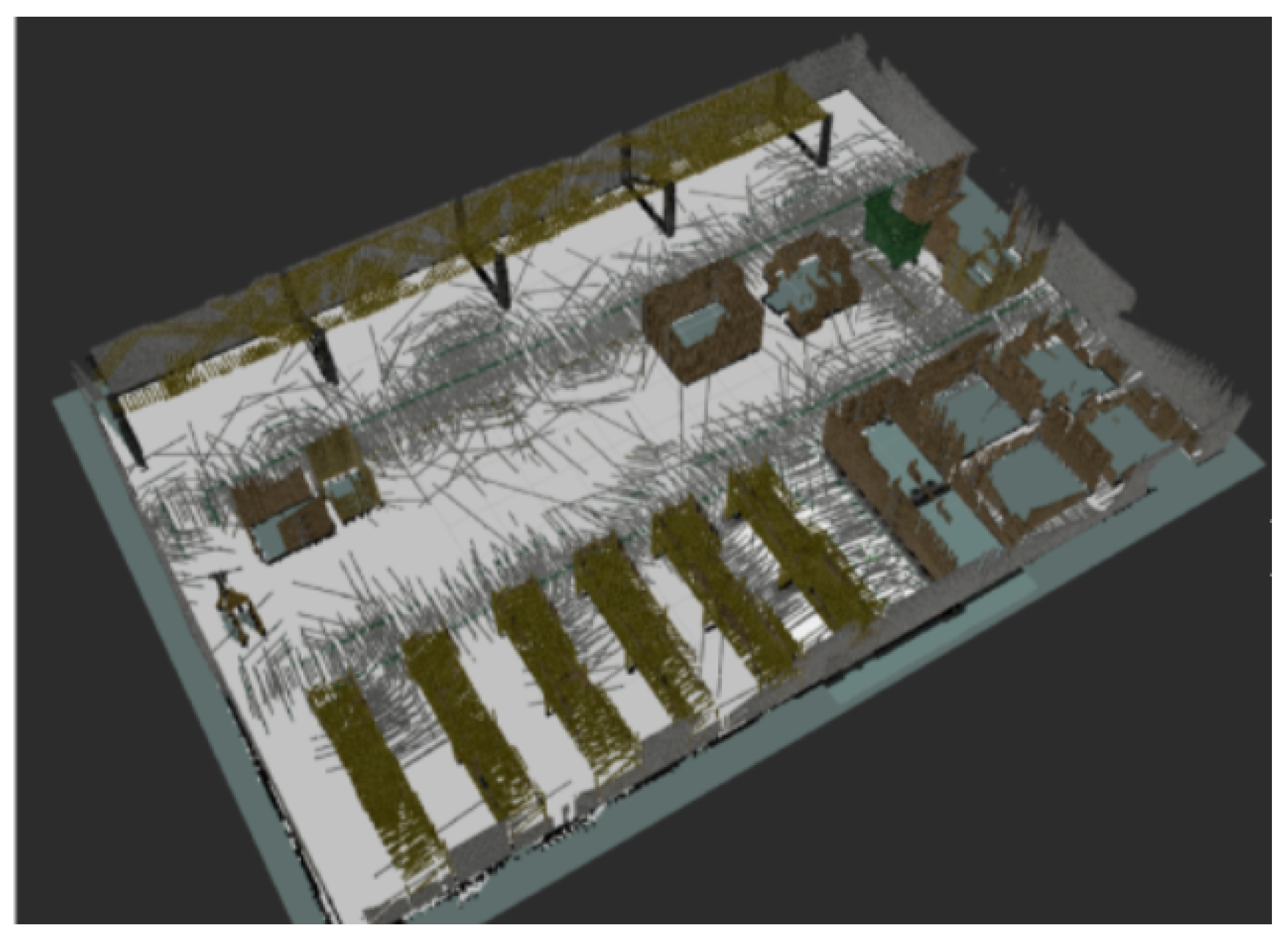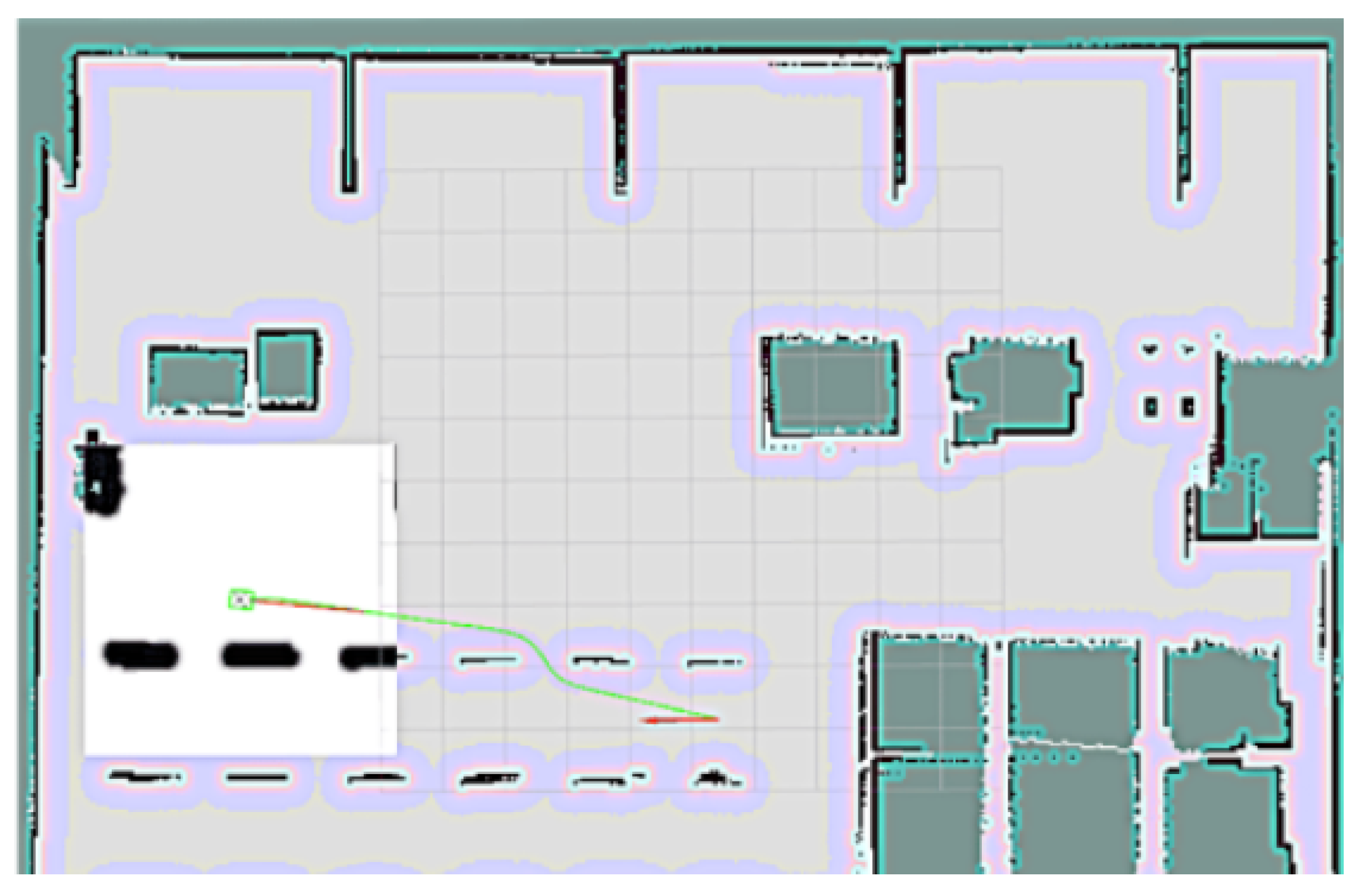 Figure 14, we set up a factory warehouse environment to simulate the real-world environment. Using real-time positioning and map-building capabilities in Rviz, we scan the simulation environment, build the corresponding map, and perform path planning.