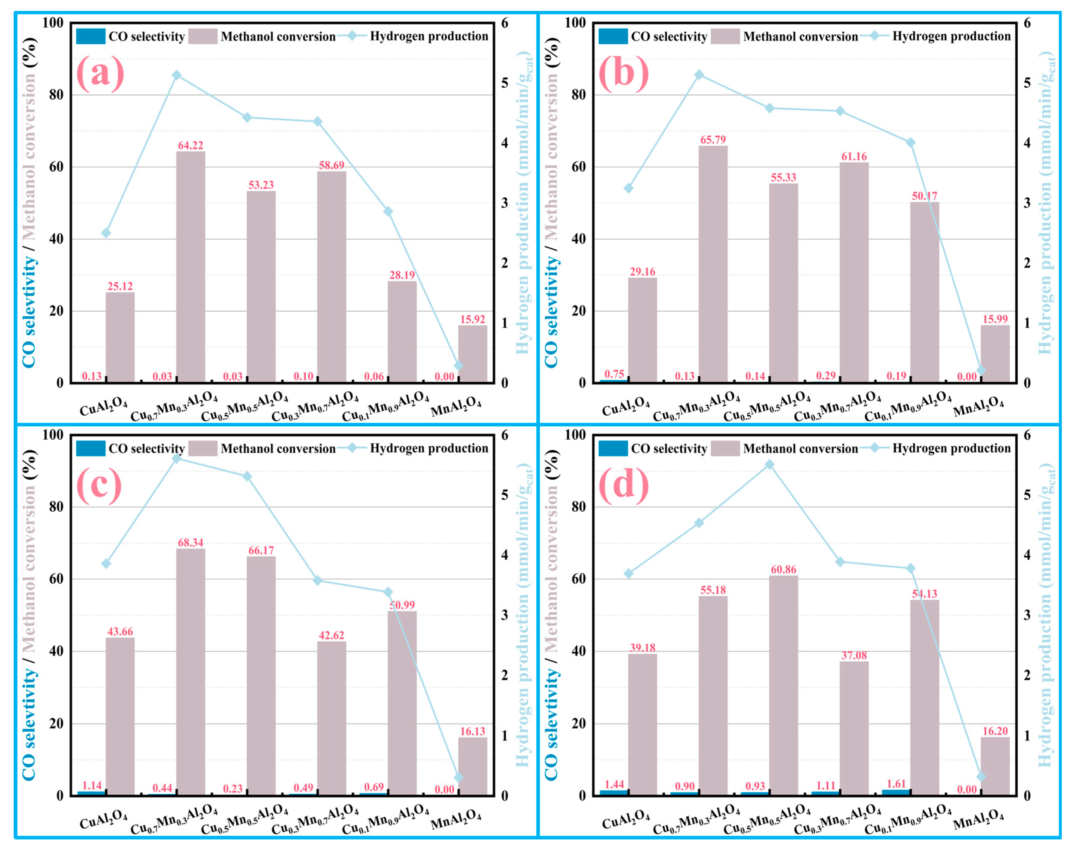 - Zhang, Q.; Qiu, S.; Zheng, Y.; Huang, Y. Effect of Mn/Cu Ratio on the Structure–Performance Relationship of Spinel-Type Mn–Cu/Al2Ox Catalysts for Methanol Steam Reforming. Catalysts 2025, 15, 1091. [Google Scholar] [CrossRef]