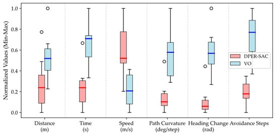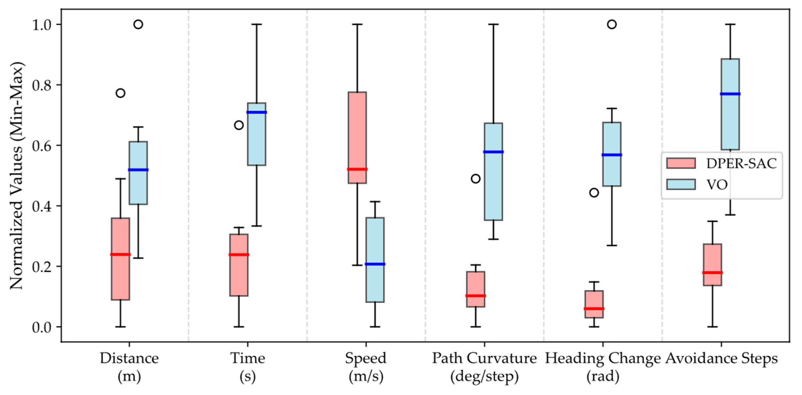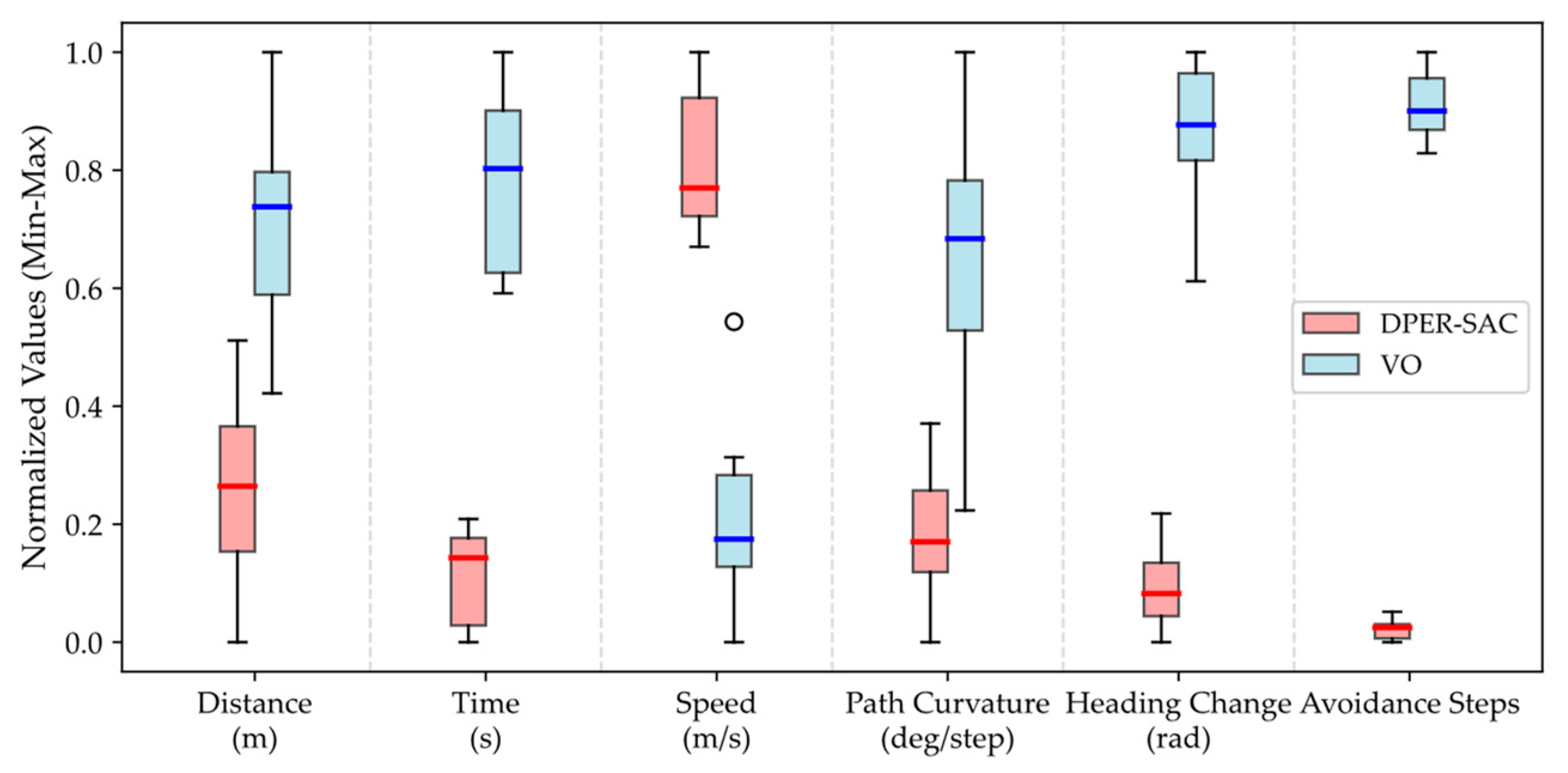 | Algorithm | Average Navigation Distance (m) | Average Navigation Time (s) | Average Speed (m/s) | Average Path Curvature (deg/Step) | Maximum Single-Step Heading Change (rad) | Minimum Avoidance State Time Steps |