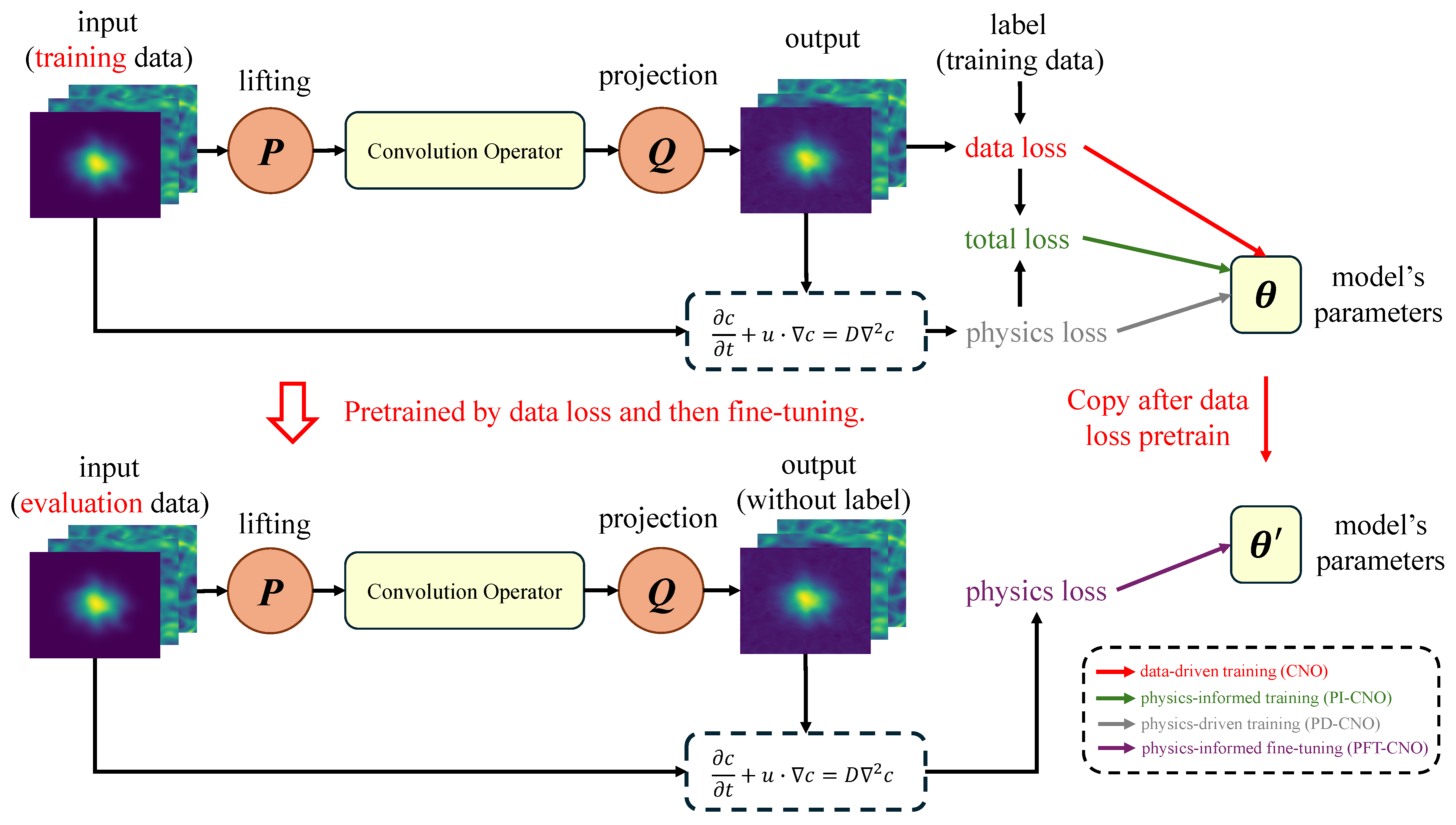 - PI-CNO [40]: This is the Physics-Informed CNO, which jointly optimizes both data loss and physics loss during training using the combined objective . This method represents the conventional approach to incorporating physical information into neural operators and allows us to compare against joint optimization strategies.