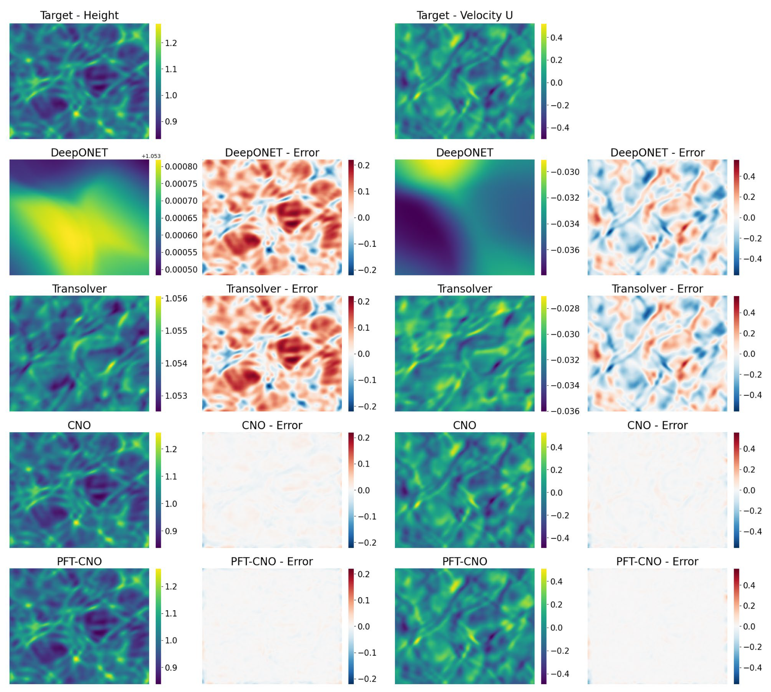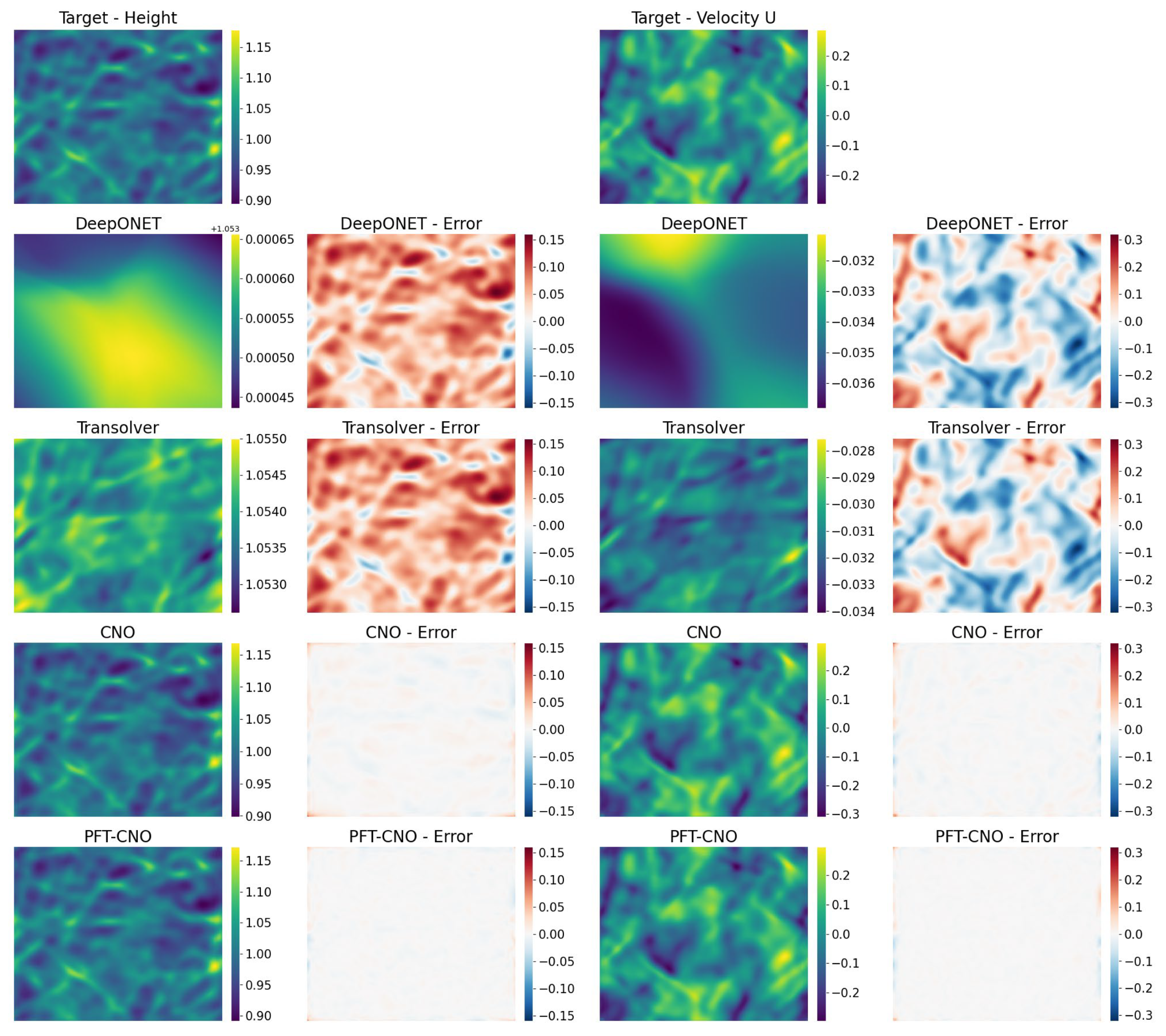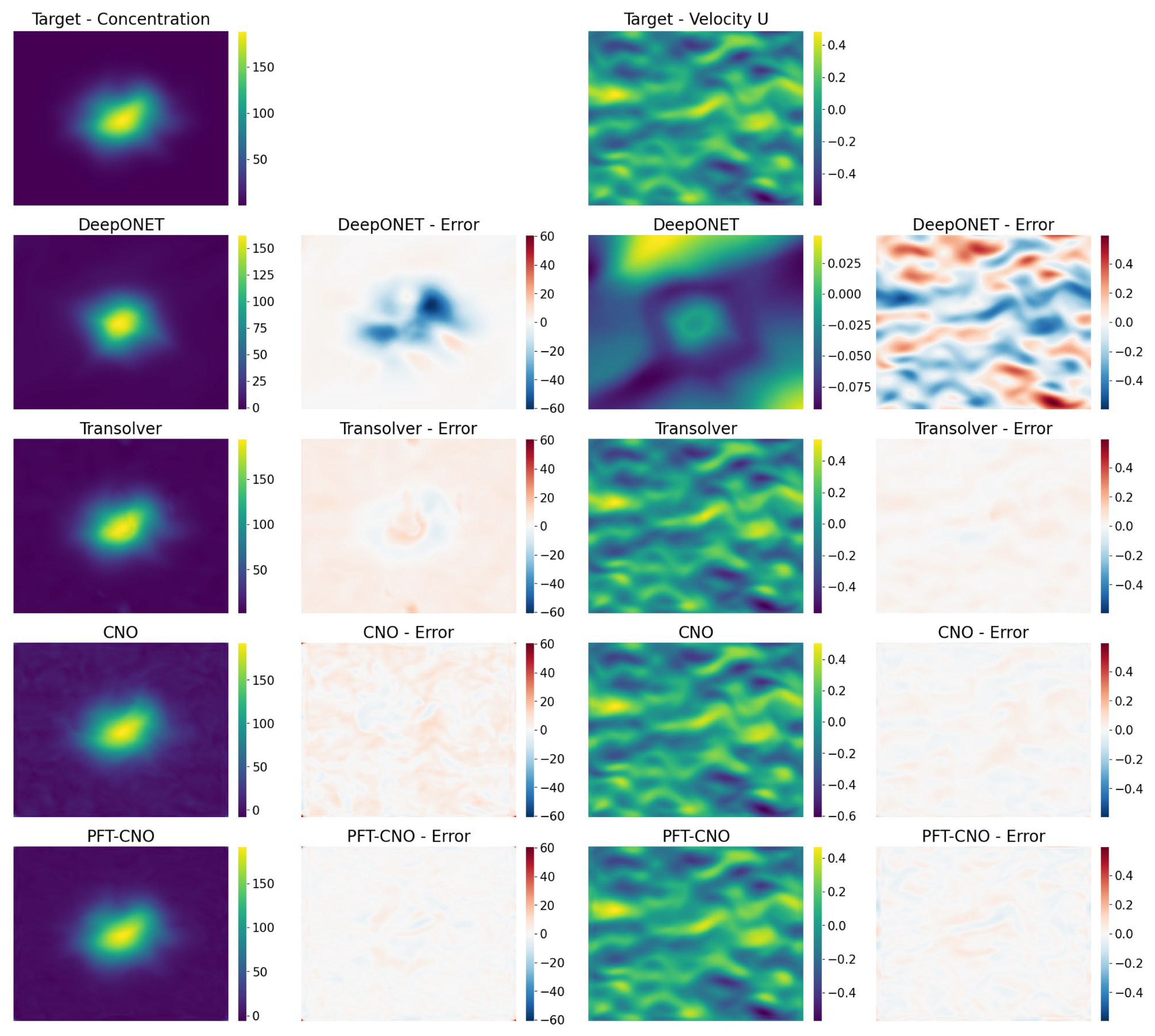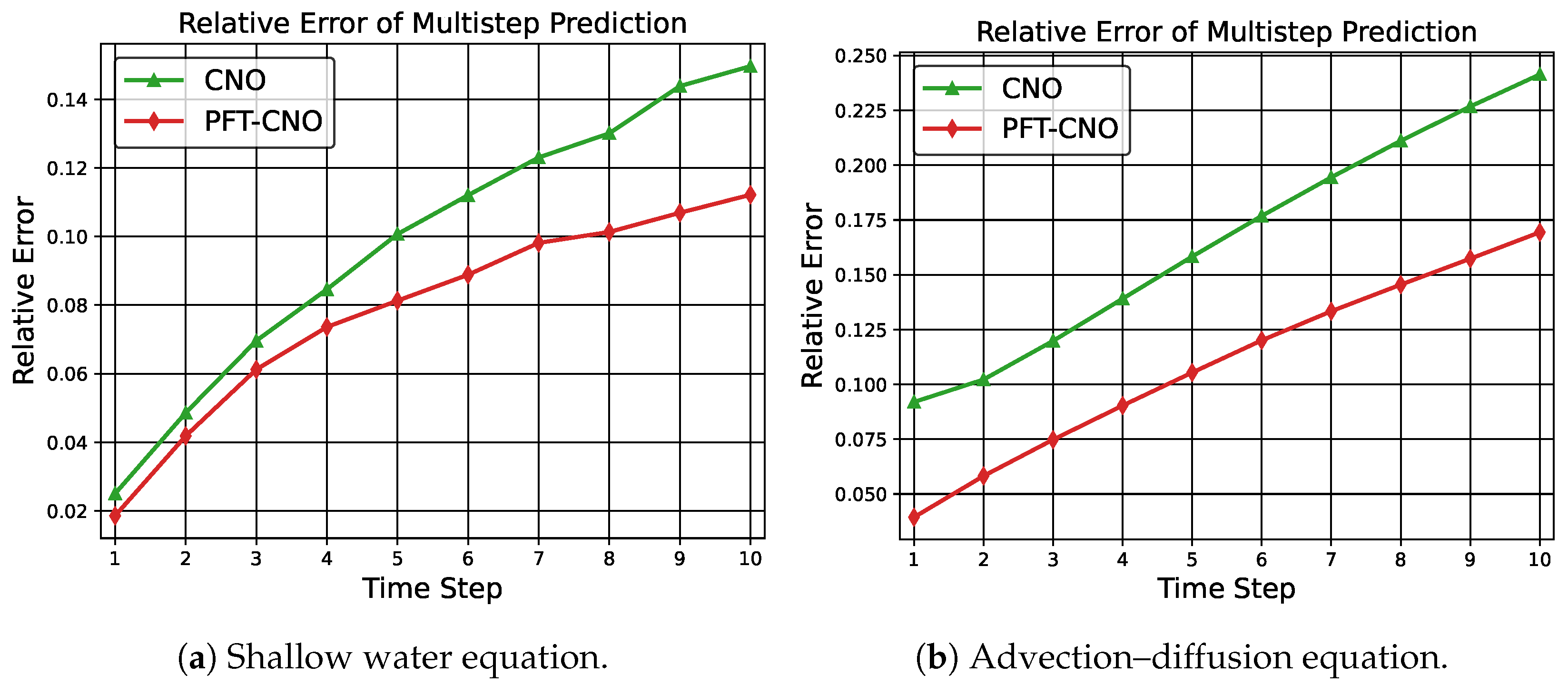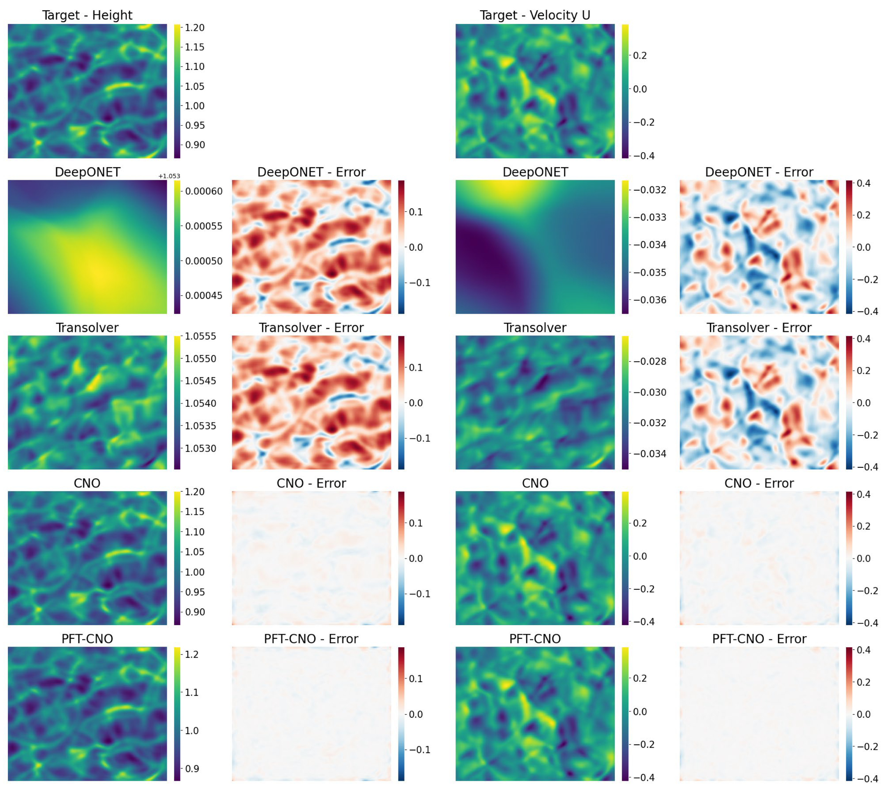 - We demonstrate the effectiveness of our method on two distinct flow field systems (shallow water equation and advection–diffusion equation), achieving substantial improvements in both single-step and multi-step predictions, validating the practical utility of PFT-CNO.