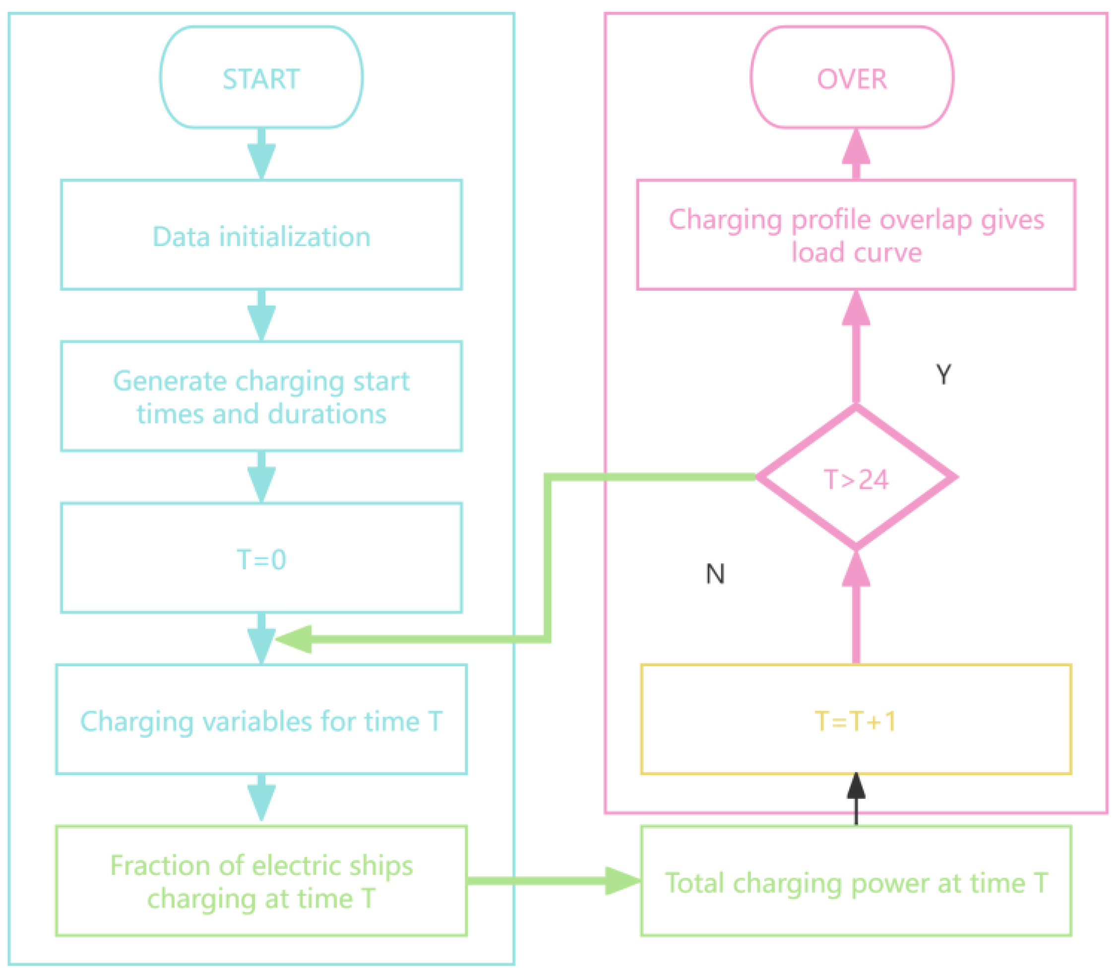 Our study steps in here. Set against China’s “dual carbon” timeline (peak by 2030, neutrality by 2060) and its push for green ports, we built a Monte Carlo framework designed specifically for forecasting marine lithium battery shore power loads. What is new? First, we explicitly model the following key random variables: ship type, battery capacity, daily mileage, and charging start time. Second, we simulate and compare five shore power supply modes in one probabilistic playground—making it possible to directly weigh grid impact and efficiency. Third, we embed optimization (solved with CPLEX) inside the simulation loop to mimic smart charging strategies. This blend of simulation and optimization offers a realistic testbed for policies like demand response or time-of-use tariffs, which align with China’s market-driven approach to scaling shore power.