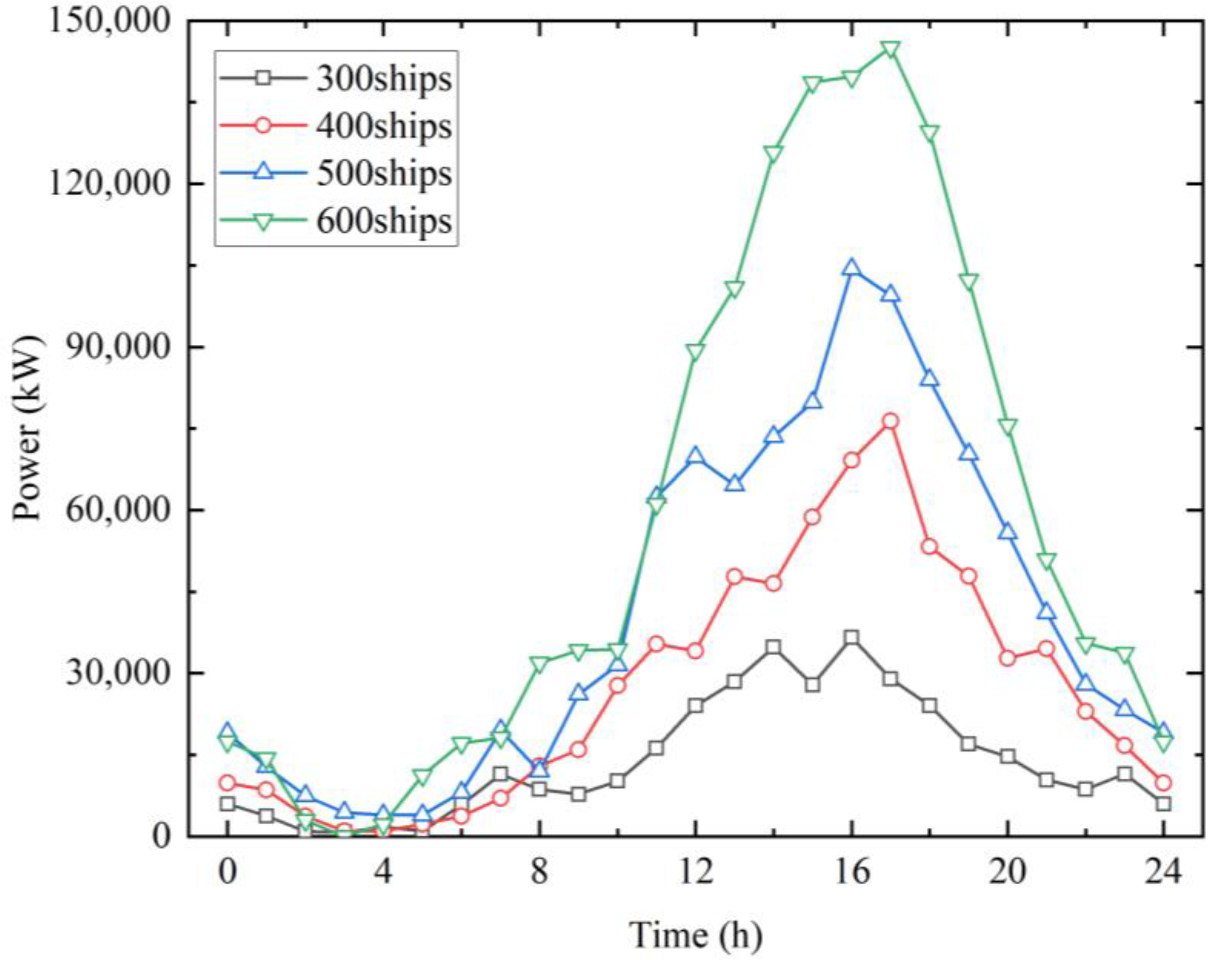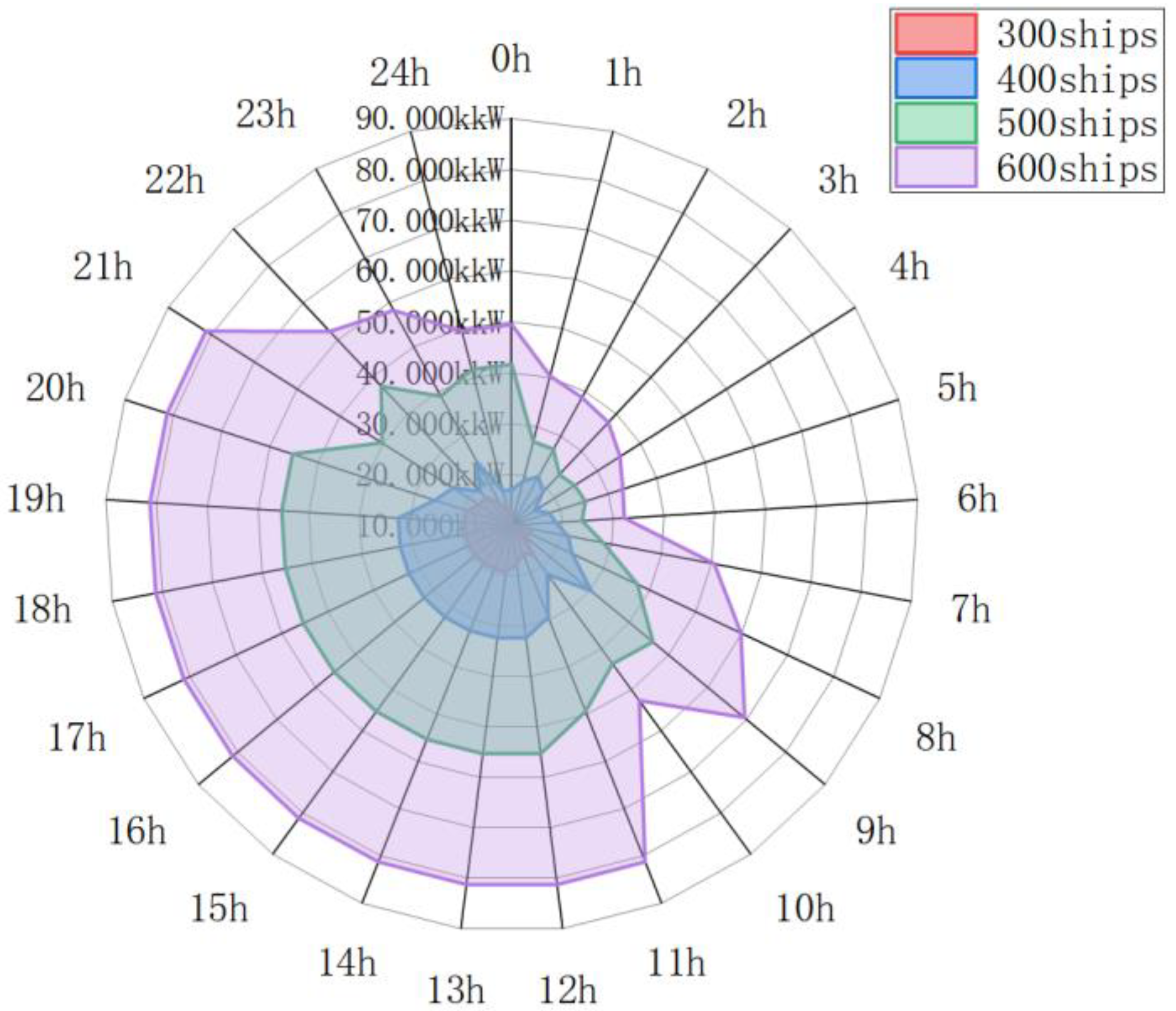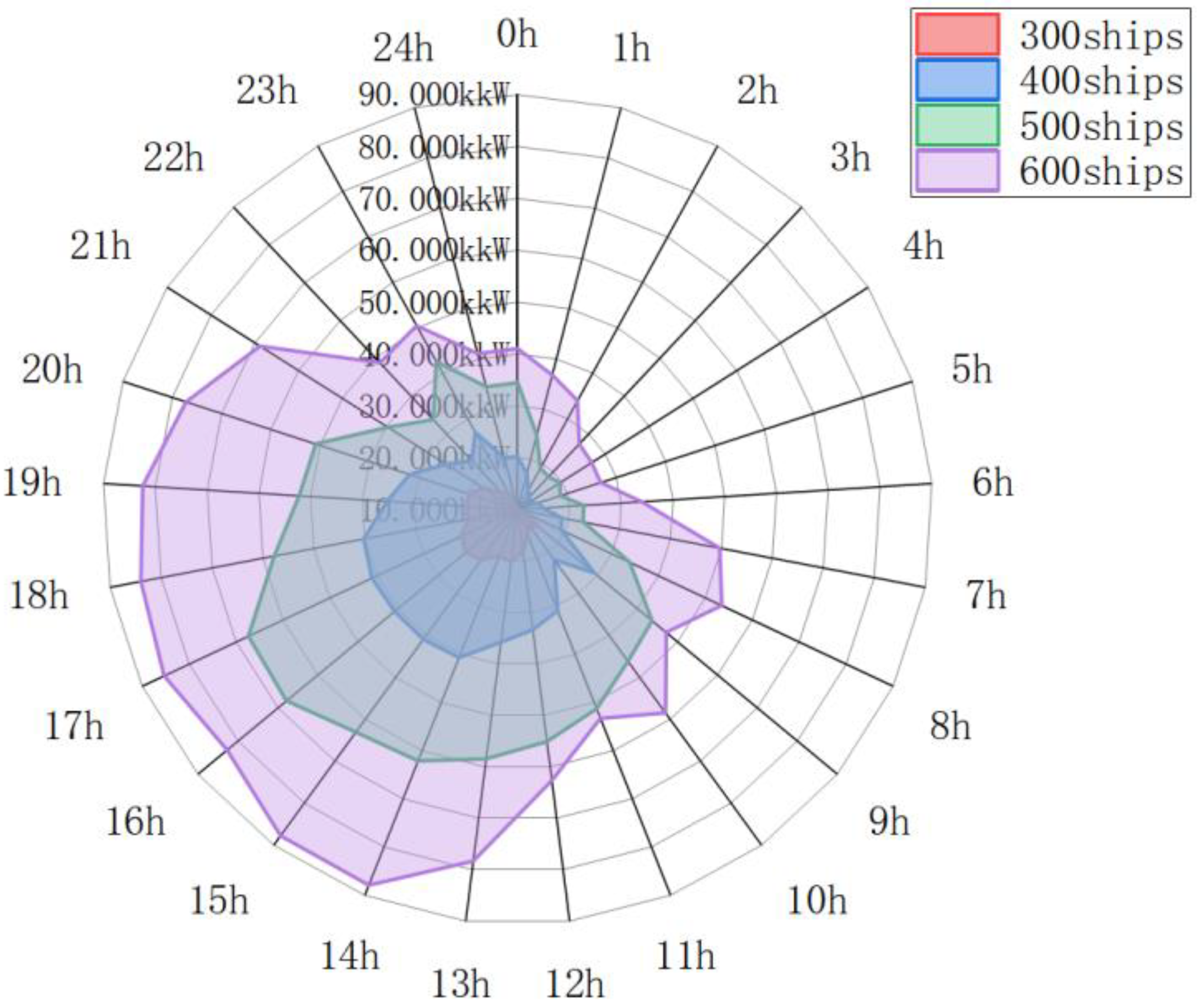 In the scenarios of 500 and 600 vessels, the peak loads reached 67,855.5 kW (at 4 p.m.) and 87,931.8 kW (at 2 p.m.), respectively, which began to have a certain impact on the power grid.