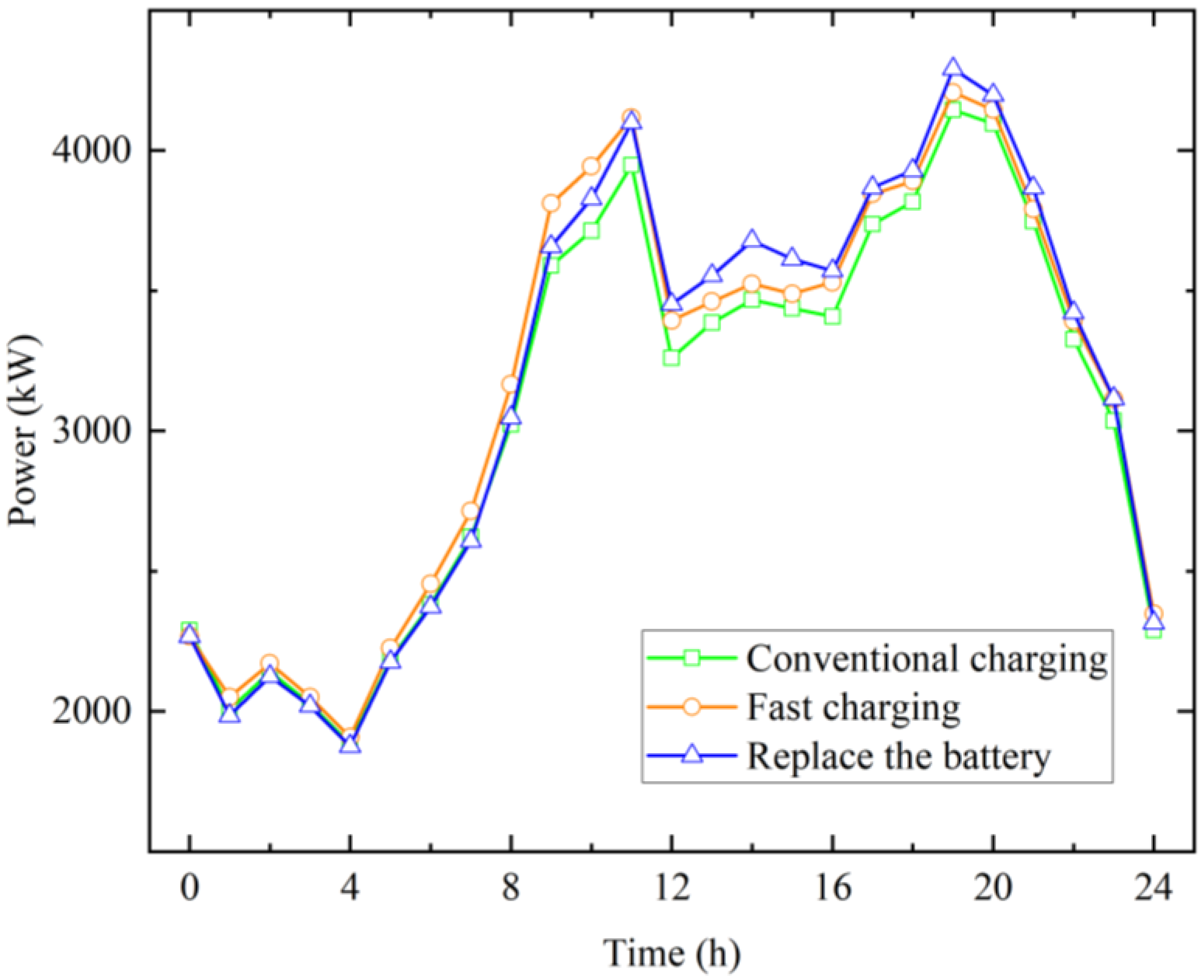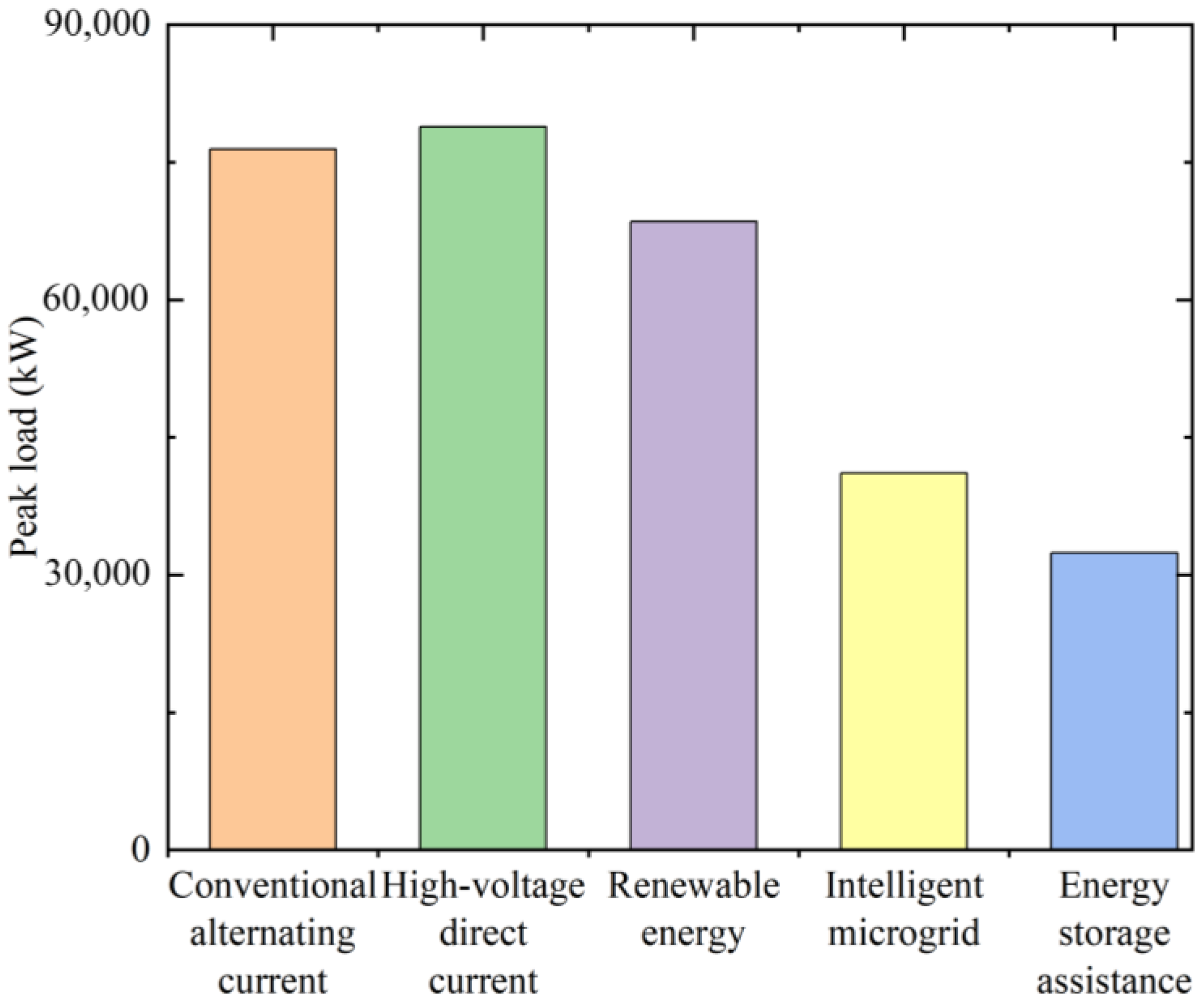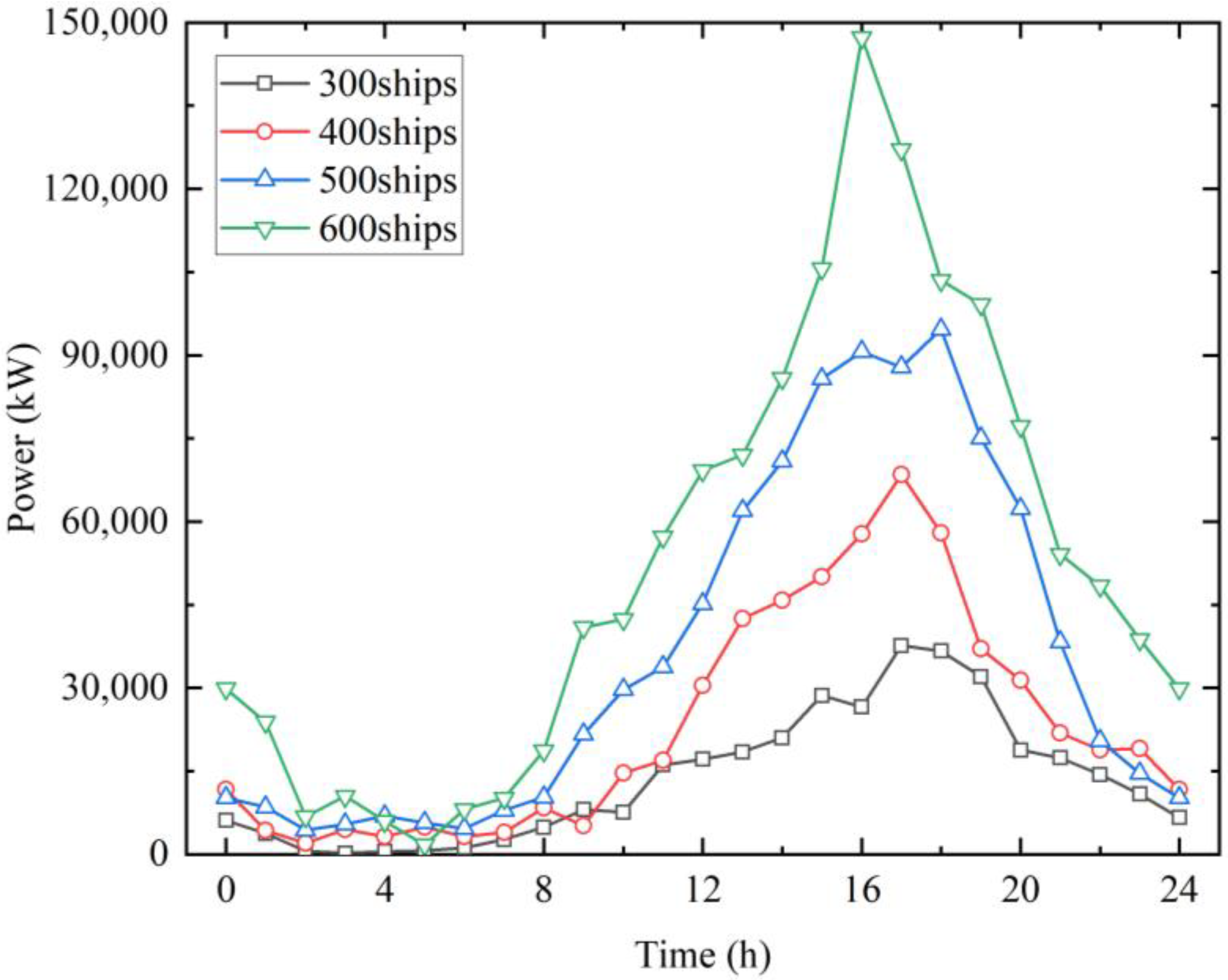 In the scenarios of 500 and 600 vessels, the peak loads reached 67,855.5 kW (at 4 p.m.) and 87,931.8 kW (at 2 p.m.), respectively, which began to have a certain impact on the power grid.