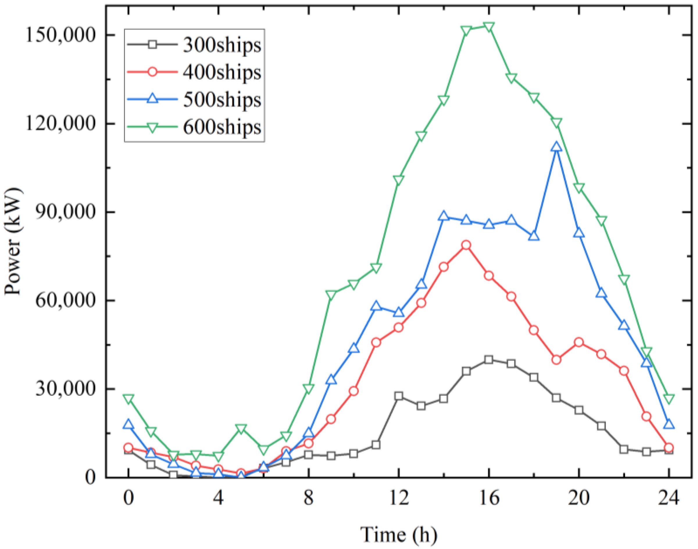 In the scenario of 400 ships, the peak load was 41,079.2 kW (at 17:00), and the impact on the power grid was still relatively small.