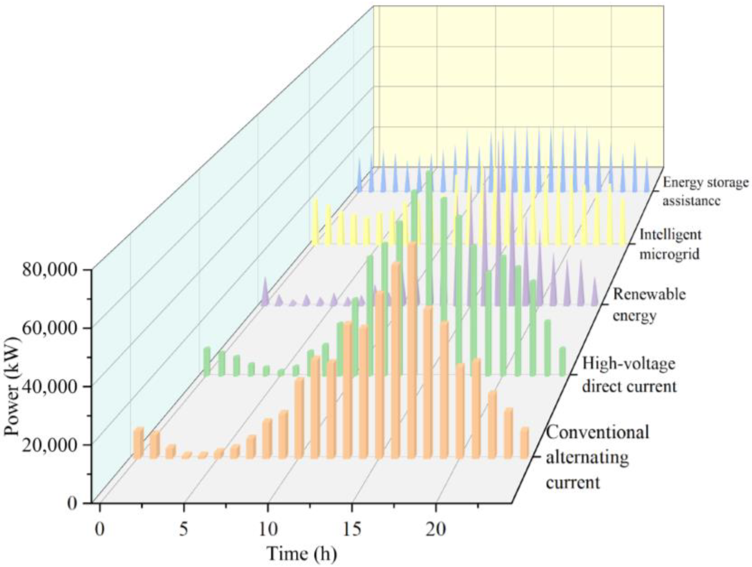 In the simulation of renewable energy shore power, the maximum load of 300 vessels was 37,638.9 kW, and the impact on the shore power grid was relatively small. In the simulations of 400 and 500 vessels, the maximum load reached 68,526.4 kW and 94,690 kW, respectively. At this point, the load had significantly increased and had a certain impact on the grid. Under the simulation of the last 600 ships, the maximum load reached 147,331.8 kW. At this time, the shore power load was the largest, and the impact on the power grid was also the greatest.
