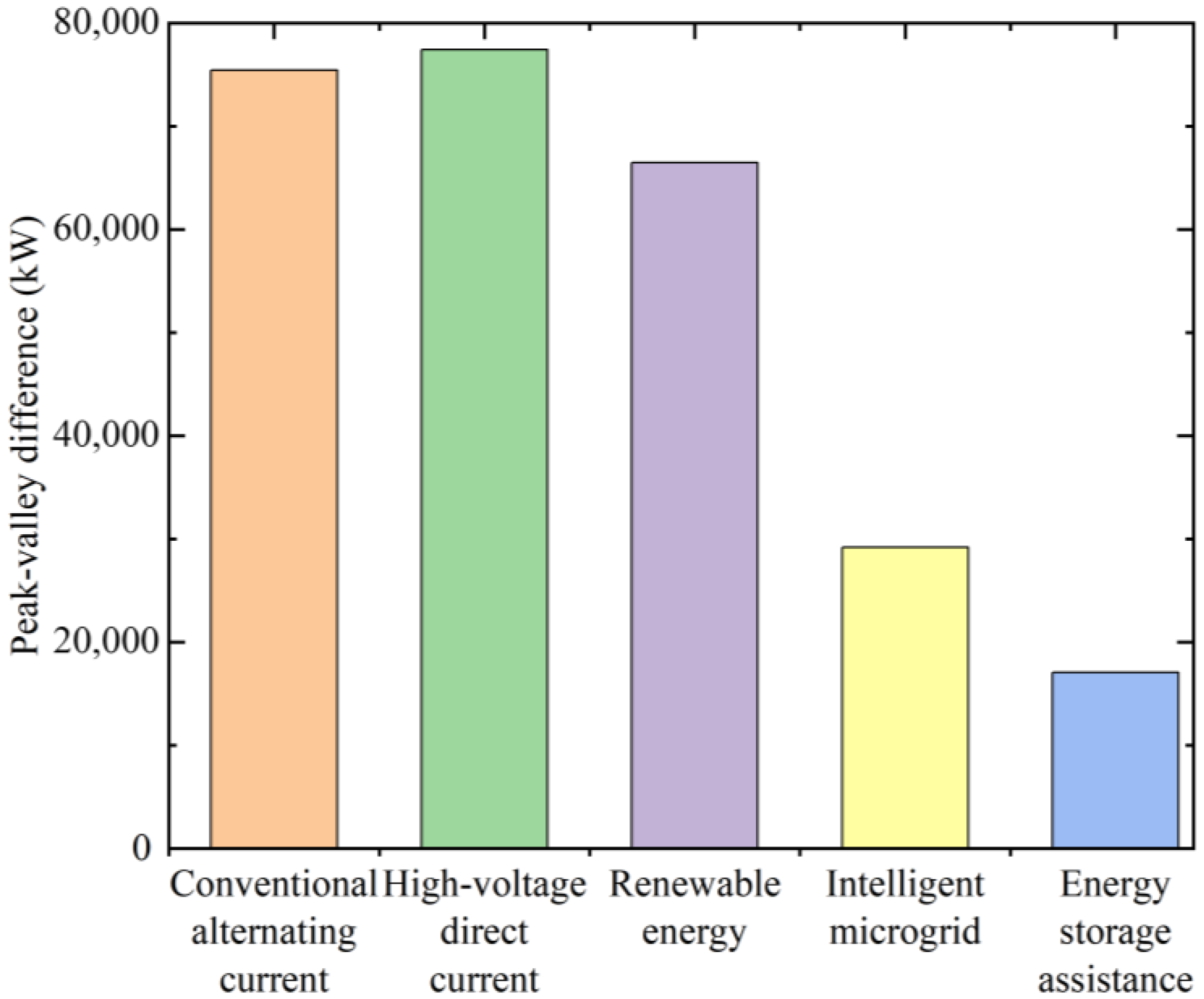 Figure 14 lays out the peak-to-valley differences. Again, high-voltage DC shore power leads at 193.54 kW, followed by conventional AC shore power at 188.57 kW and renewable energy shore power at 166.25 kW. The smart microgrid shore power shows more moderation at 72.94 kW, but the storage-assisted system remains in a league of its own, with a difference of only 32.37 kW. In other words, it does not just reduce the peak—it flattens the curve.
