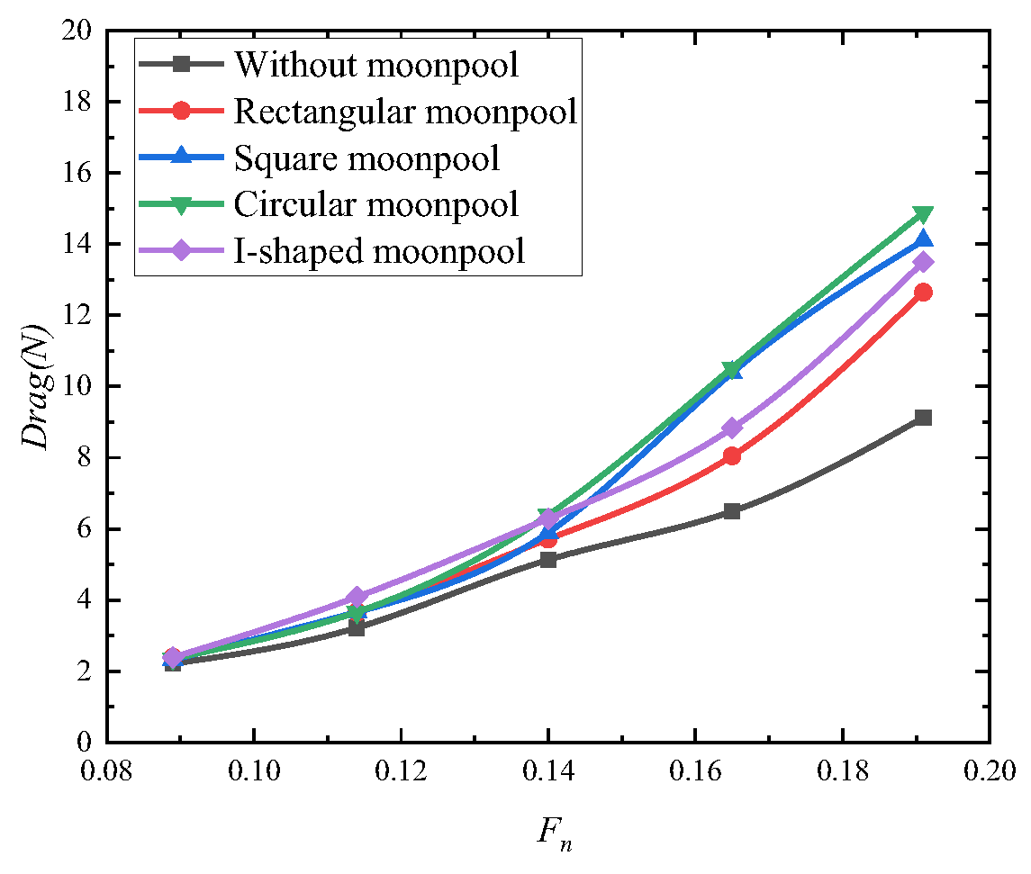 - Duan, F.; Ma, N.; Zhang, L.J.; Cao, K.; Zhang, Q. Study on the influence characteristics of moonpool scale effect on drillship navigation resistance. J. Ship Mech. 2020, 24, 1253–1260. [Google Scholar]