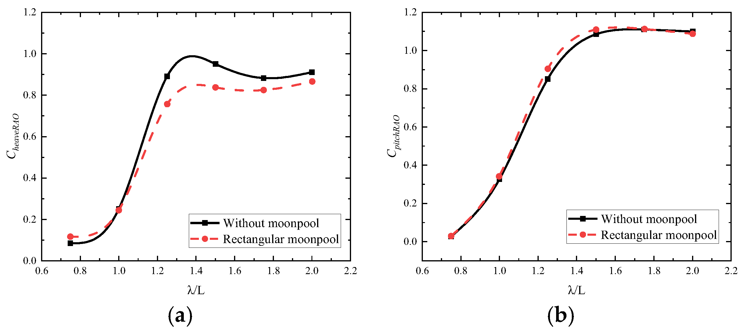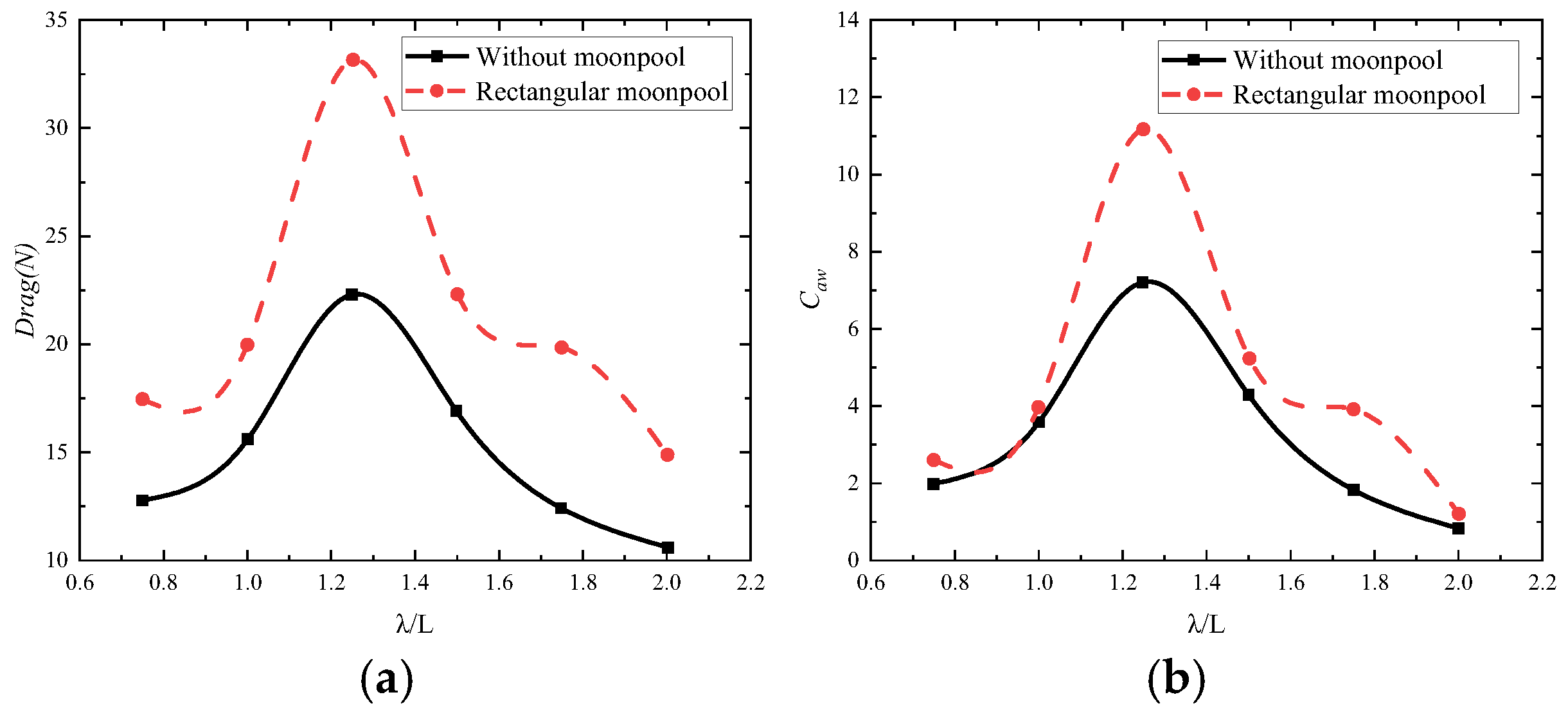- Numerical research is conducted on the hydrodynamic performance of the rectangular-moonpool drillship under regular wave conditions. The results show that the total resistance and wave-added resistance coefficients for the drillships with and without a moonpool exhibit consistent trends. As the wavelength-to-ship-length ratio increases, their values first increase and then decrease. The presence of the moonpool leads to an increase in the total resistance of the drillship, with a relatively significant impact on hull heave motion and a smaller effect on pitch motion.