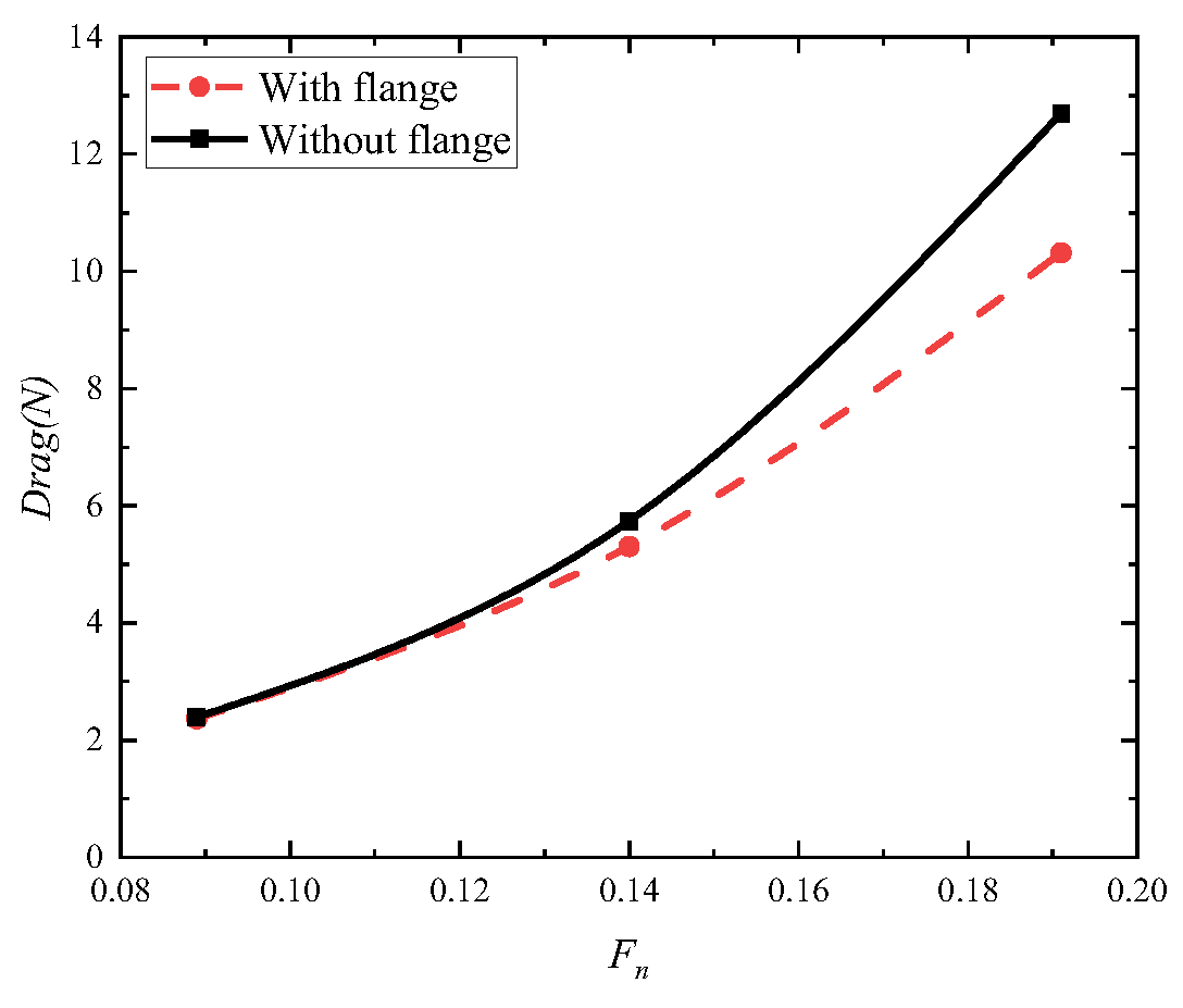 6.3. Comparative Analysis of Resistance Performance with and Without Flange During Calm Water Navigation