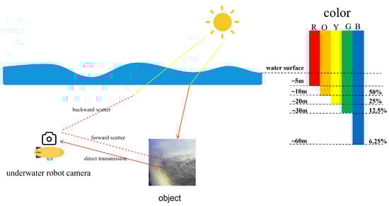 Underwater imaging is a fundamental technology in marine exploration and resource development [1]. Its primary value lies in acquiring high-resolution and visually interpretable underwater information, which provides an essential foundation for tasks such as underwater target recognition [2], environmental perception, ecological monitoring, and resource investigation. However, the quality of underwater optical images is inherently constrained by the physical characteristics of light propagation in water. Wavelength-dependent absorption causes rapid attenuation of red light, while forward and backward scattering blur image details and reduce contrast, as illustrated in Figure 1 [3]. With the advancement of marine sensing and imaging technologies, underwater image acquisition techniques have undergone substantial improvements [4]. In particular, underwater robotic platforms, especially low-cost micro-sized underwater vehicles [4], have become crucial carriers for image acquisition and environmental interaction. These platforms help mitigate challenges traditionally associated with underwater imaging, including operational complexity, high risk, and elevated deployment costs [5]. They have been successfully deployed in diverse applications such as offshore oil and gas exploration, marine scientific research, underwater archaeology, and aquaculture monitoring [1,6].