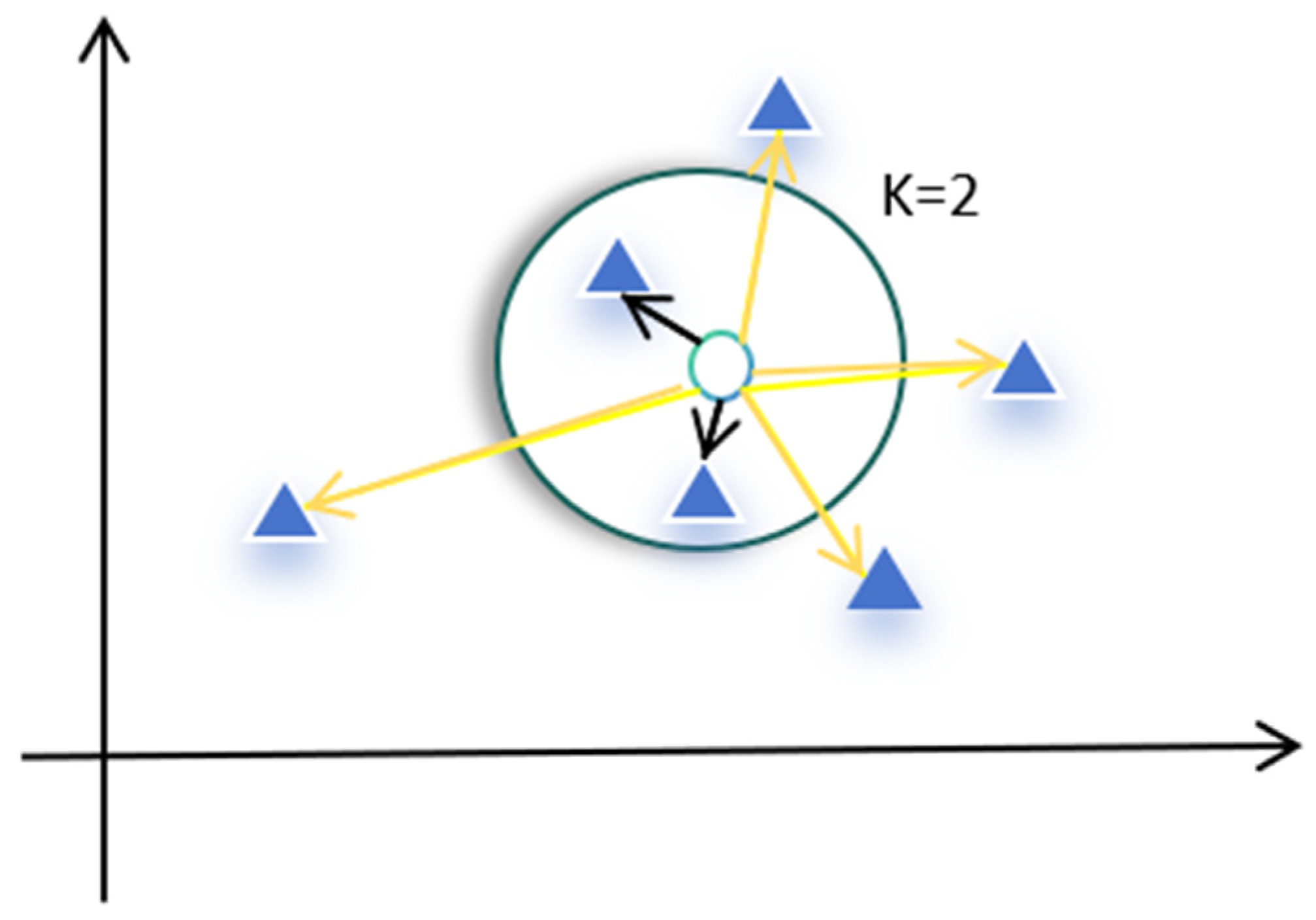 The blue circle represents a new sample awaiting classification. Assuming K = 2, the KNN algorithm computes the distances between this sample and all other samples in the feature space. These distances are then sorted, and the two nearest neighbors—indicated by the samples within the green solid-line circle in the figure—are identified. The class of the new sample is subsequently determined based on the labels of these two nearest neighbors. As illustrated, the choice of K and the selection of an appropriate distance metric are critical for the algorithm’s performance [23,25].