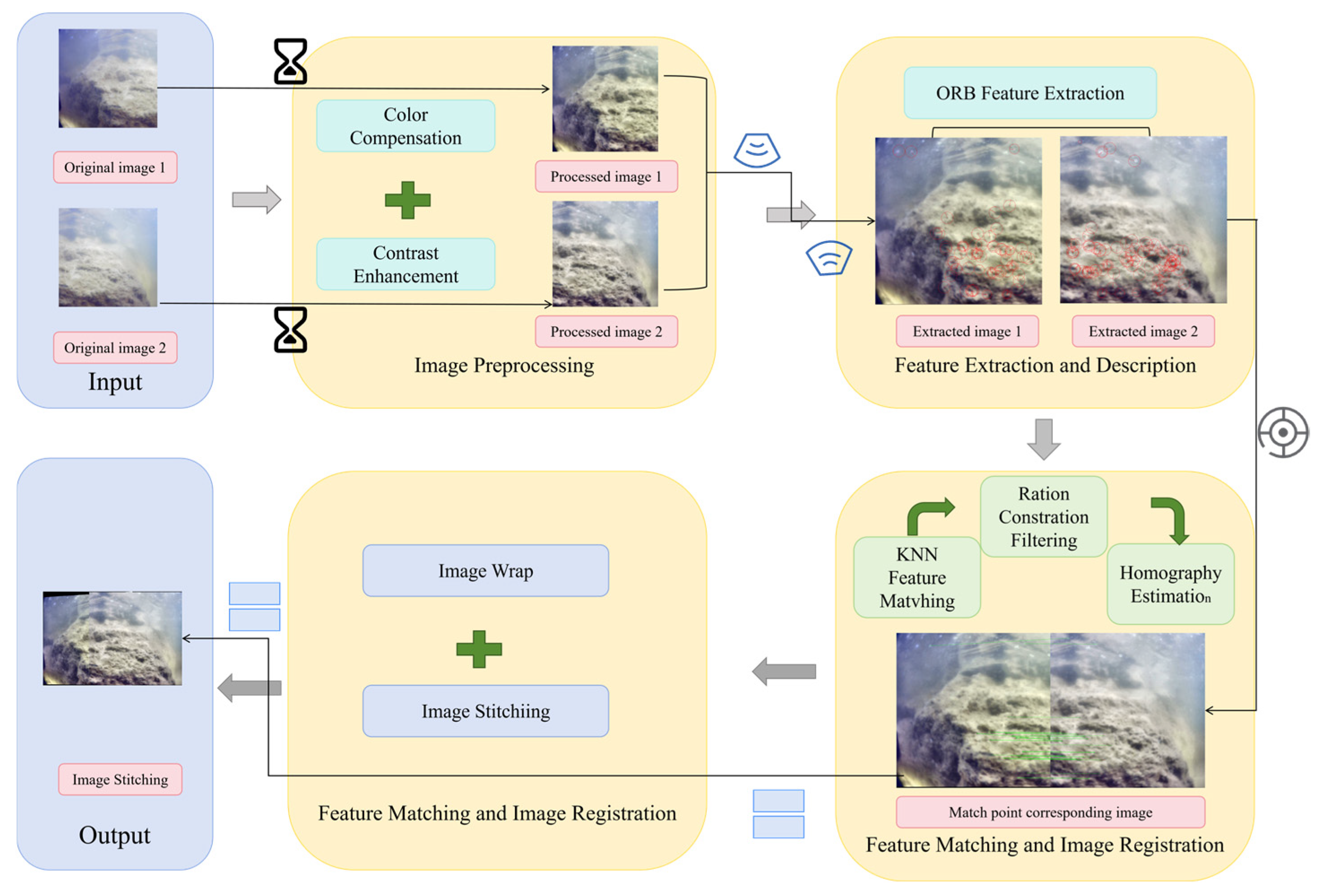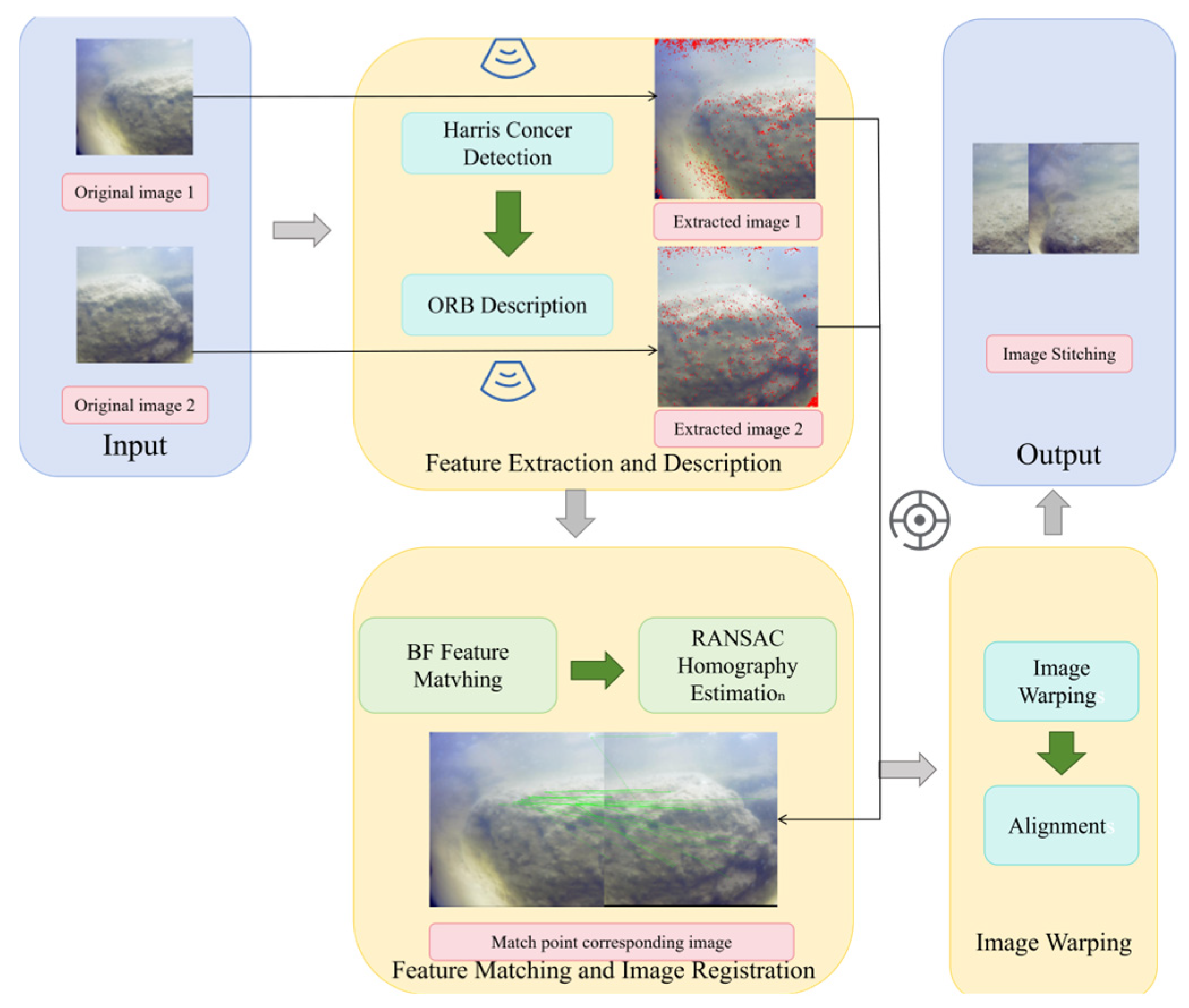To achieve this objective while ensuring geometric consistency and stability throughout the stitching process, several challenges must be addressed. Due to the unique characteristics of underwater environments, input images often suffer from low contrast, uneven illumination, weak texture details, and severe color distortion. Furthermore, the limited computational resources of underwater robotic platforms, together with stringent real-time requirements, impose additional constraints on image stitching algorithms. Under such conditions, conventional approaches are prone to insufficient feature extraction, inaccurate feature matching, high mismatching rates, unreliable homography estimation, and unstable feature point detection.