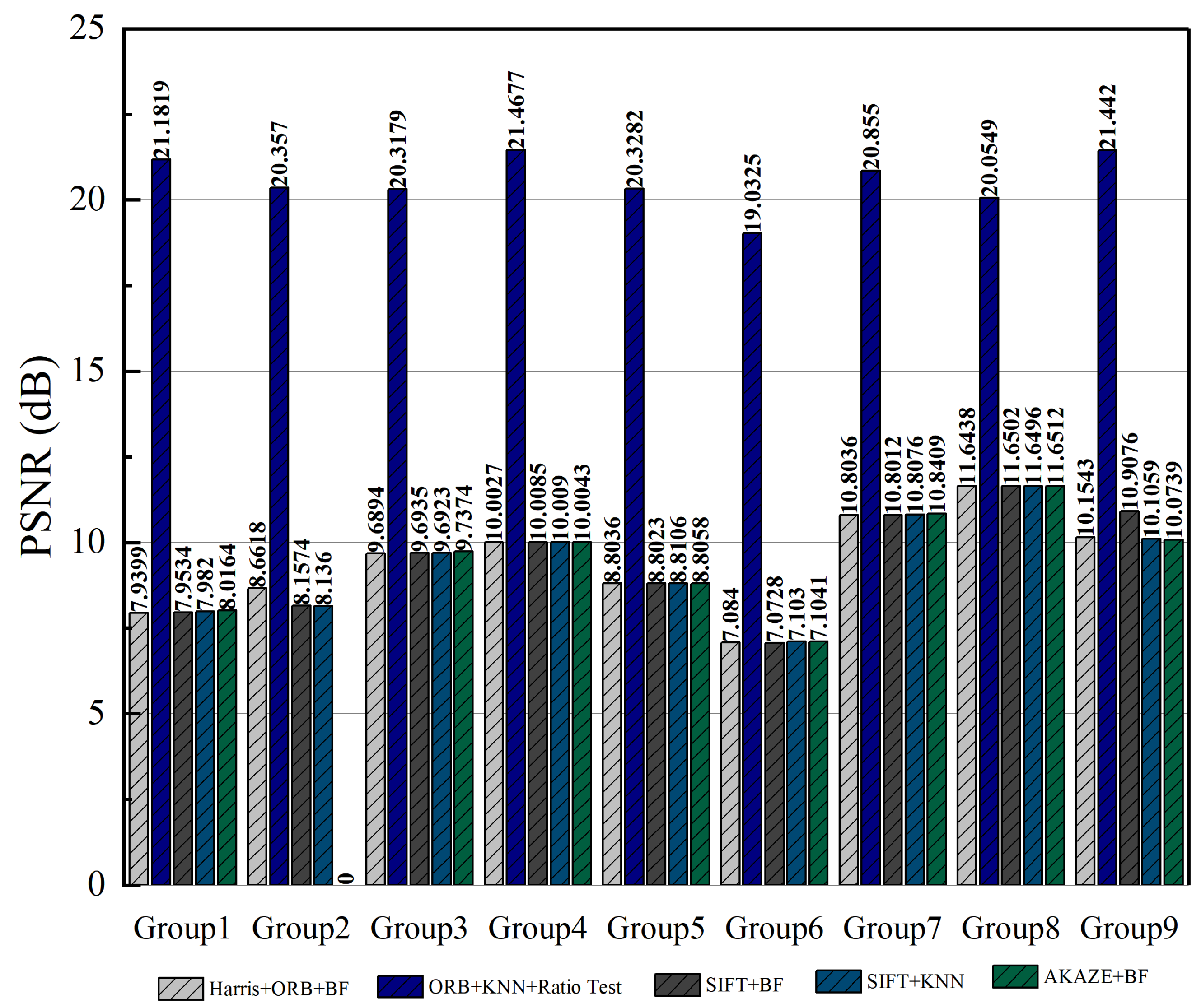 Group NumberAlgorithmSSIMPSNRTime