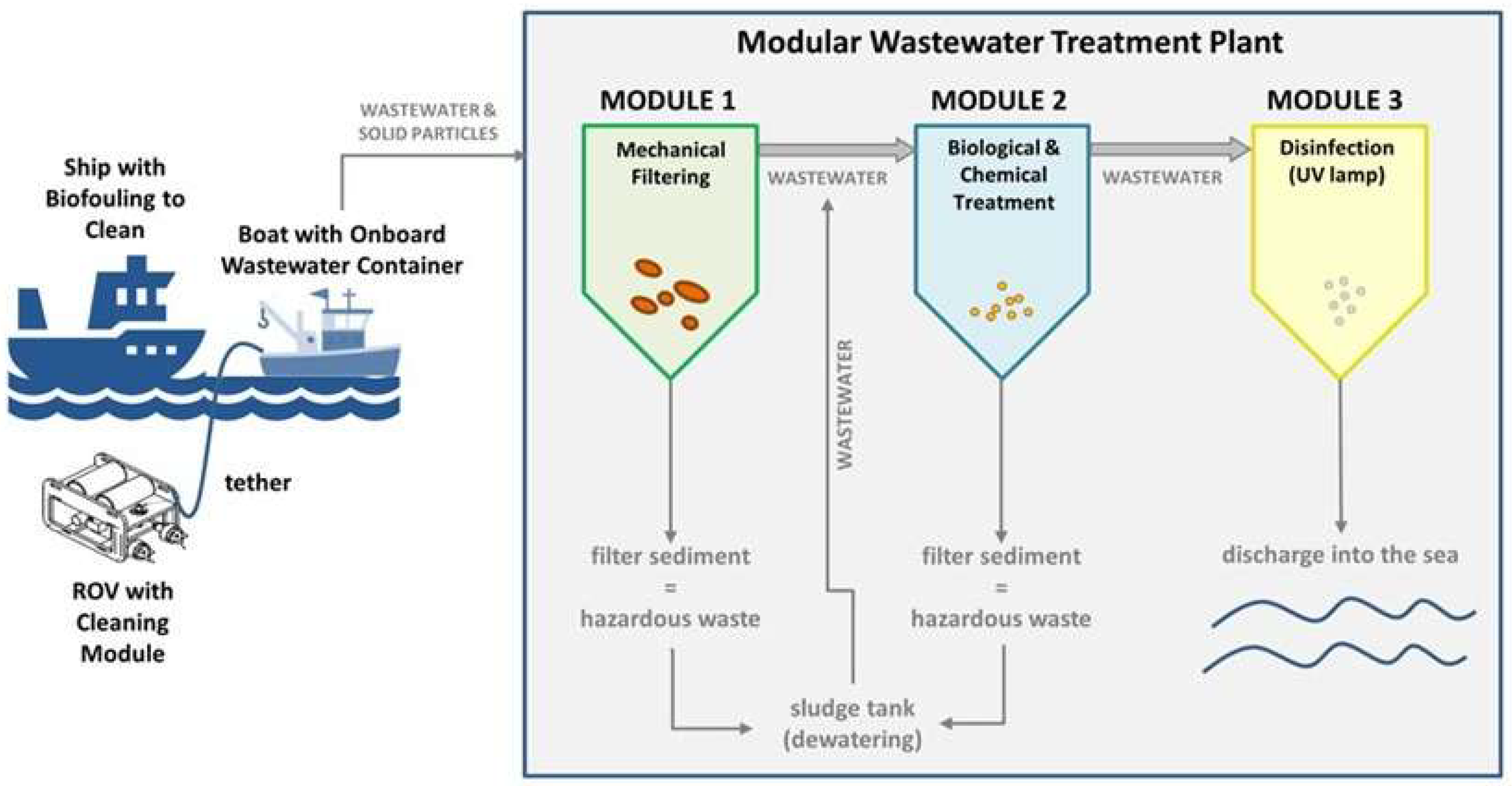- A container-based modular wastewater treatment plant located on a nearby shore or vessel, large enough to hold a small container and supply electric power for the entire cleaning system.