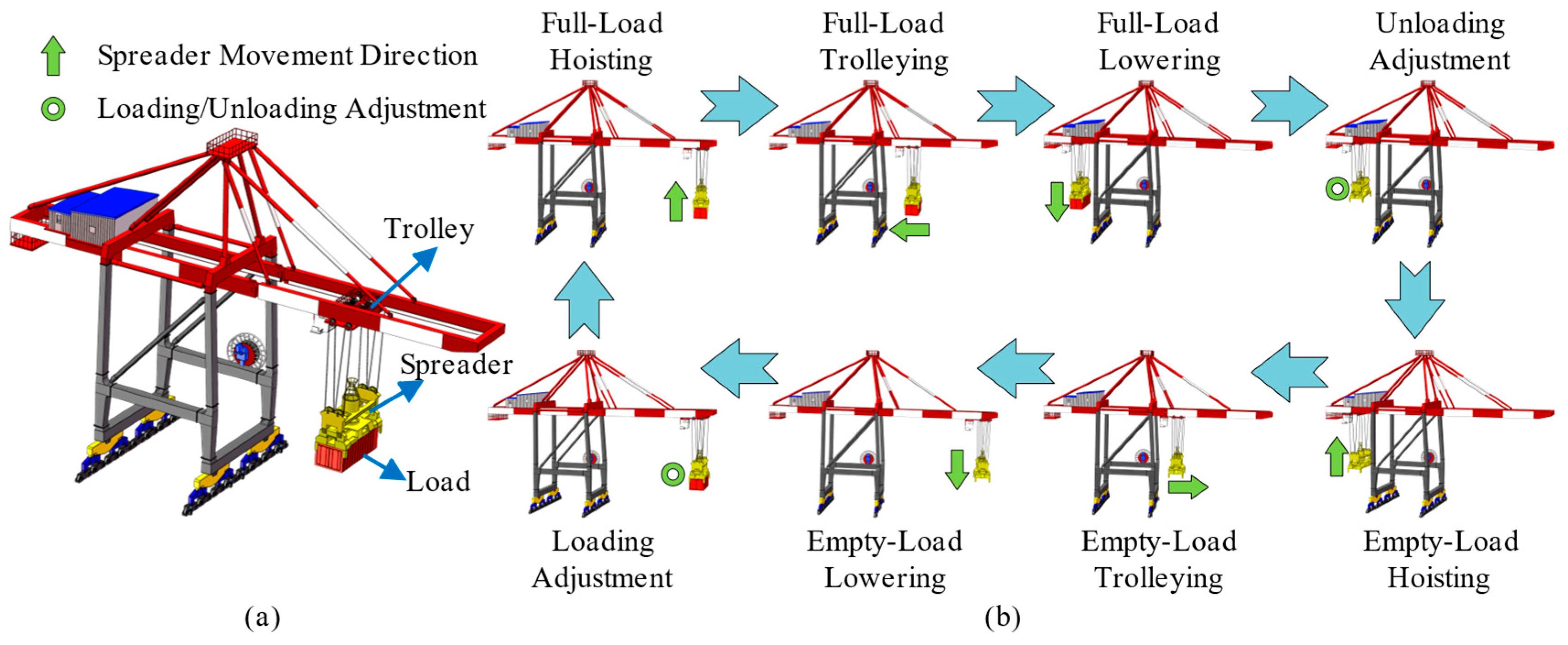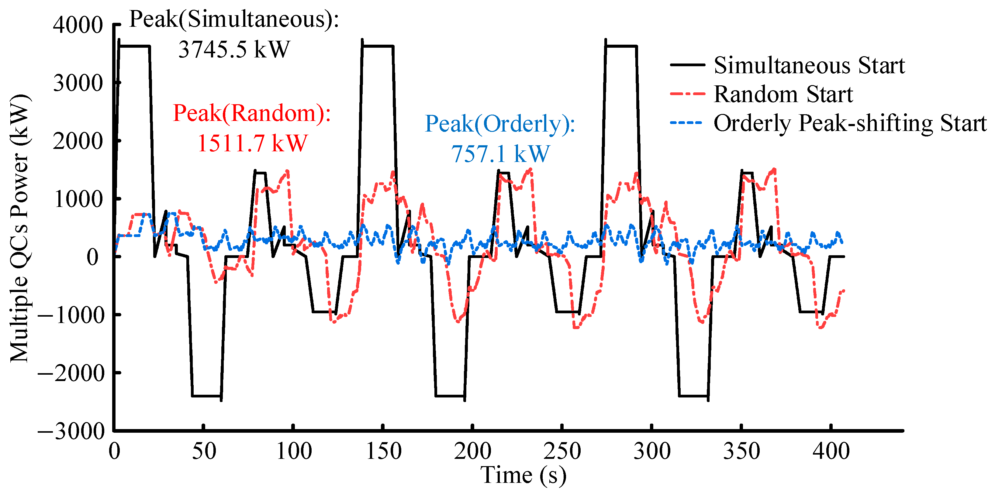 - Constant QC efficiency: Any potential decrease in QC operational efficiency due to the peak-shifting schedule is disregarded. This is because start-up delays are inherent even in the uncoordinated operational state of the QC cluster. The peak-shifting strategy only adjusts the relative start times among QCs within an operational cycle. The imposed delay is in seconds and is small compared with the cargo handling duration measured in hours.