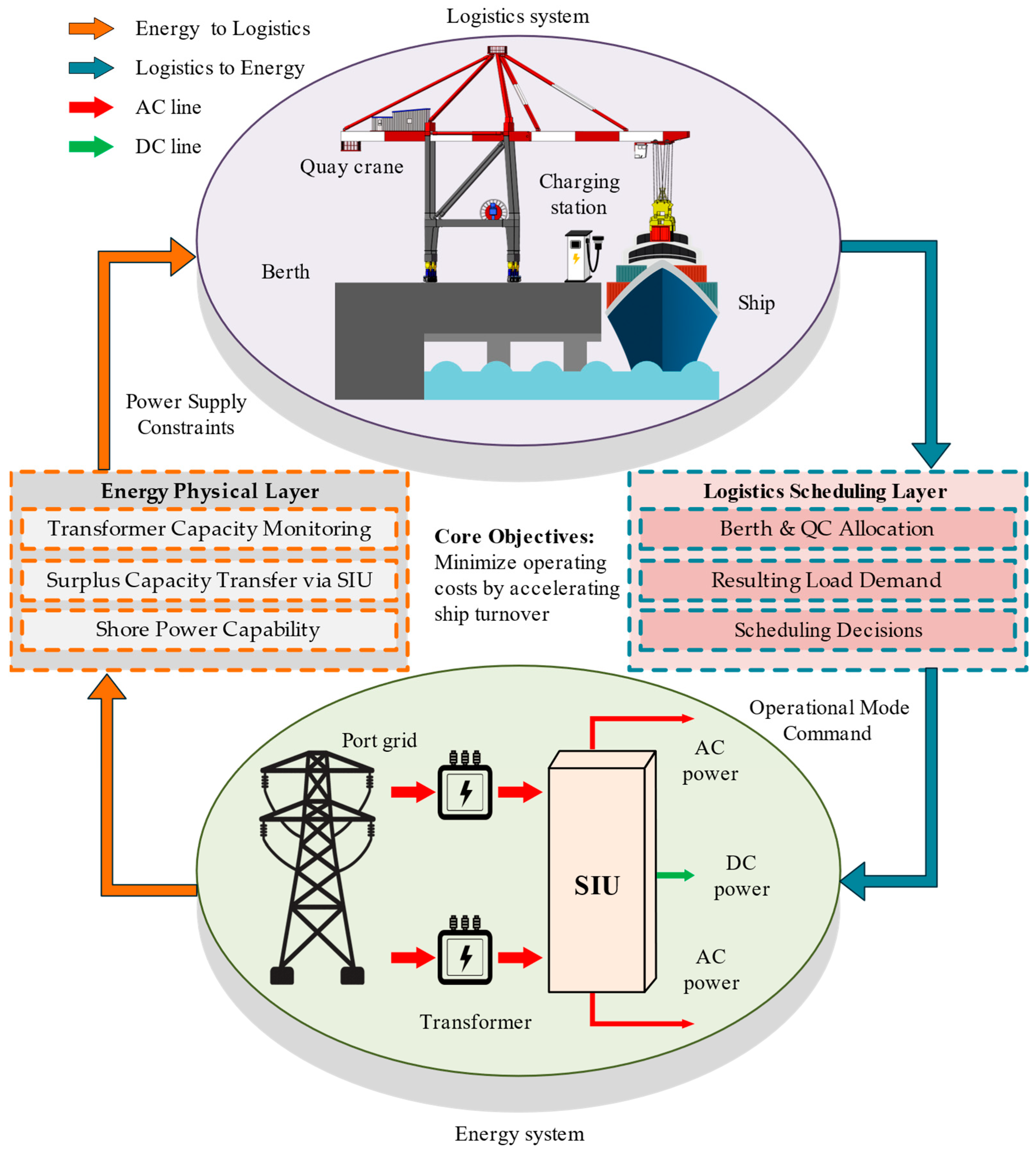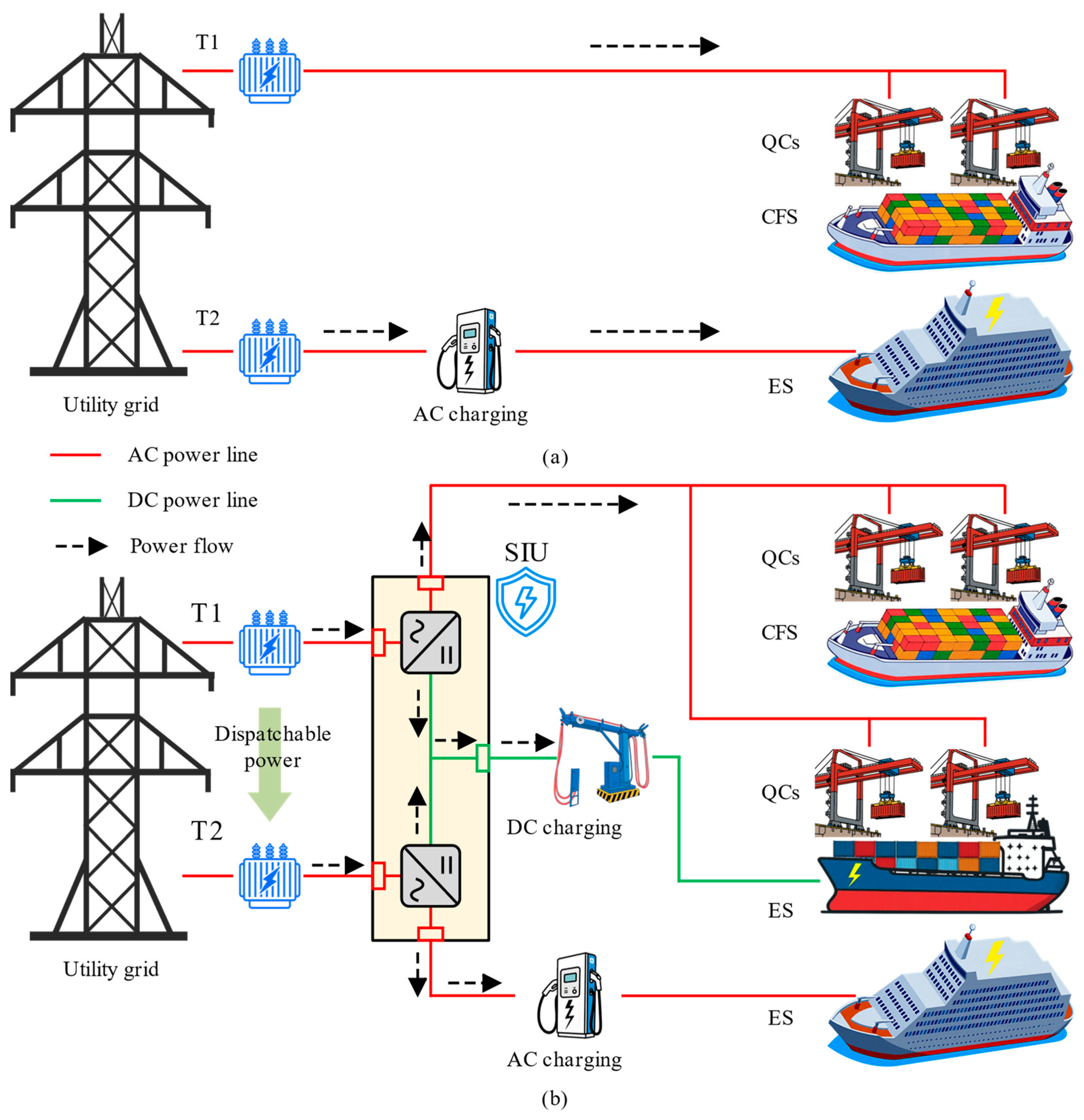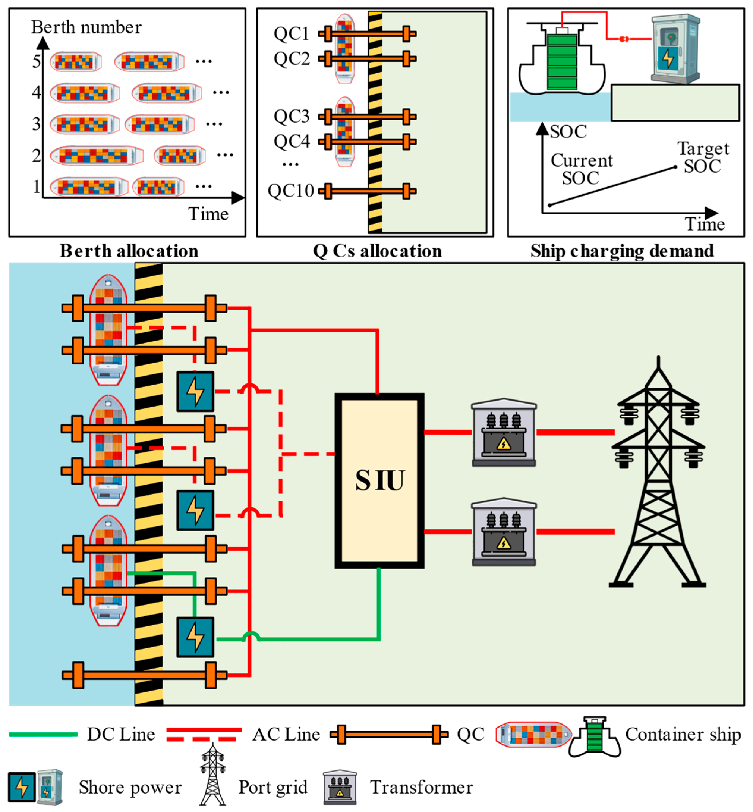 - A novel flexible interconnection architecture: A hybrid AC/DC ship–shore interconnection architecture based on a flexible interlinking device is proposed. This architecture is designed to dismantle the barriers of conventional power supply systems, establishing a physical pathway for the efficient transfer of power capacity released from the QC side to the charging facilities.