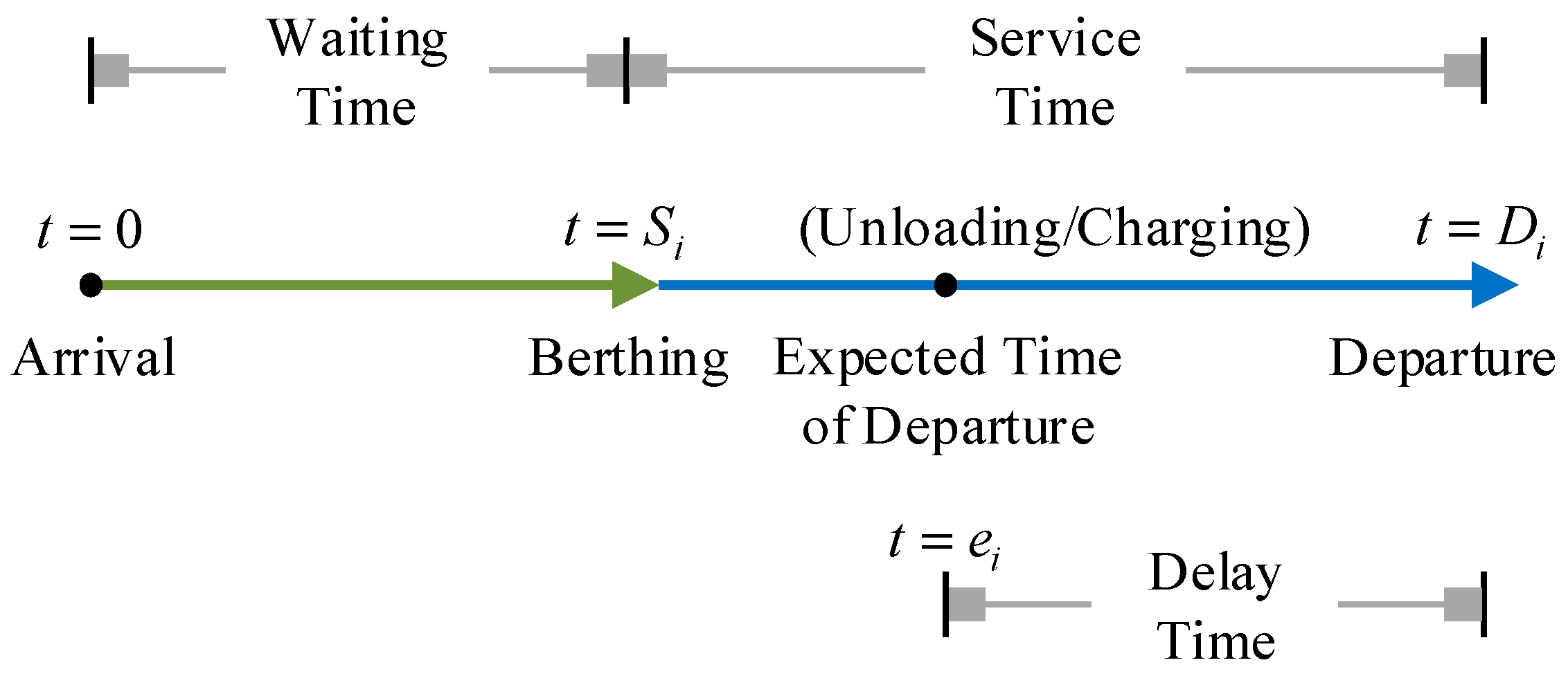 - Delay time: This is the period by which a ship’s actual departure time () exceeds its expected departure time (). This triggers a punitive delay cost, which is also borne by the port operator.