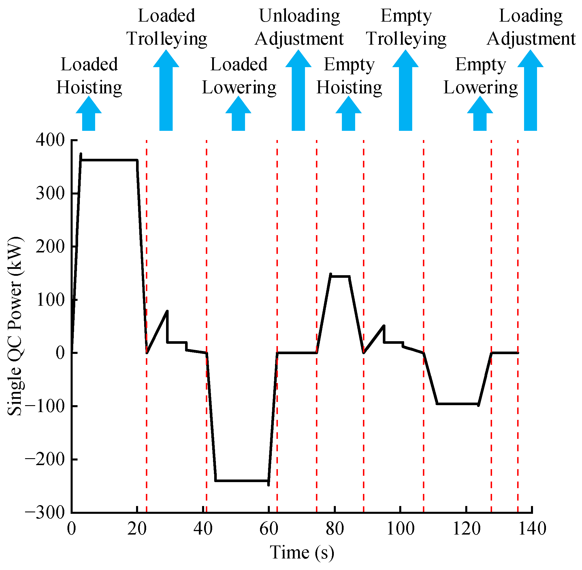 | QC equipment and cycle parameters | Table 4, Figure 6 | Obtained from equipment specifications [34,41] and field survey records of a container terminal. Used to compute the single-QC power-time curve and the aggregated QC cluster power. |