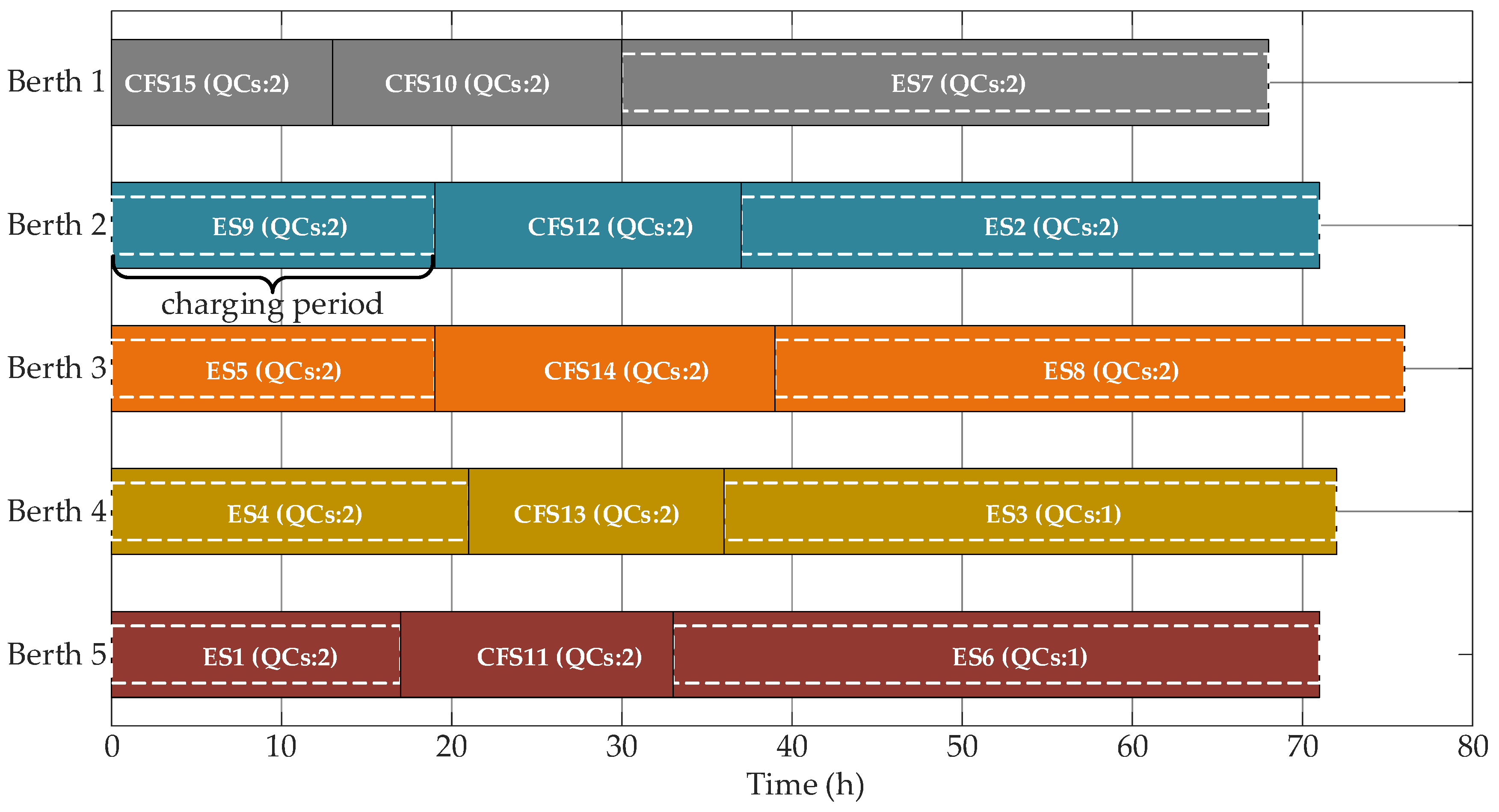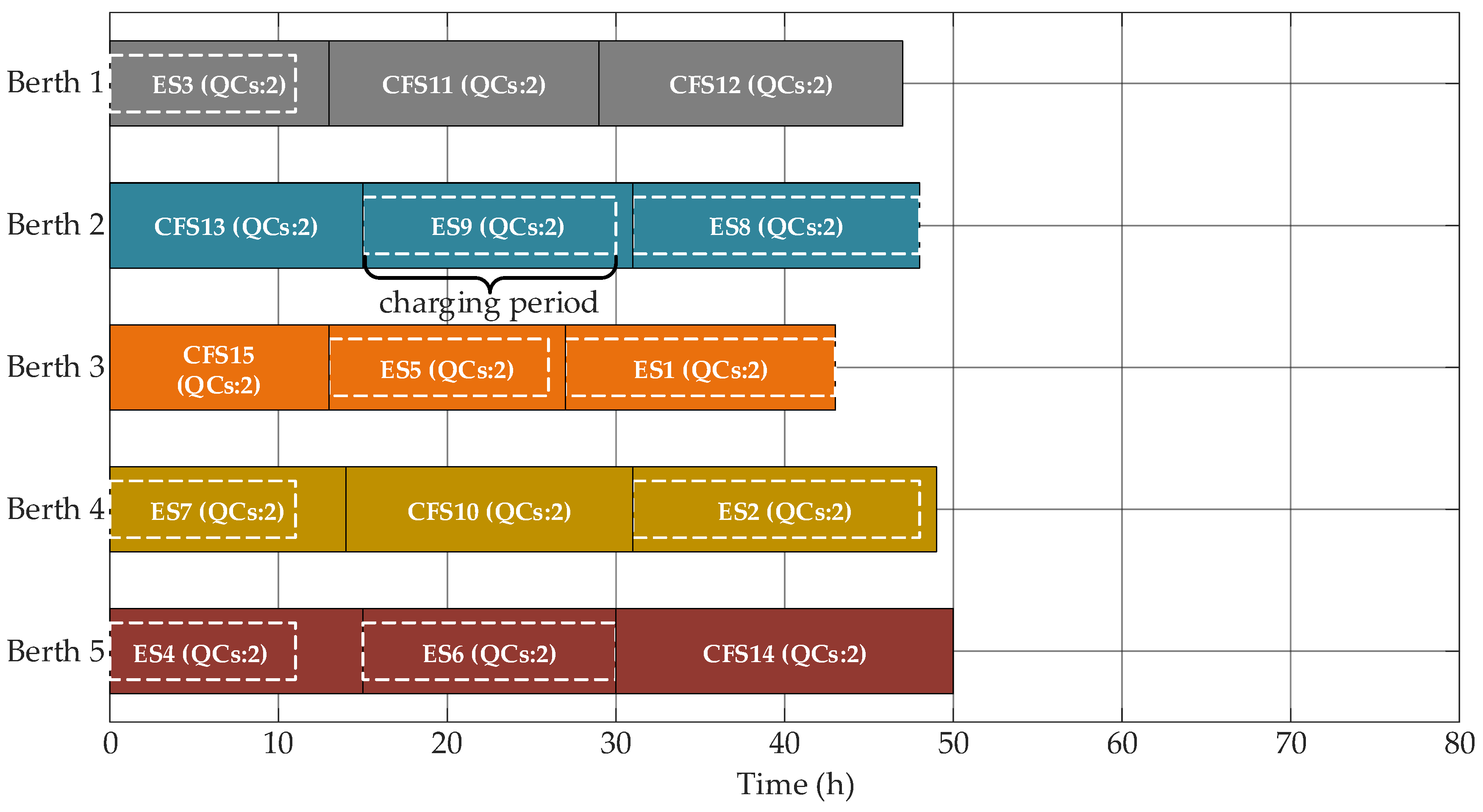 - No breakdowns: All equipment, including berths, QCs, and charging facilities, is assumed to be fully available and free from any maintenance or breakdowns throughout the planning horizon.